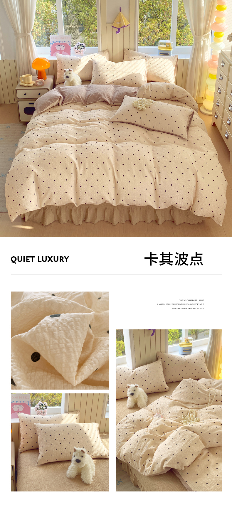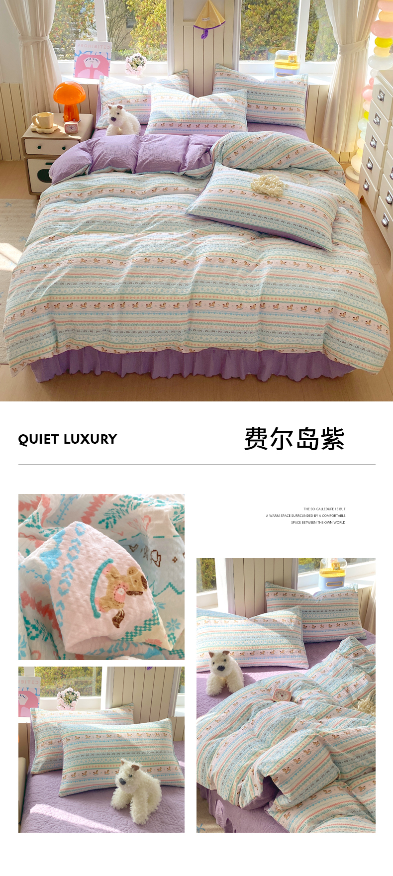 (总)莱米家纺 2026新款云感泡泡纱双层纱床盖四件套,海底星星,费尔岛红,费尔岛咖,费尔岛紫,卡其波点,绿花枝叶,绿樱桃,兔兔之家,星星人,紫色爱心,棕蝴蝶结