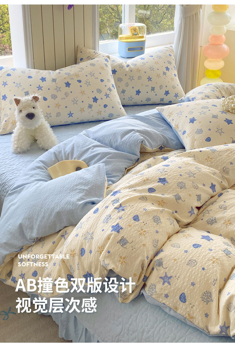 (总)莱米家纺 2026新款云感泡泡纱双层纱床盖四件套,海底星星,费尔岛红,费尔岛咖,费尔岛紫,卡其波点,绿花枝叶,绿樱桃,兔兔之家,星星人,紫色爱心,棕蝴蝶结
