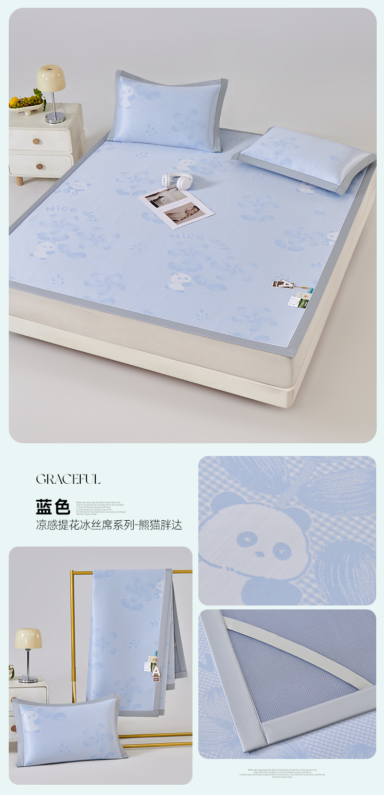 (总)小牛席业 2026新款胖达凉感提花冰丝席席子凉席-床笠款,粉色,灰色,蓝色,香槟