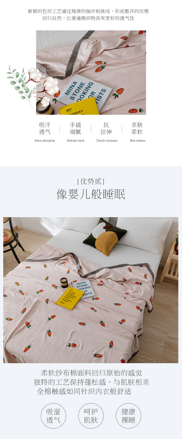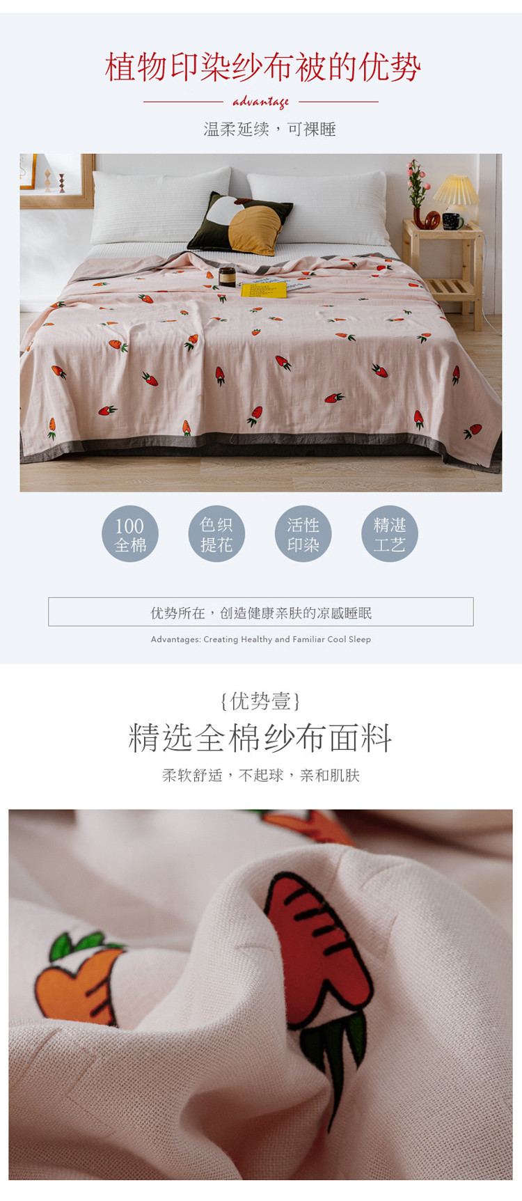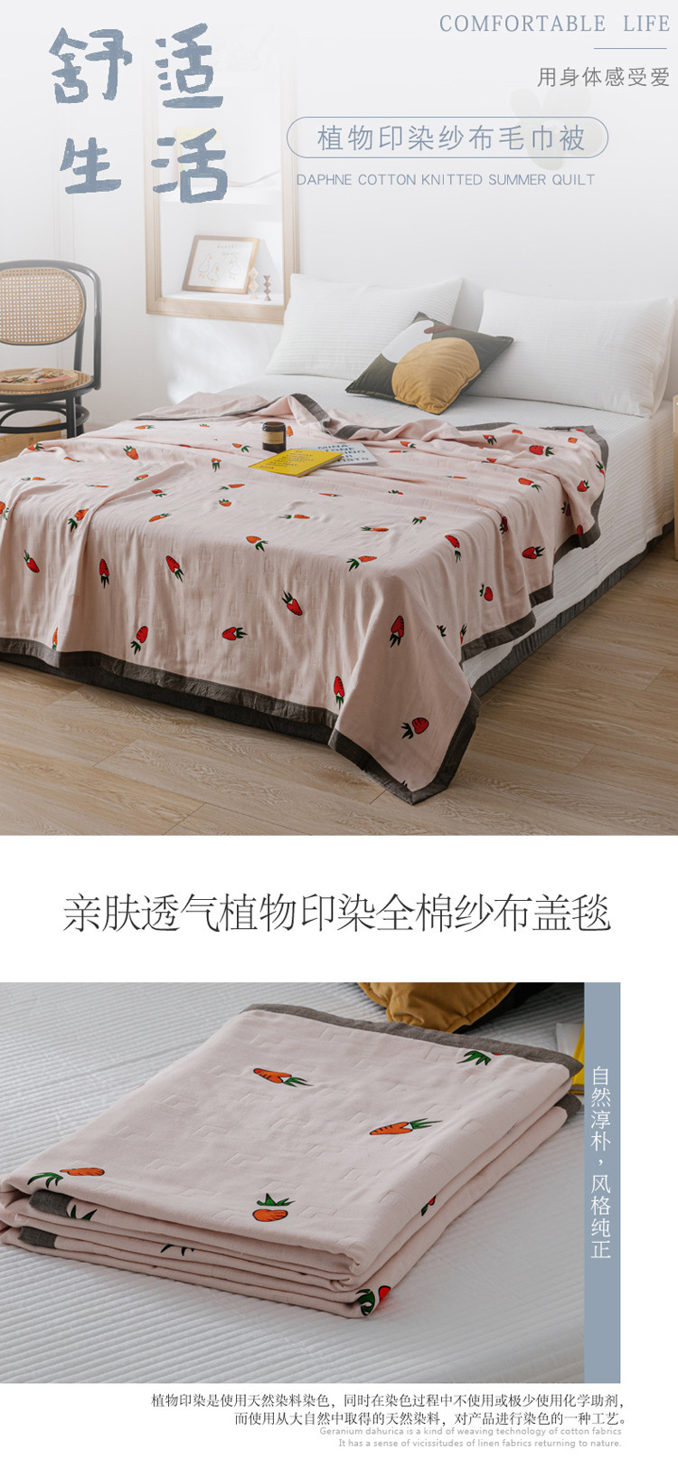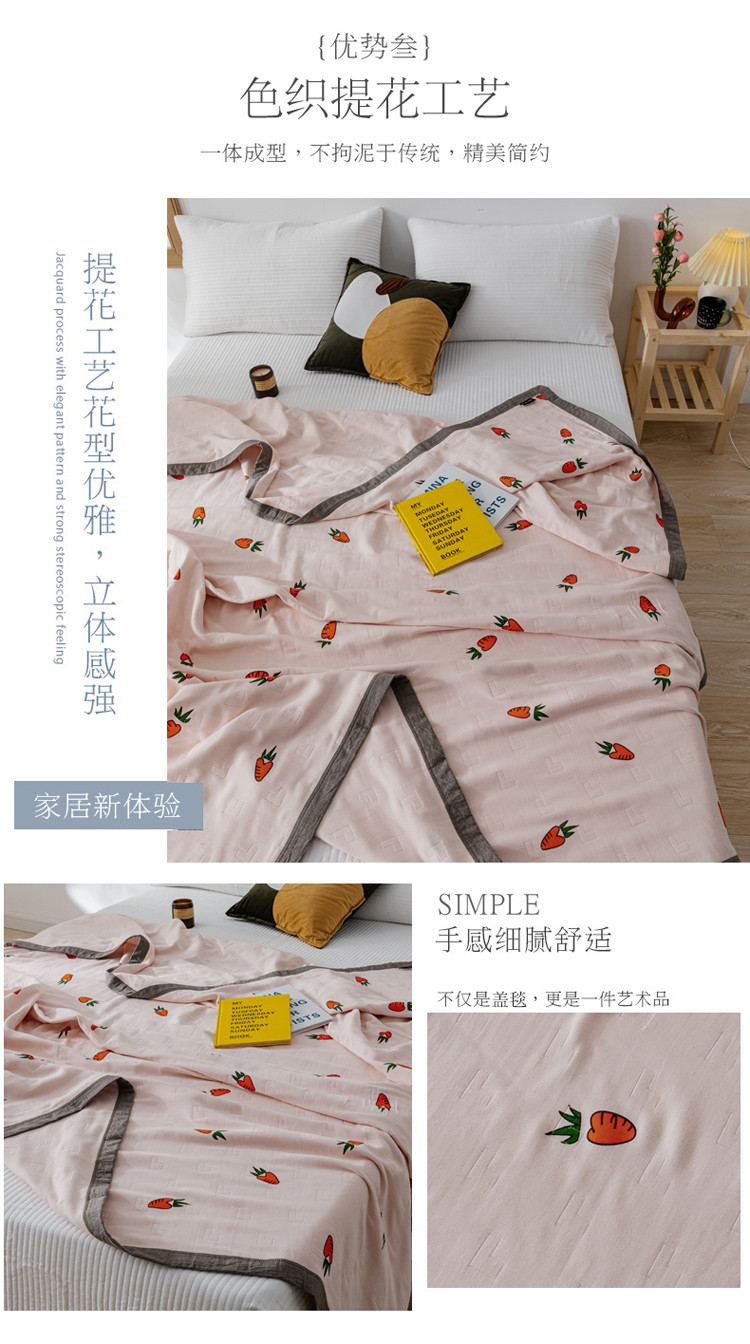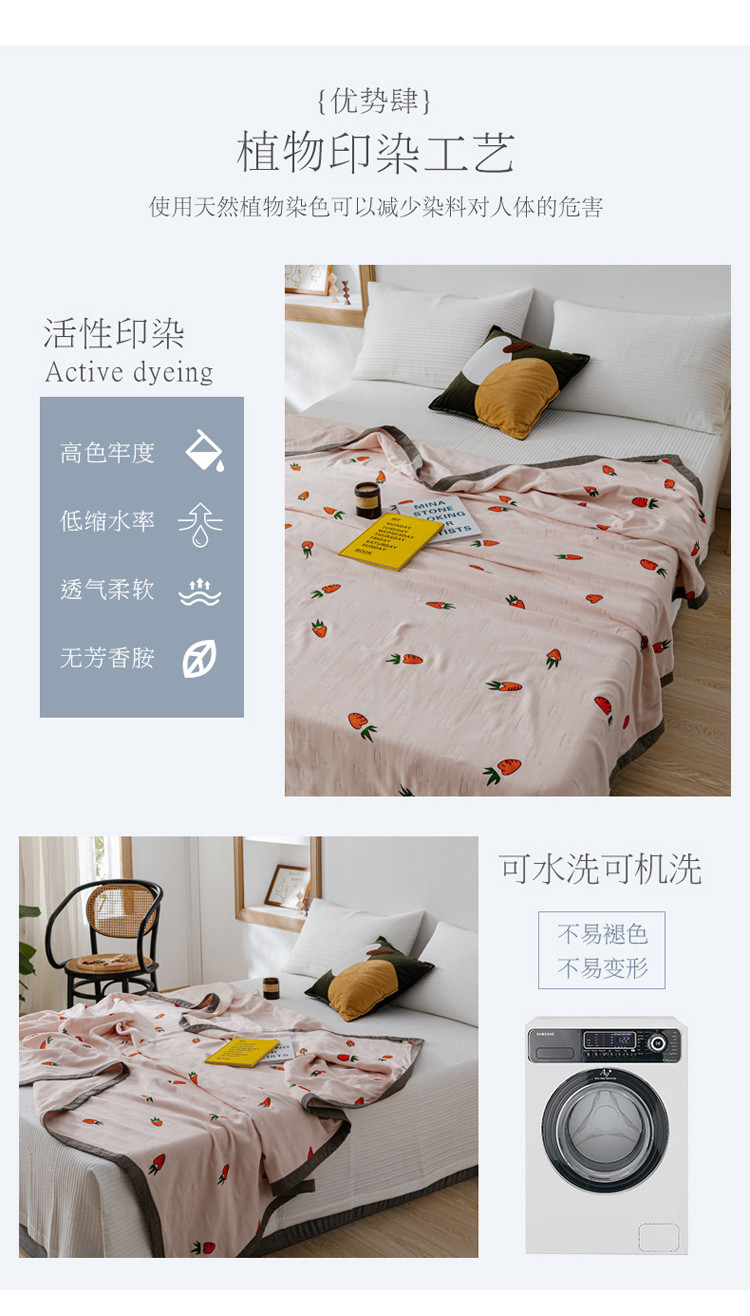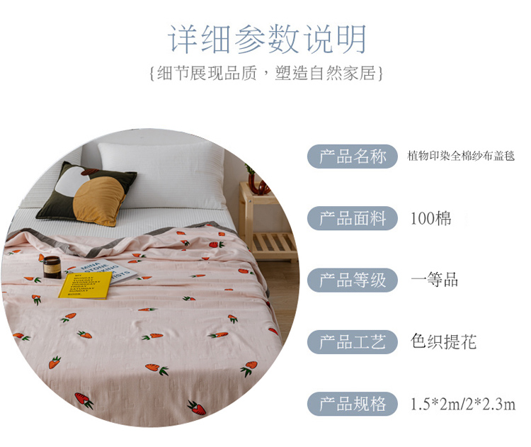 商品名称:朴尔植物印染全棉纱布毛巾被可机洗床单双人休闲盖毯夏被胡萝卜粉