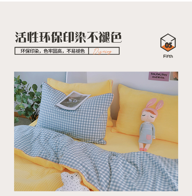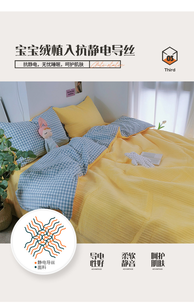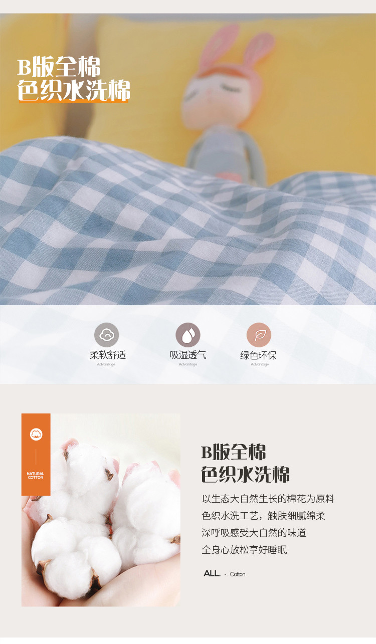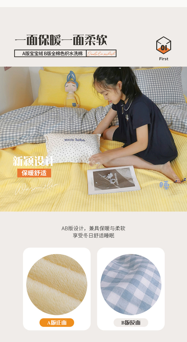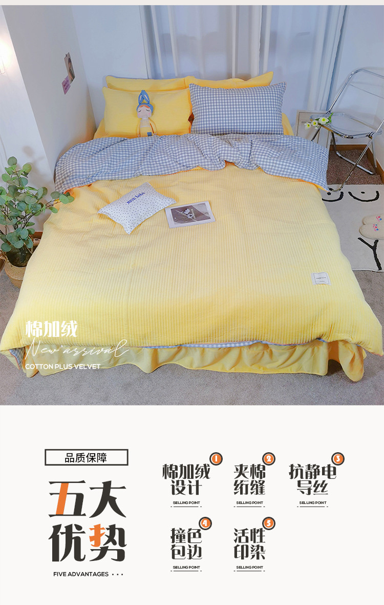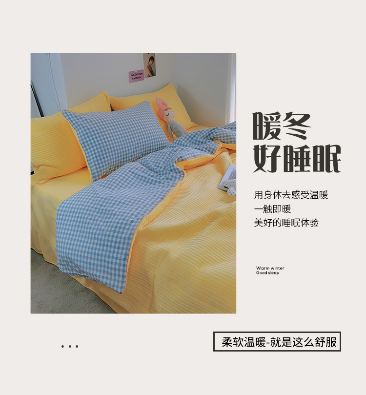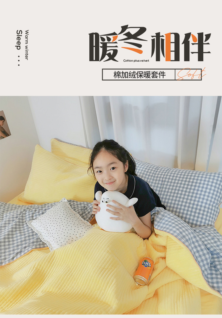商品名称:淑女公社 2020新款棉加绒晚安宝贝四件套 蓝白格加黄色绒