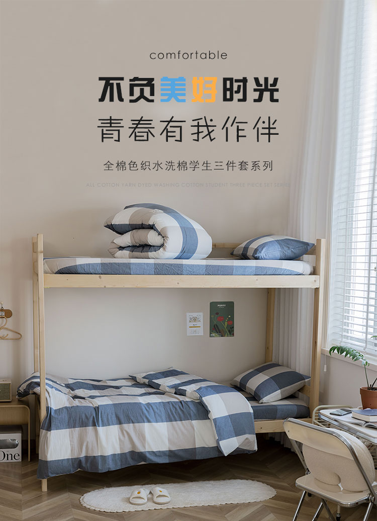 寐眠 2021新款全棉水洗棉无印学生三件套四件套 蓝大格