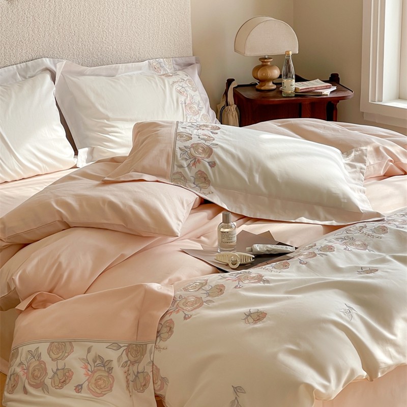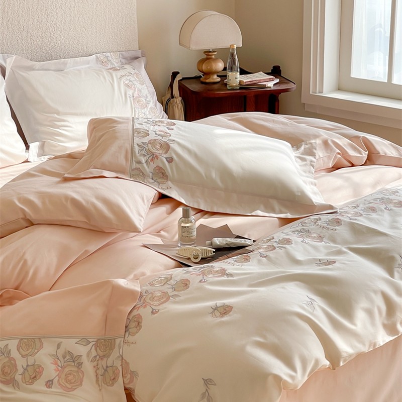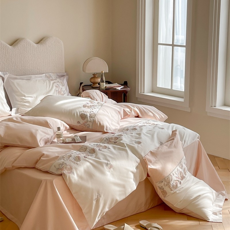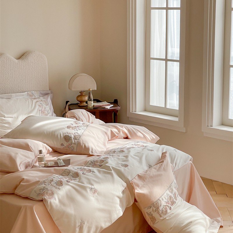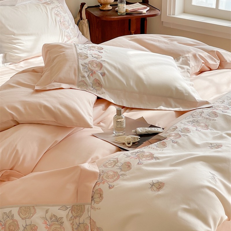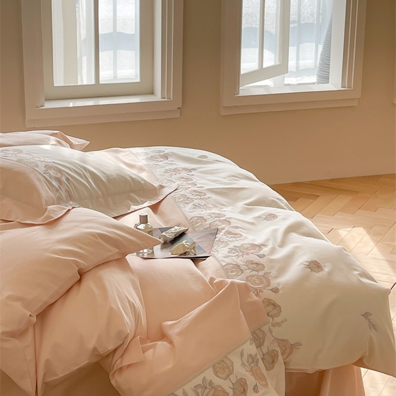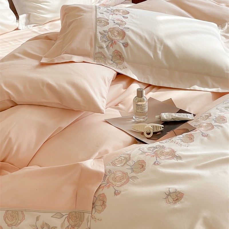 (总)鹿班 2024新款100支长绒棉精致刺绣四件套-情迷莫斯科 标准会员-20,情迷莫斯科-粉色,情迷莫斯科-黄柚色
