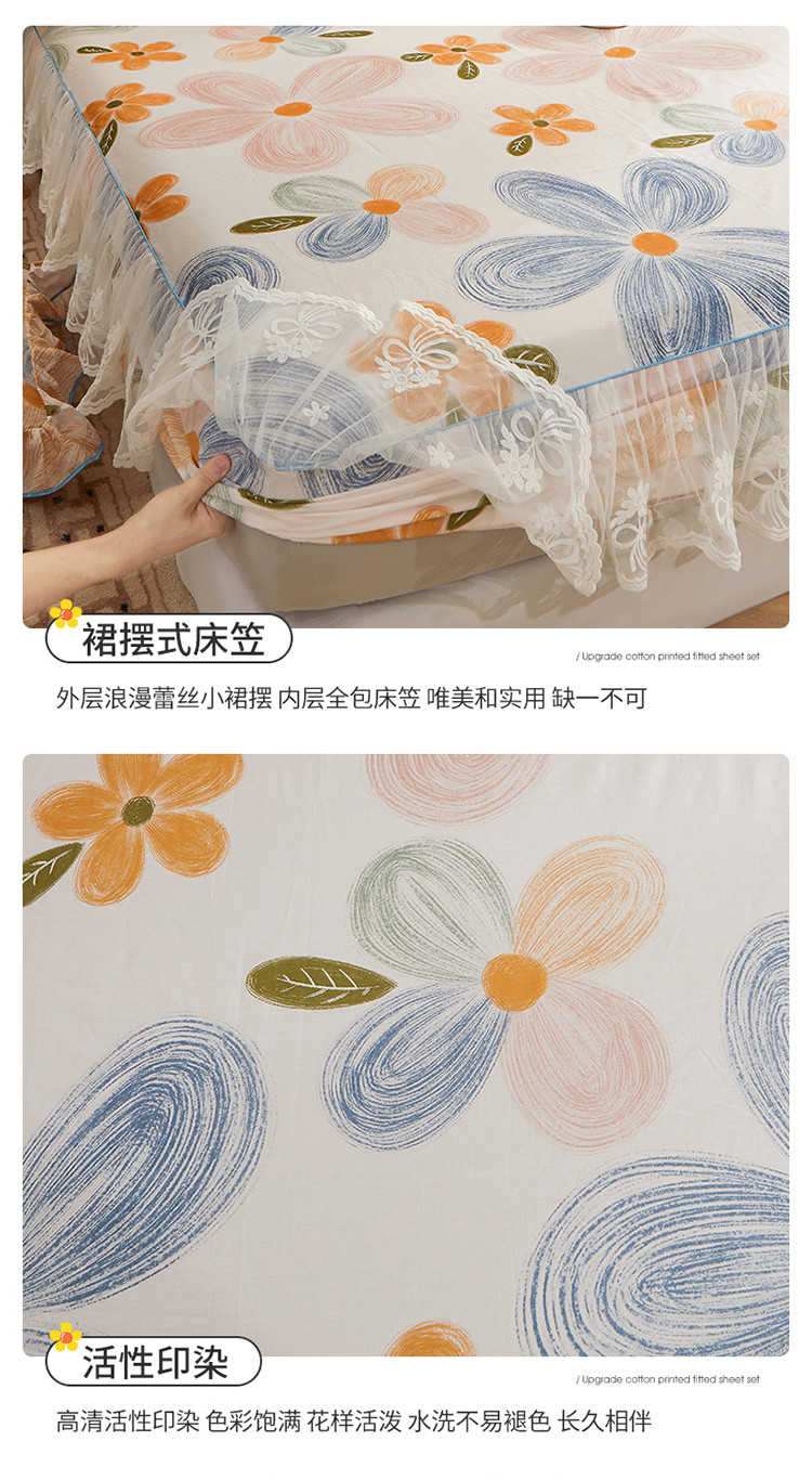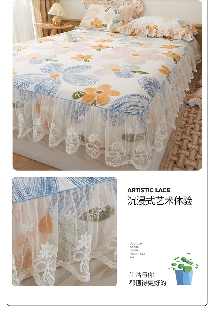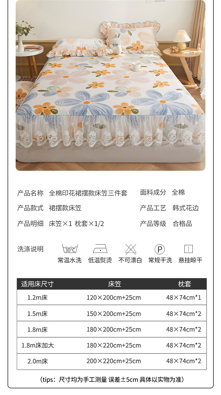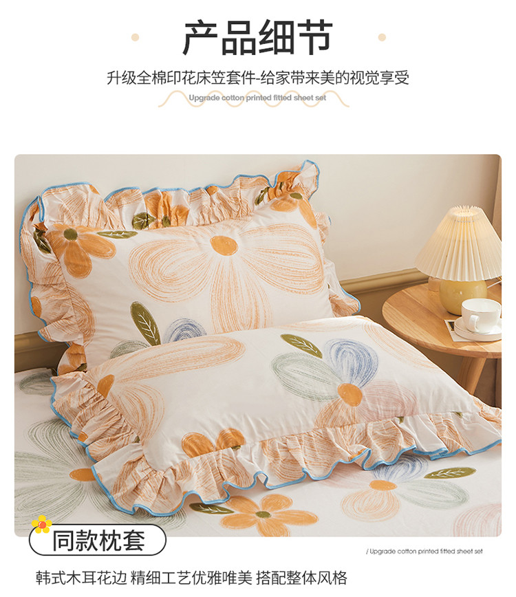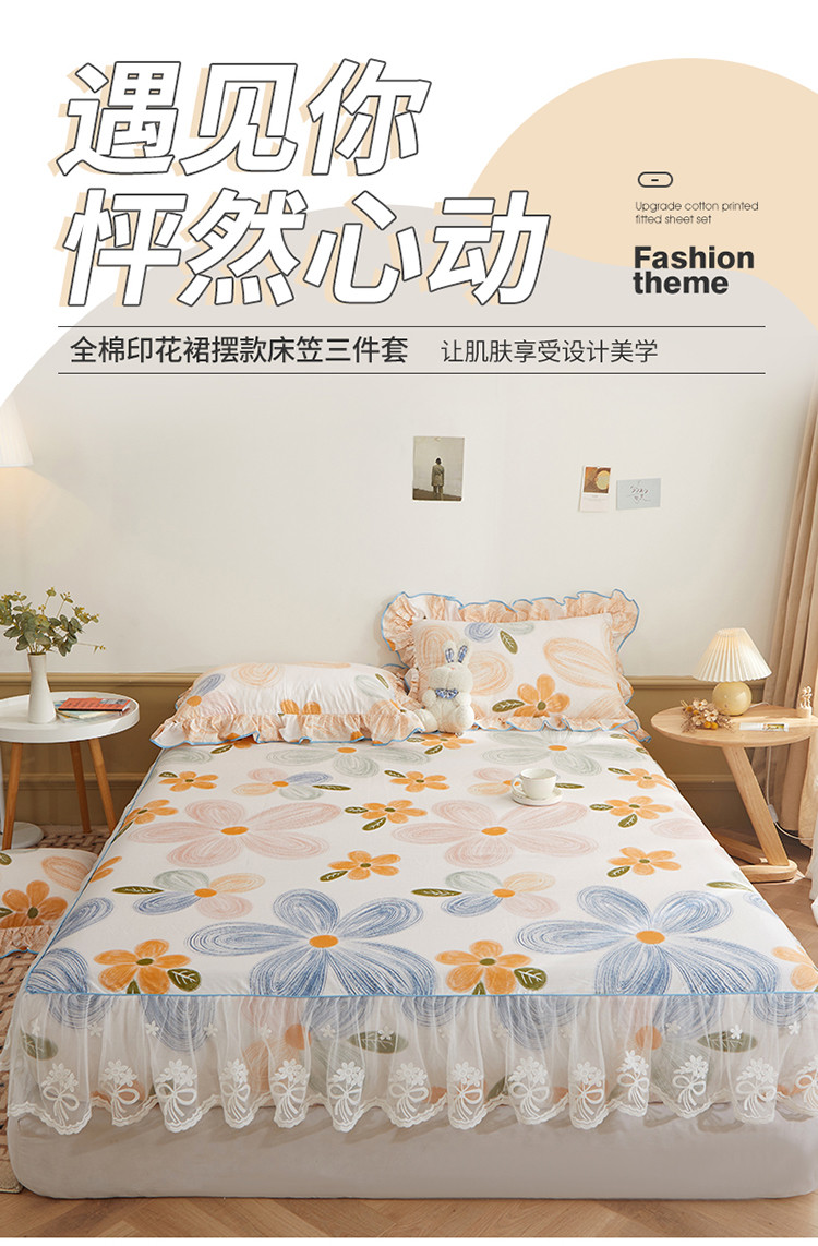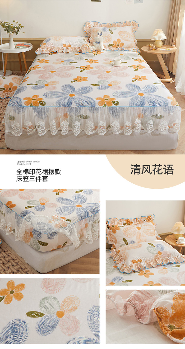 当前位置: 91家纺网 > 商品网购 > 床品套件 > 三件套 > 宜凡 2023新款全棉印花单层裙边系列-床笠三件套 清风花语