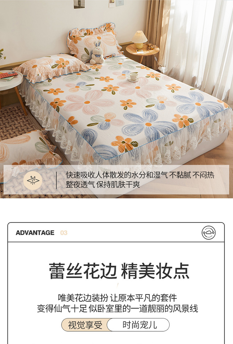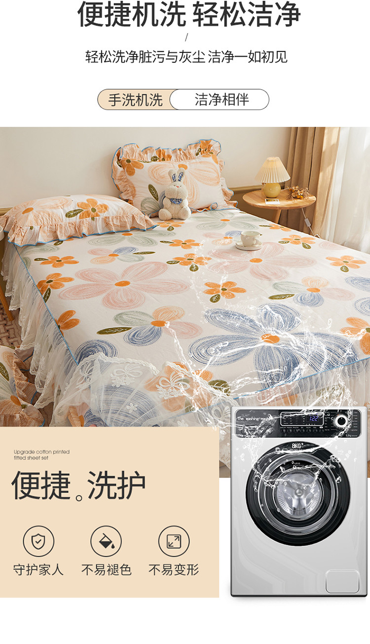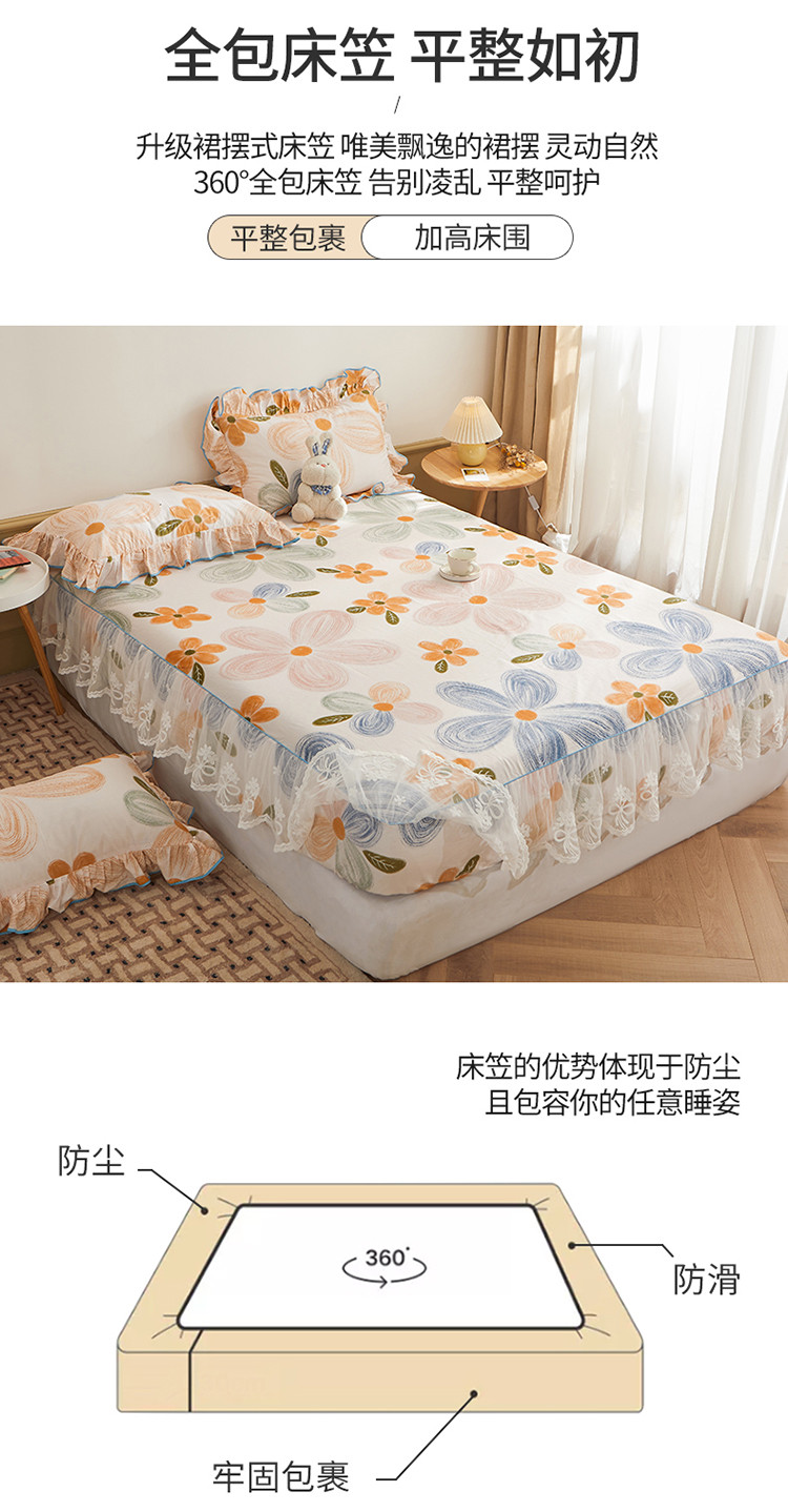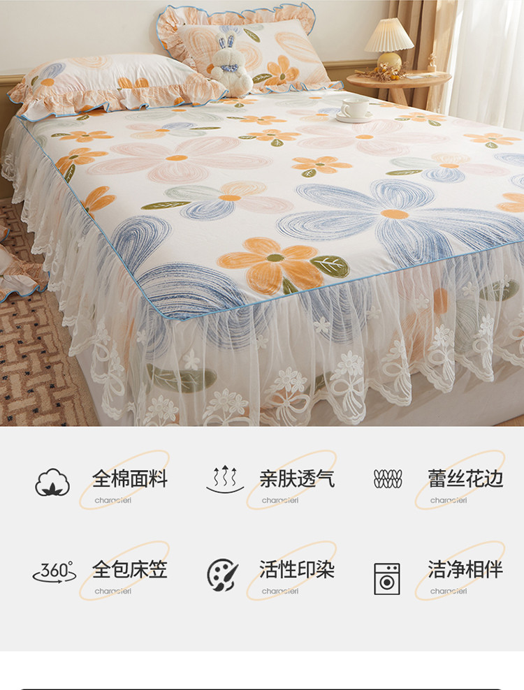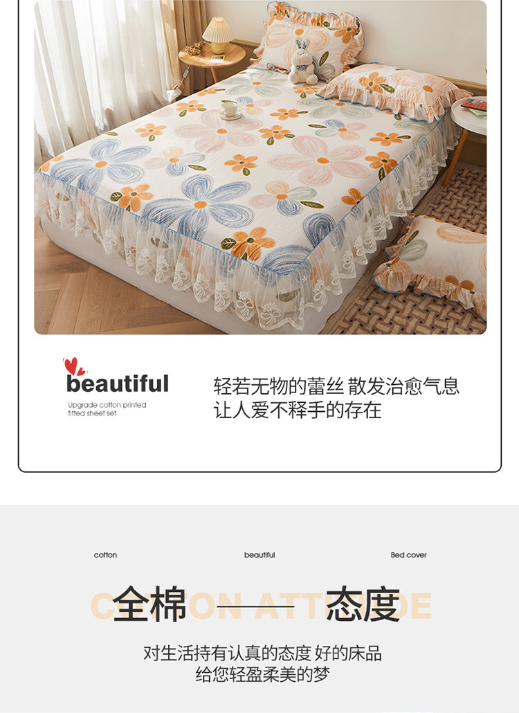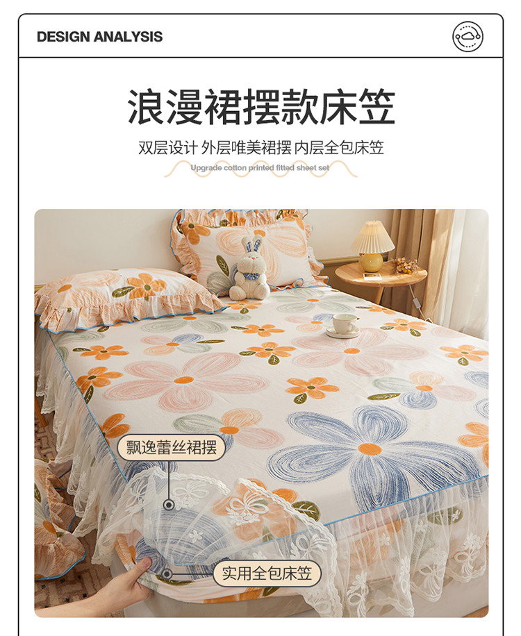 当前位置: 91家纺网 > 商品网购 > 床品套件 > 三件套 > 宜凡 2023新款全棉印花单层裙边系列-床笠三件套 清风花语