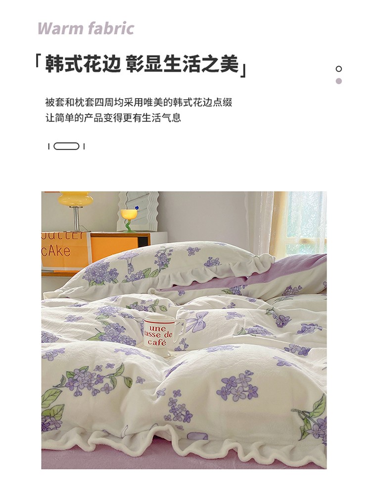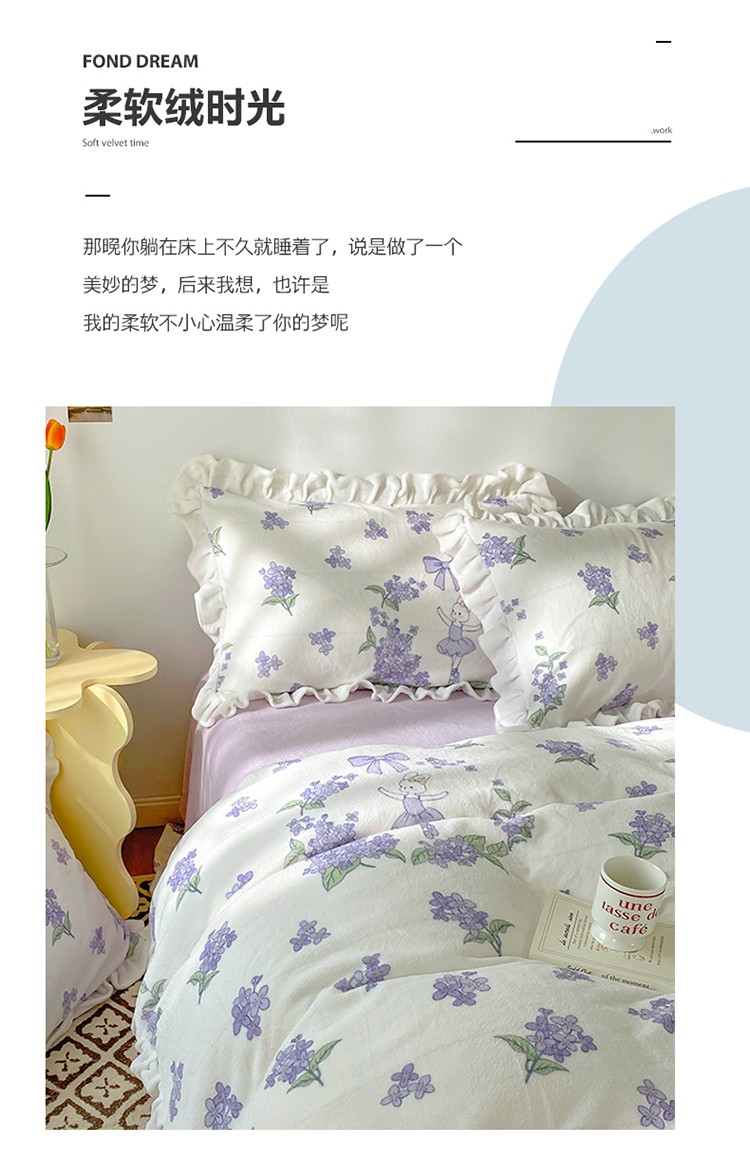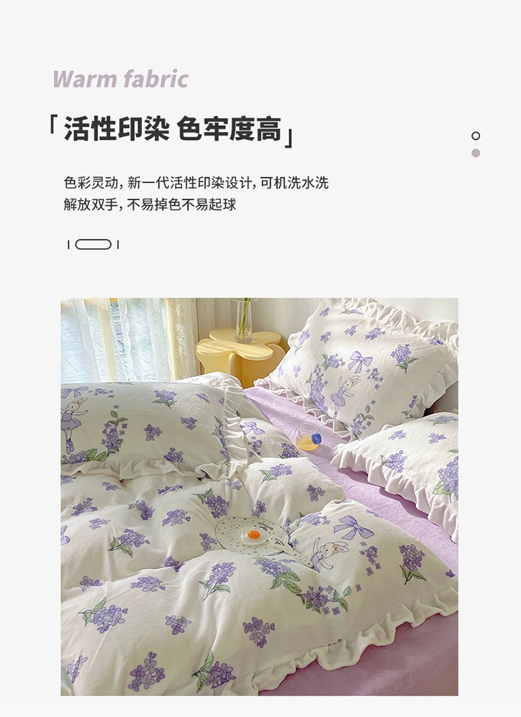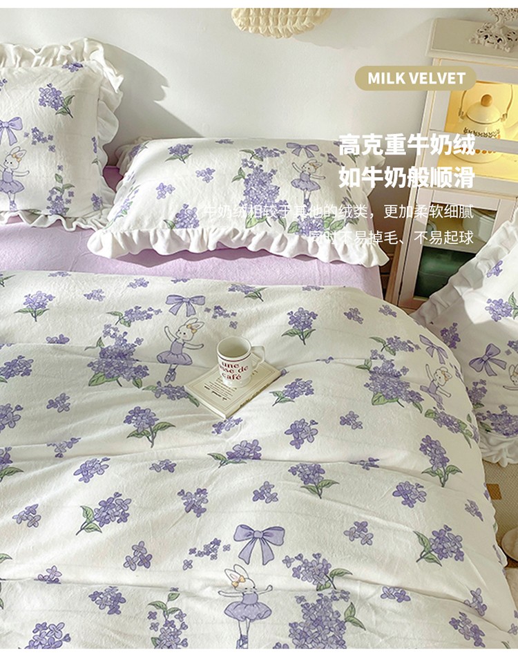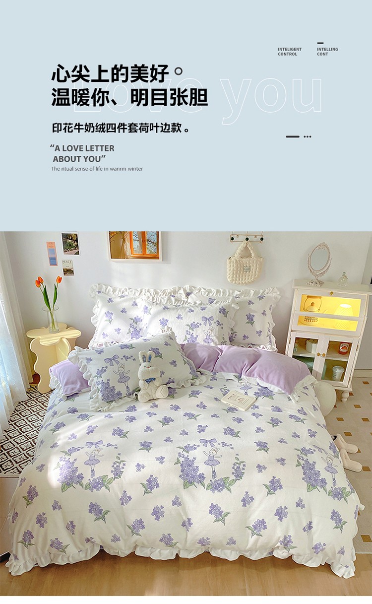 呗旺鹿2022新ykk拉链荷叶边印花牛奶绒四件套法莱绒 安妮