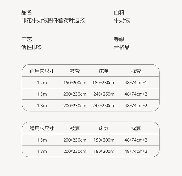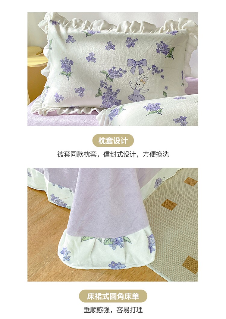 商品名称:呗旺鹿2022新ykk拉链荷叶边印花牛奶绒四件套法莱绒 安妮