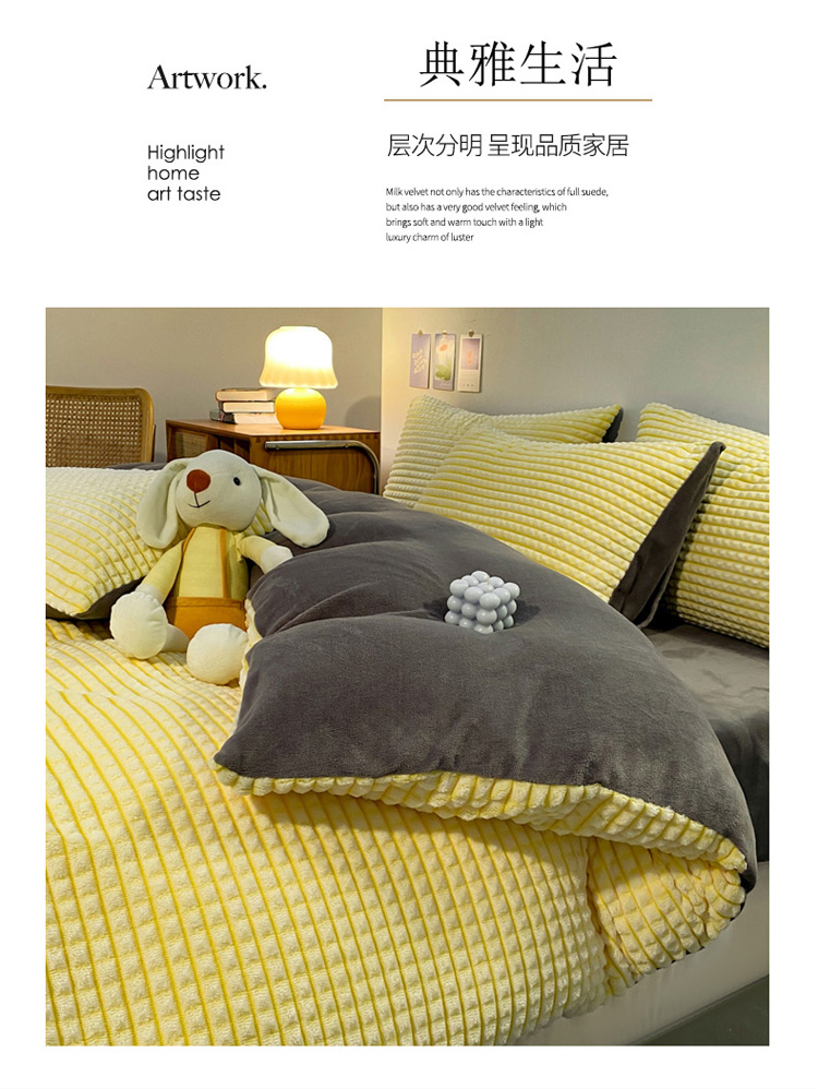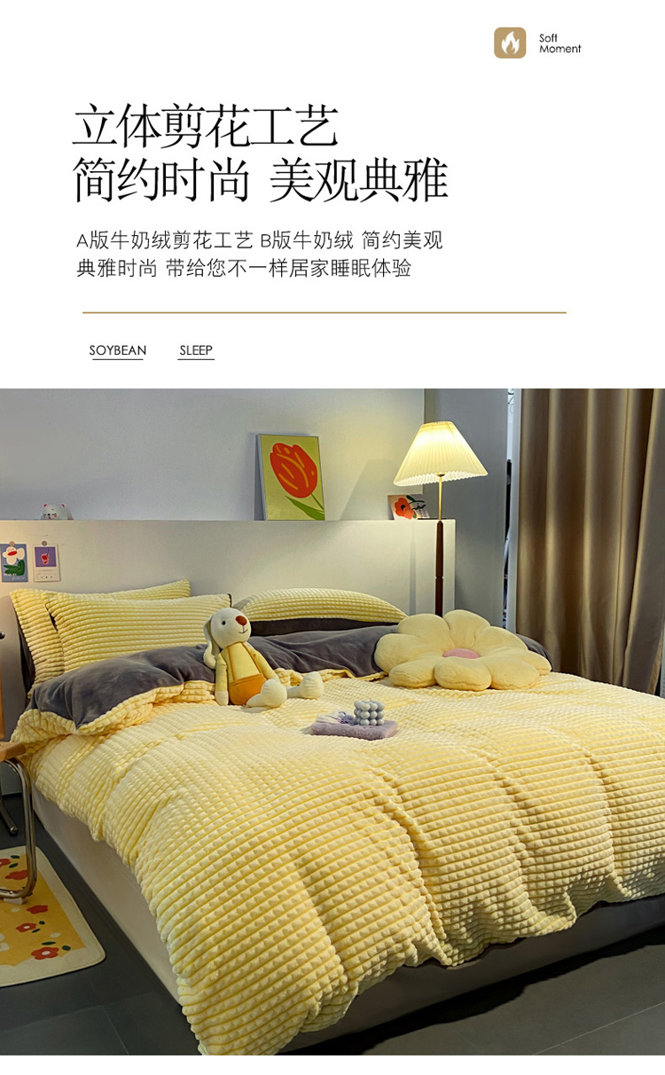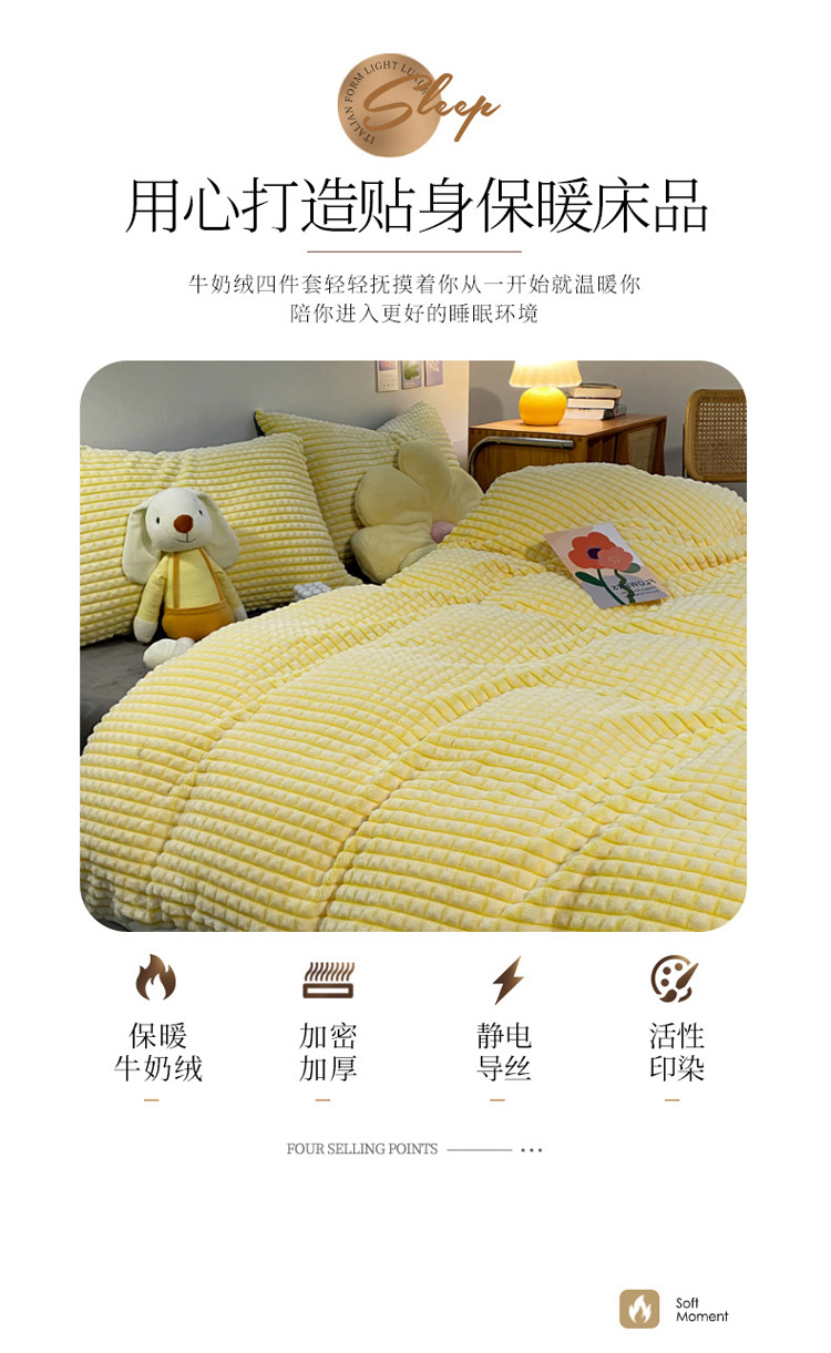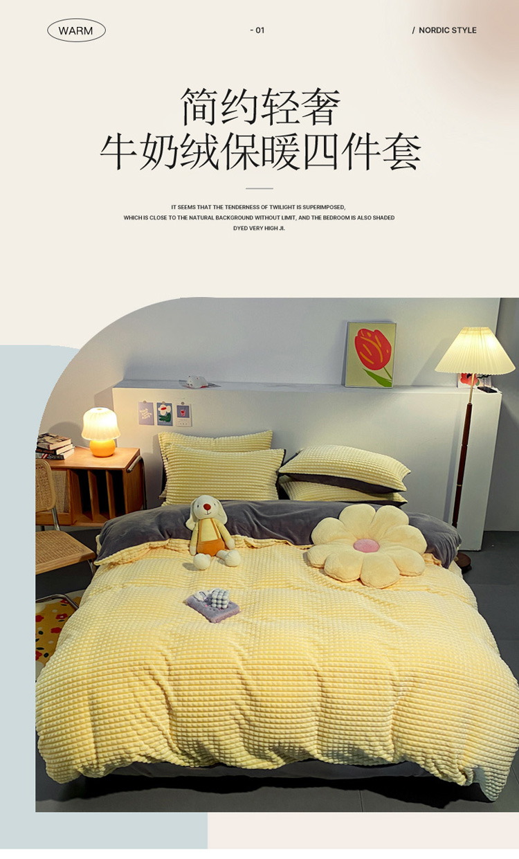 当前位置: 91家纺网 > 商品网购 > 床品套件 > 四件套 > 牛奶绒四件套 > 慕澄 2024新款牛奶绒剪花简约款四件套 简约-黄