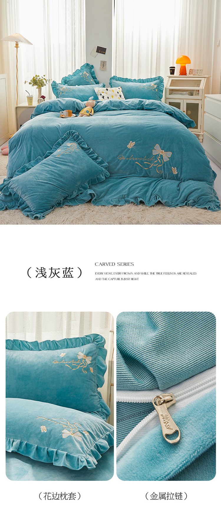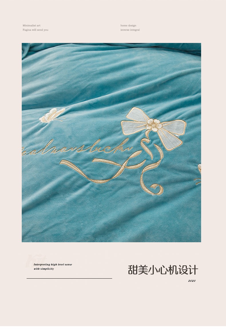 商品名称:恒爱 2022秋冬新款A类宝宝绒蝴蝶结刺绣床单款四件套 浅灰蓝