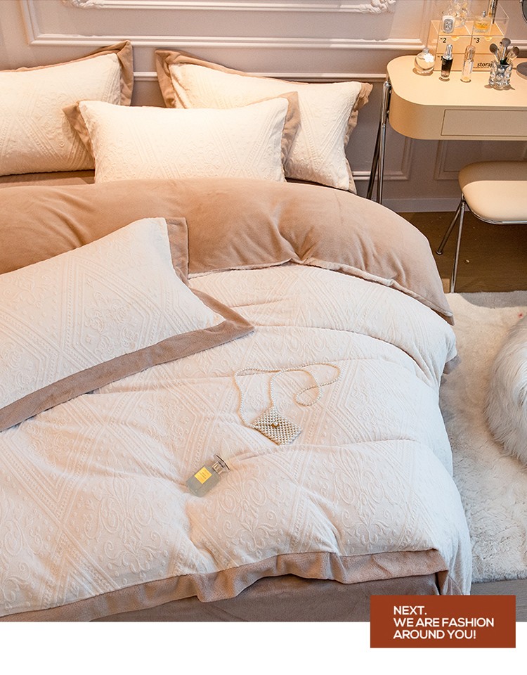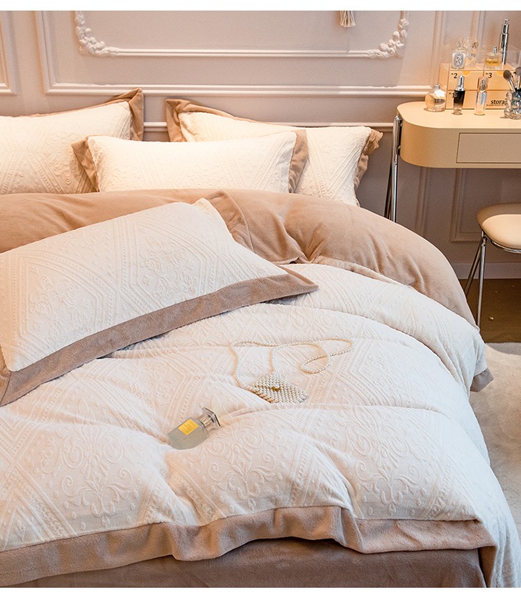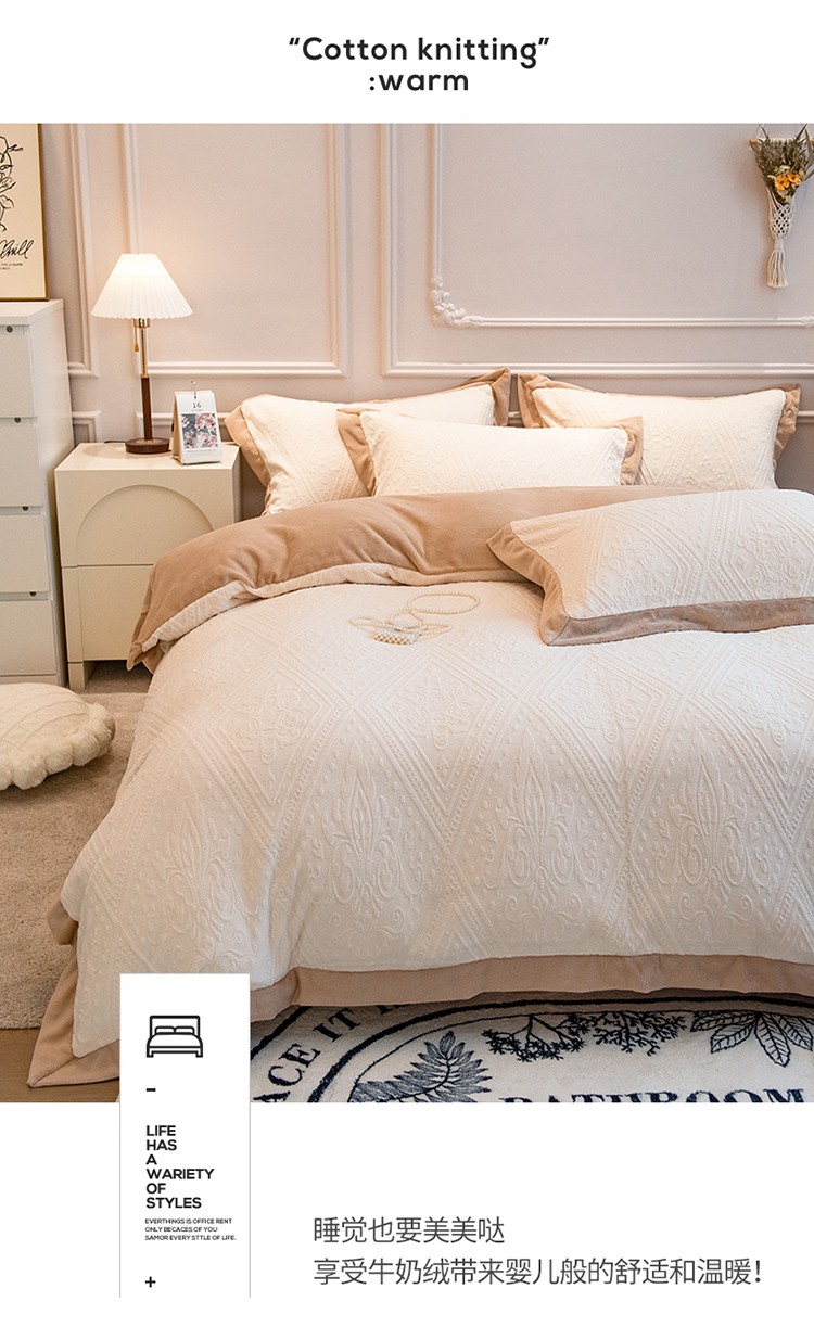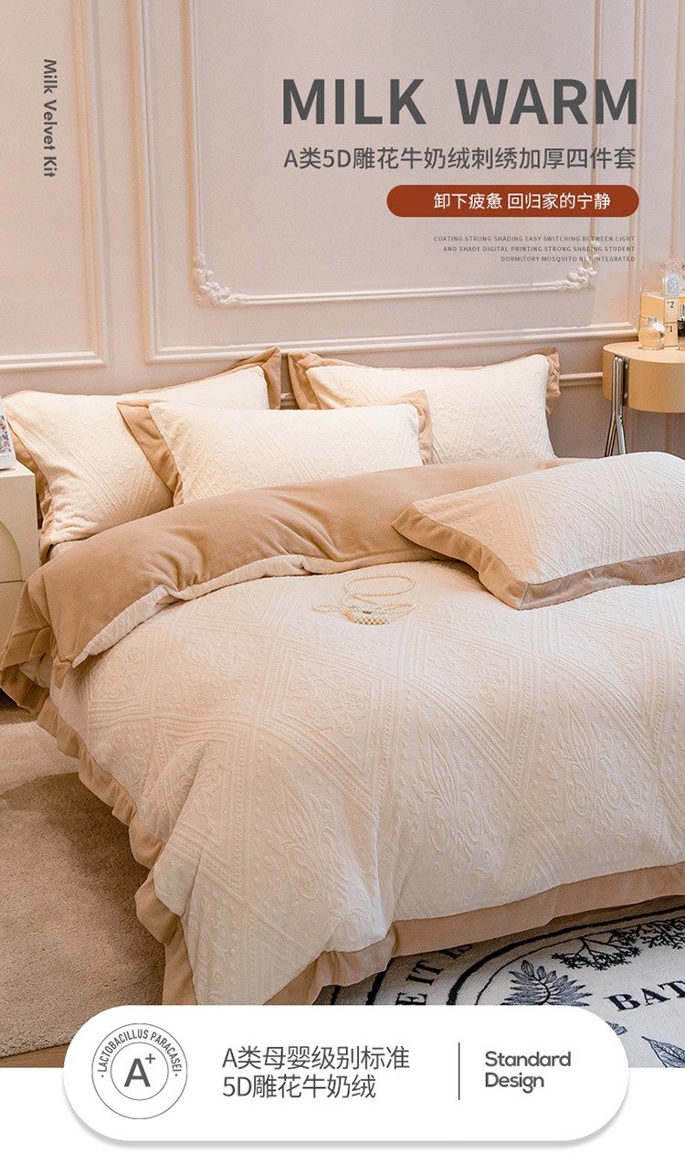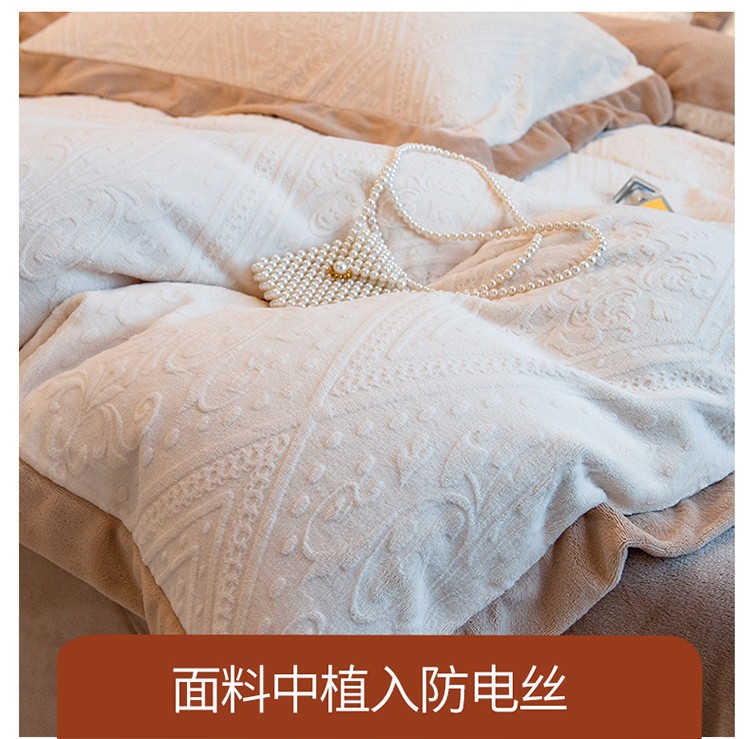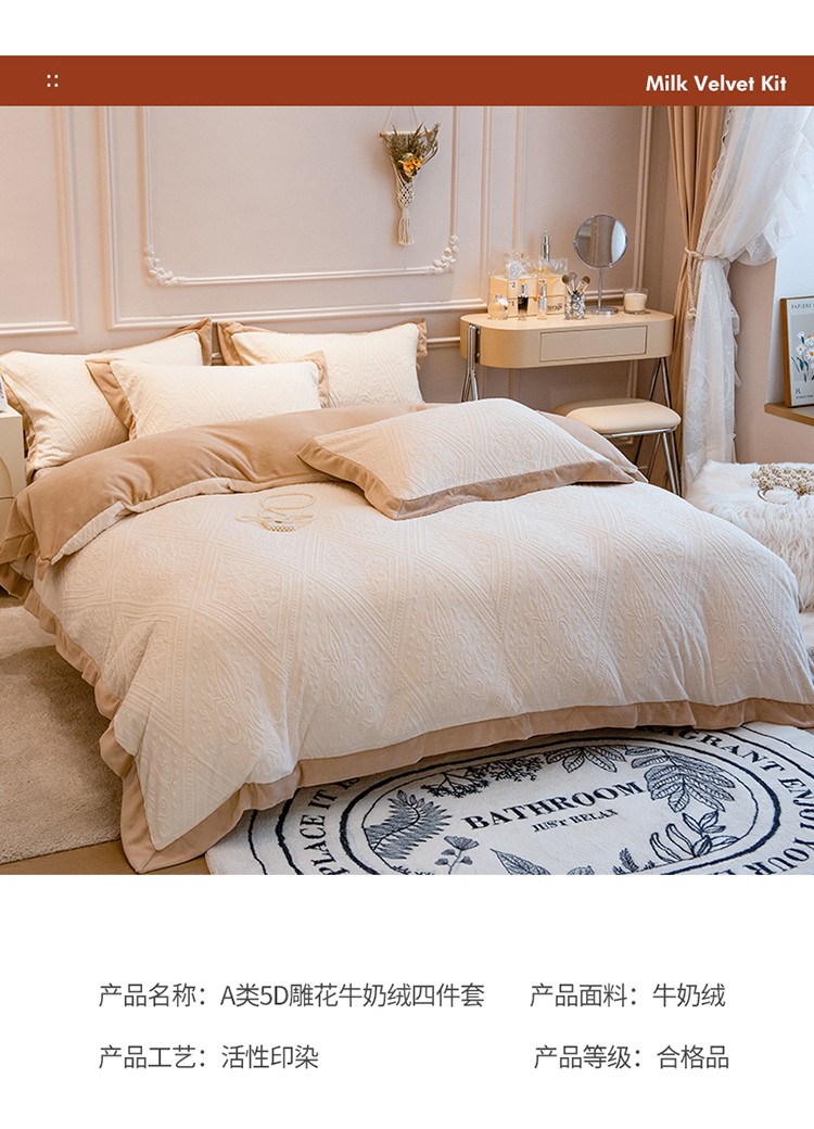 商品名称:丝幔新款全消光5D雕花牛奶绒四件套 欧式烂花-奶油白