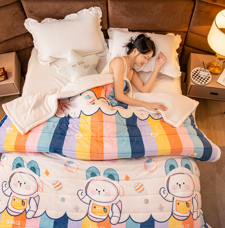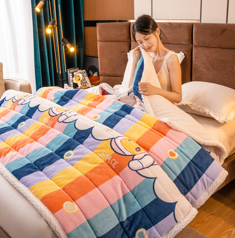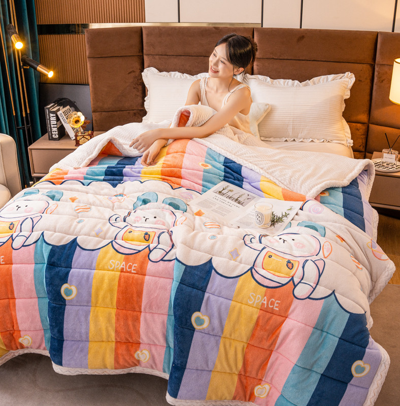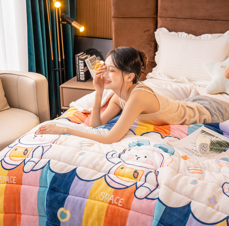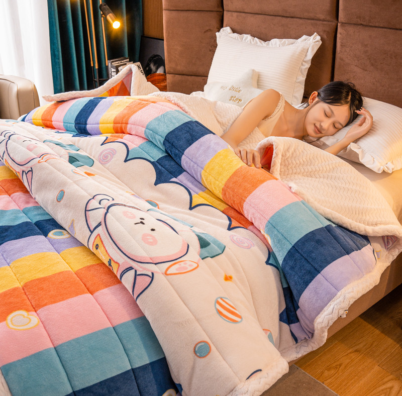 美莱家纺 2022新款牛奶绒贝贝绒夹棉加厚三层毛毯盖毯午睡毯 彩虹兔