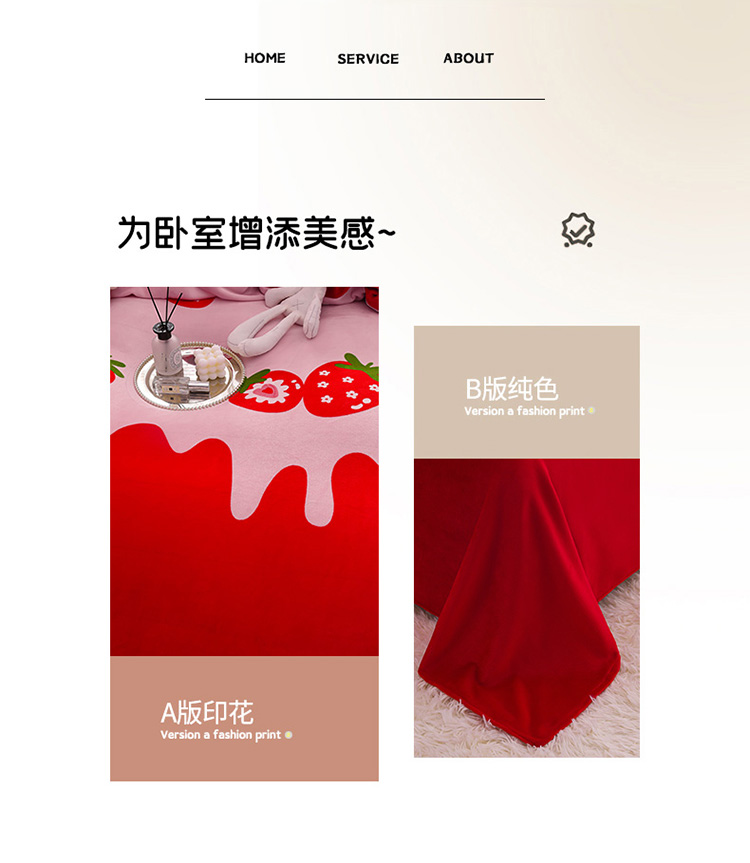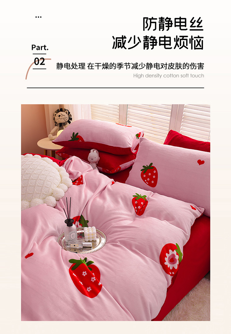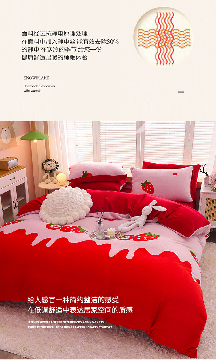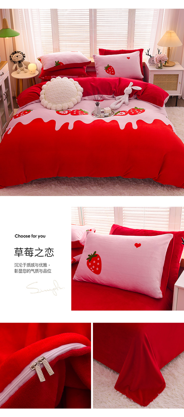 商品名称:芃成 2022新款加厚双面牛奶绒印花床品系列-四件套 草莓之恋