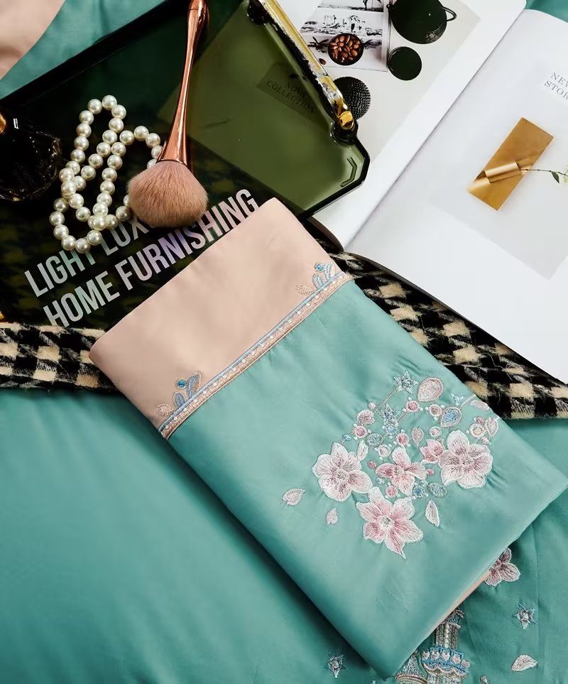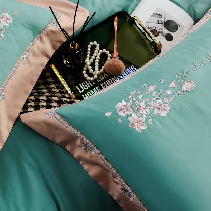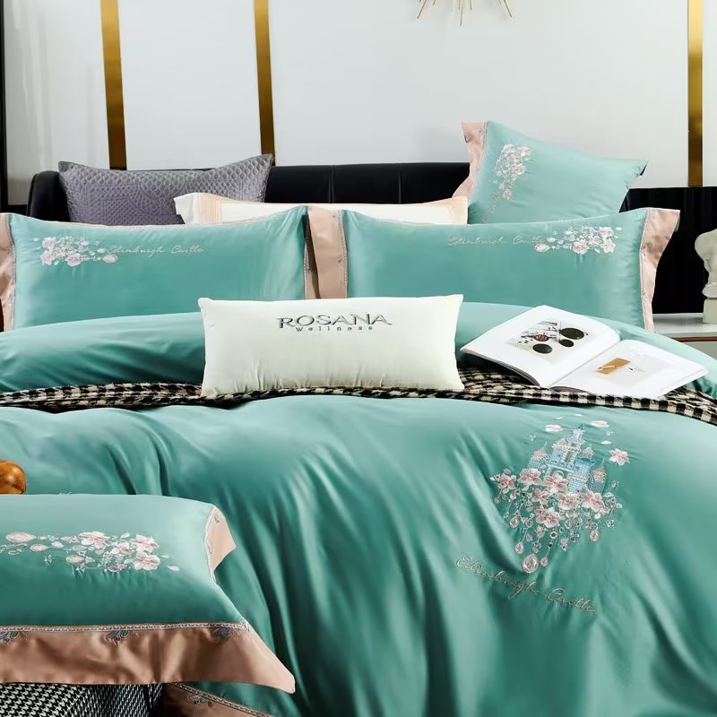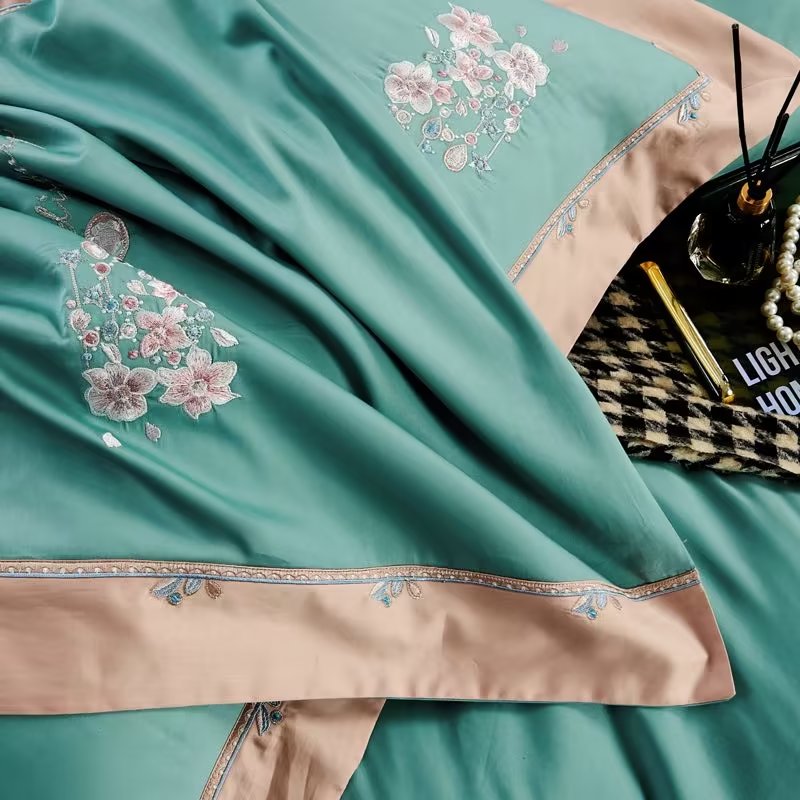 U品汇 2023新品120支60S长绒棉宽边刺绣花贡缎纯棉全棉四件套 爱的城堡-松石绿