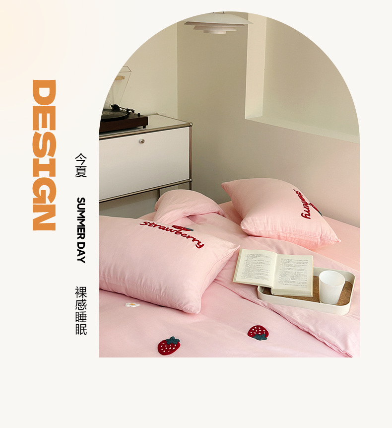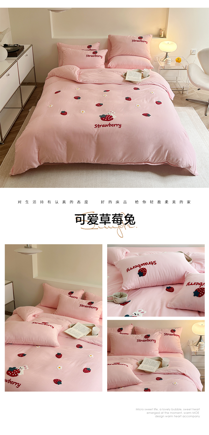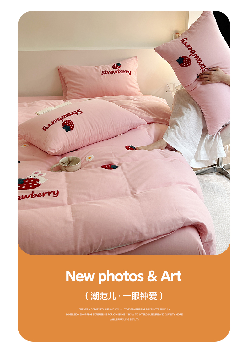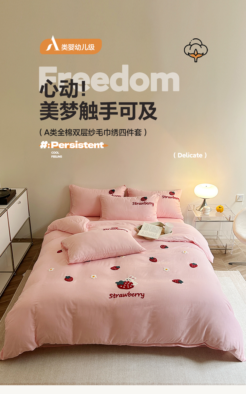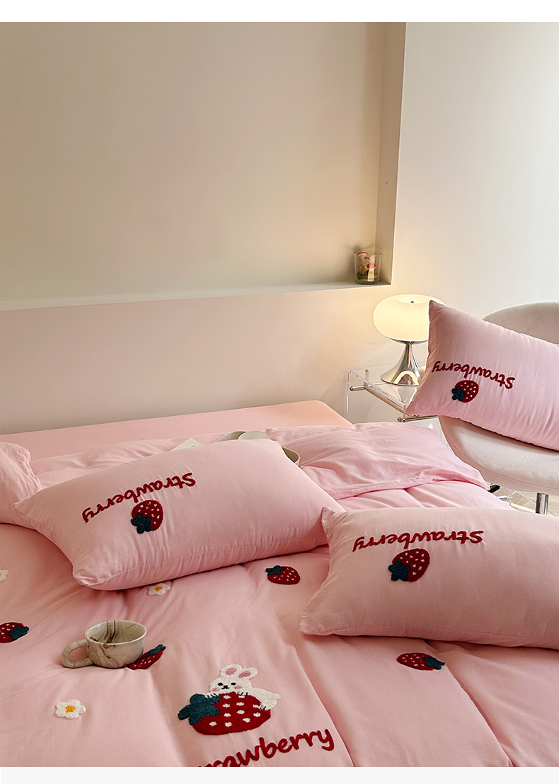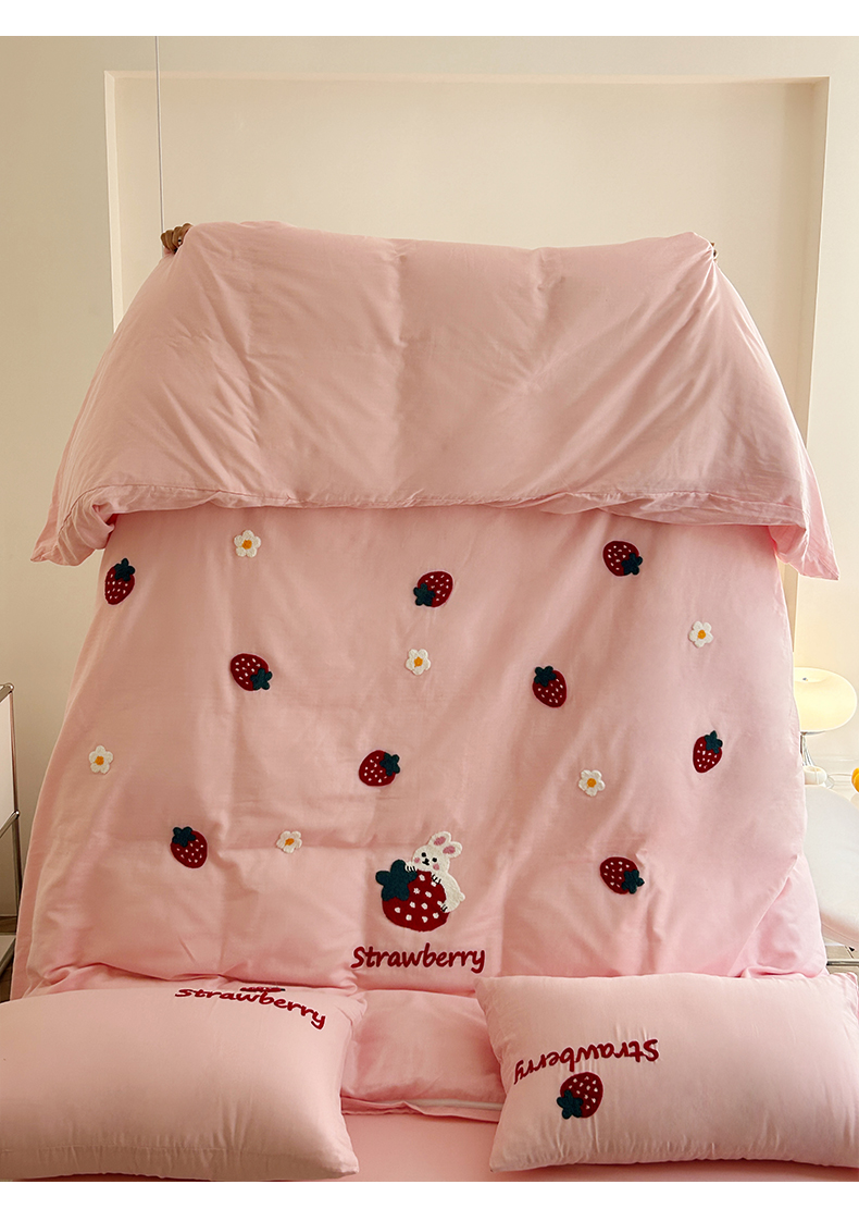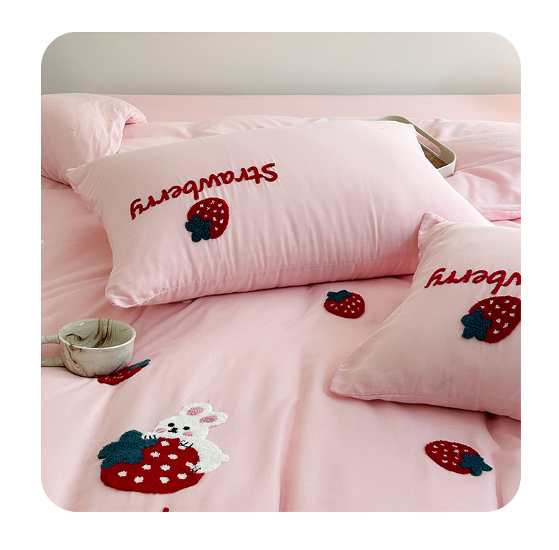 商品名称:雅居纺家纺 2023新款全棉A类双层纱毛巾绣四件套 可爱草莓兔