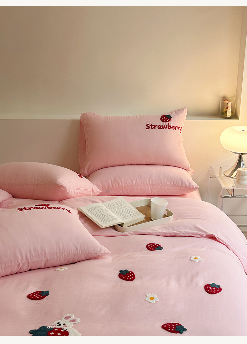 雅居纺家纺 2023新款全棉A类双层纱毛巾绣四件套 可爱草莓兔
