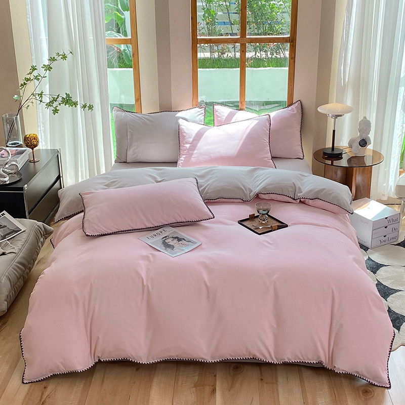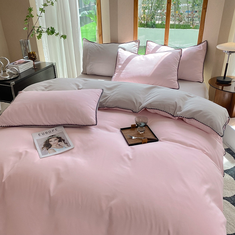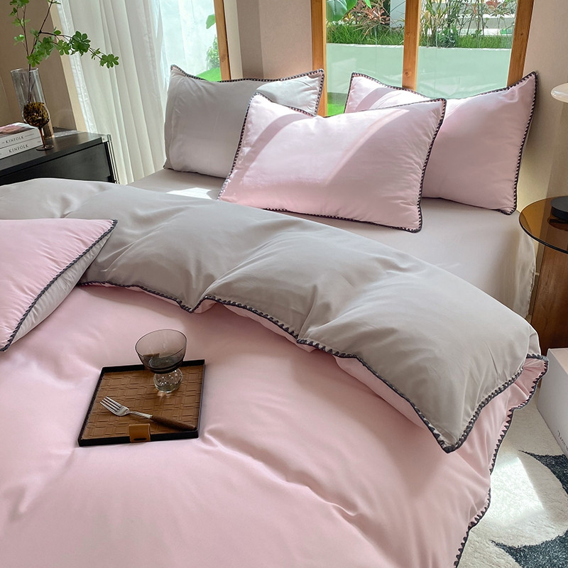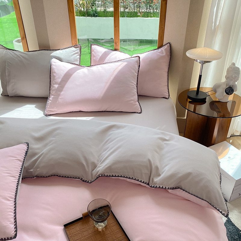 妖妖家纺 2023新款水洗棉贝壳边纯色三角针四件套 浅粉+浅灰