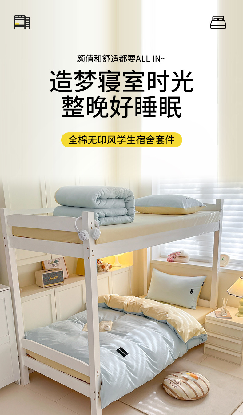 商品名称:佰亿莱 2024新款全棉无印风学生宿舍套件 芝士蓝+奶黄