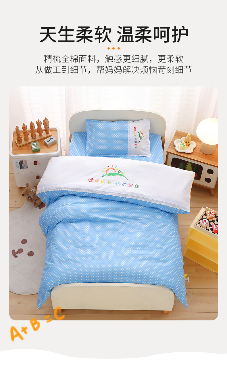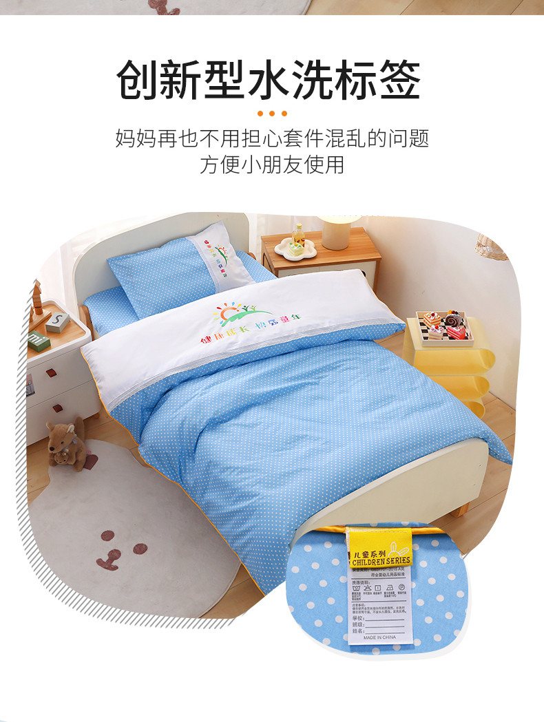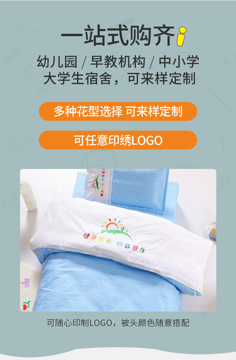 当前位置: 91家纺网 > 商品网购 > 床品套件 > 多件套 > 多件套 > 订做纯色绣花logo纯棉刺绣园标幼儿园被子三件套午睡六件套 蓝色点点