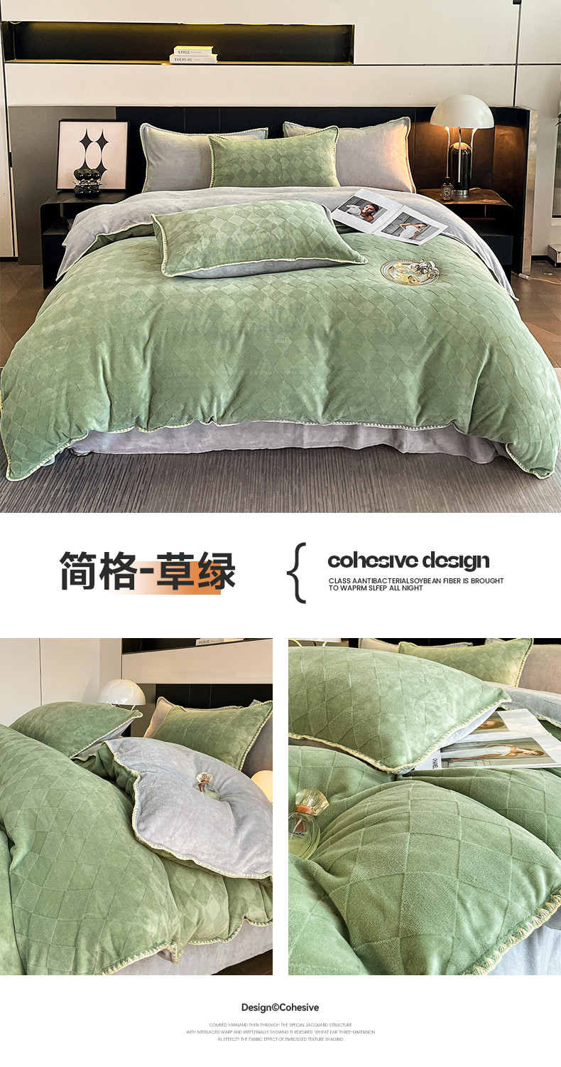 商品名称:澳梵 2023新款雕花牛奶绒贝壳边工艺四件套 简格-草绿