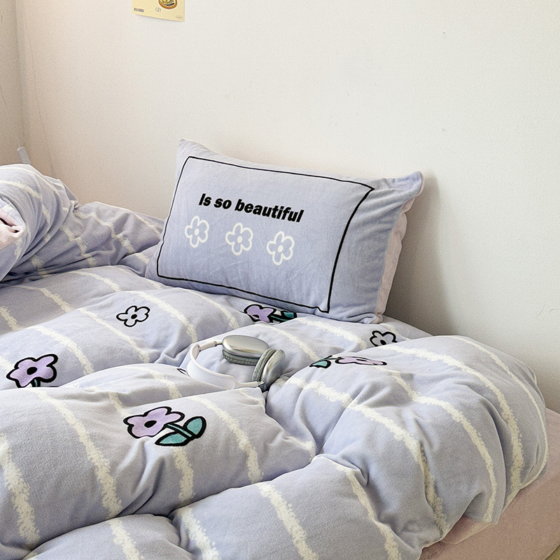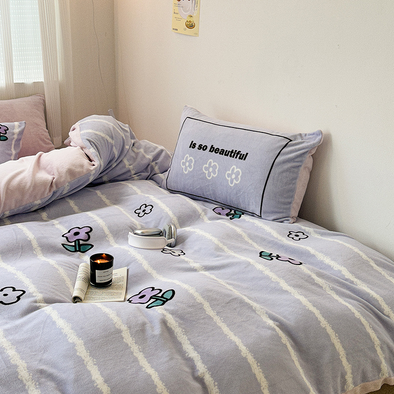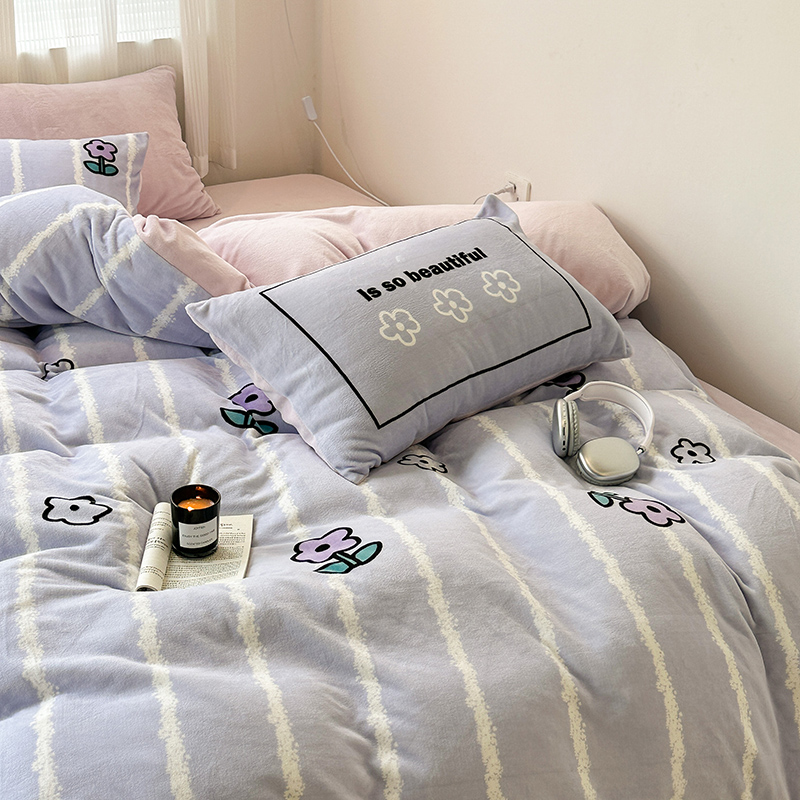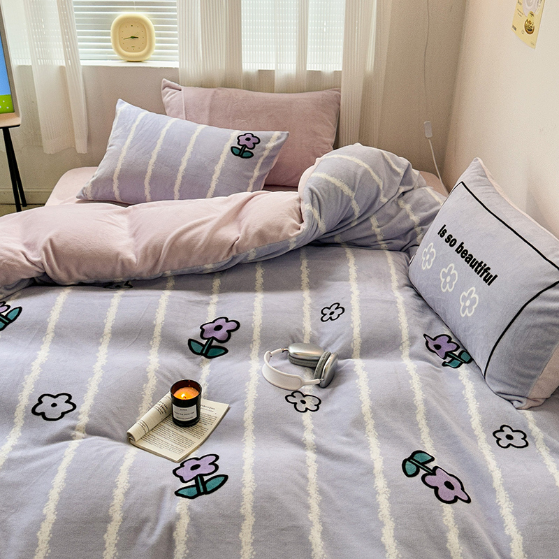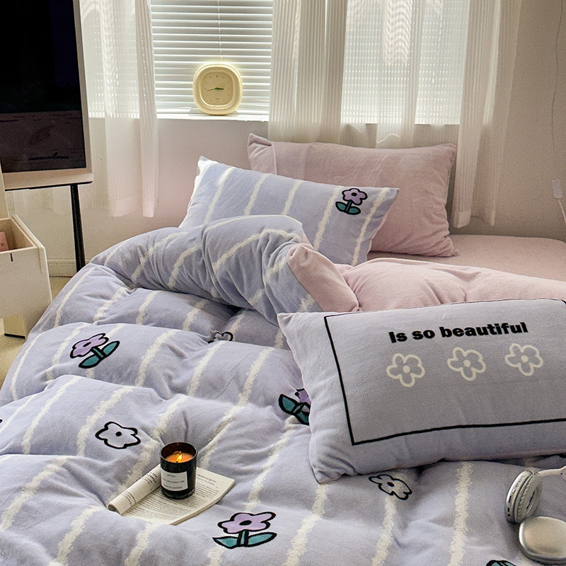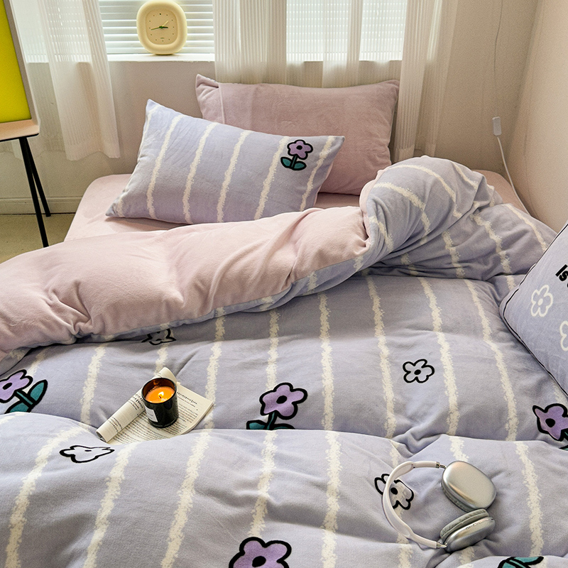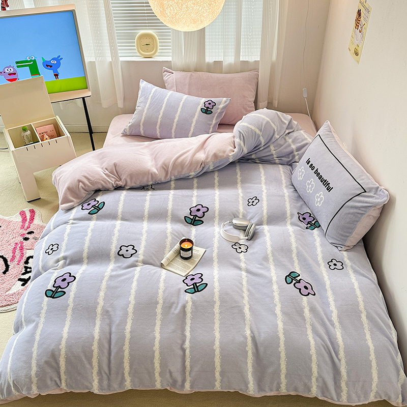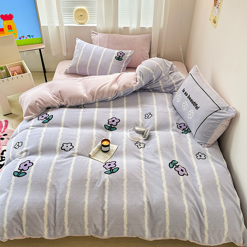 昔可家纺 2023新款大版数码印花保暖牛奶绒四件套 竖条紫花