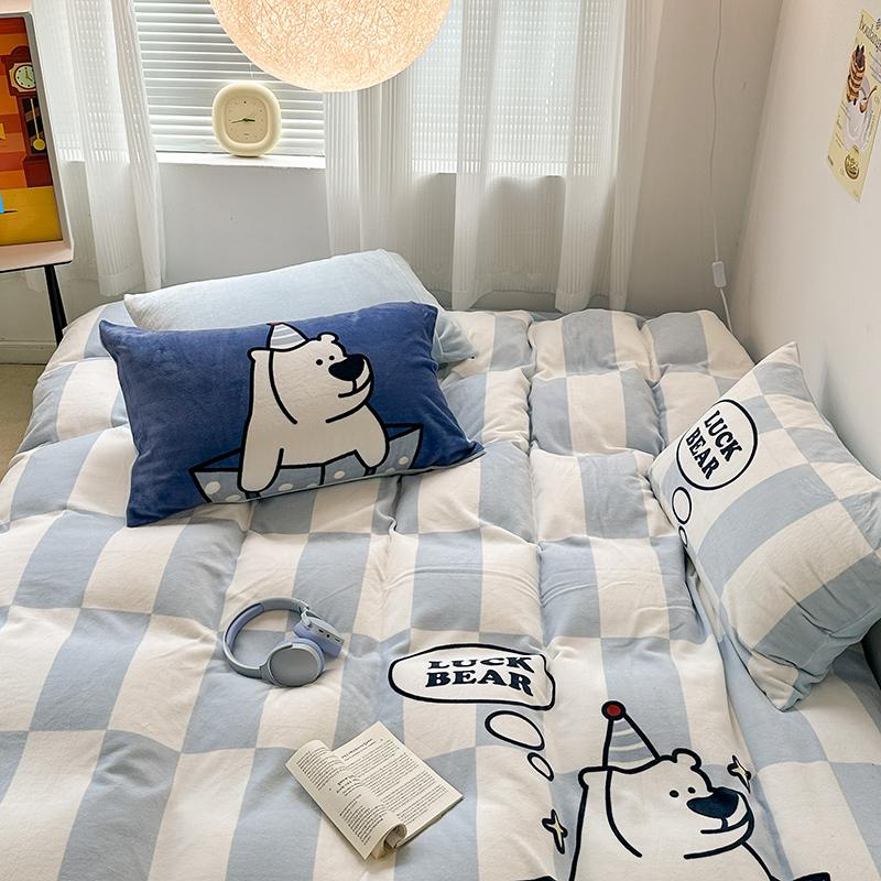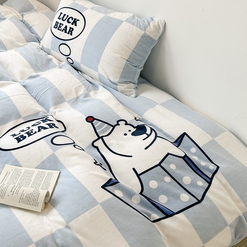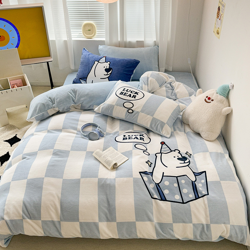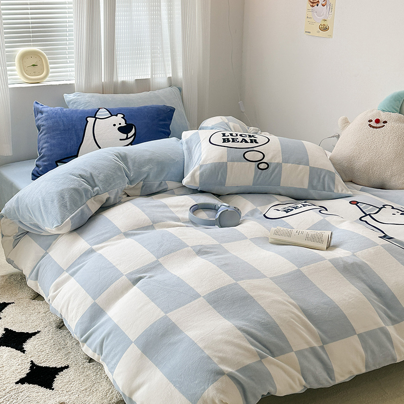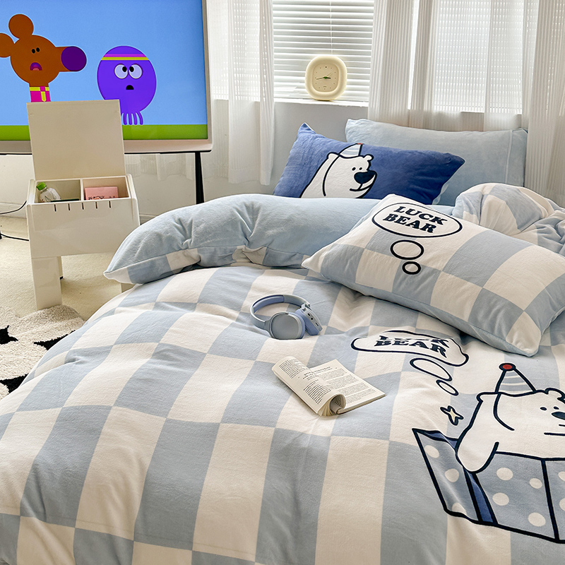 昔可家纺 2023新款大版数码印花保暖牛奶绒四件套 蓝格礼物熊