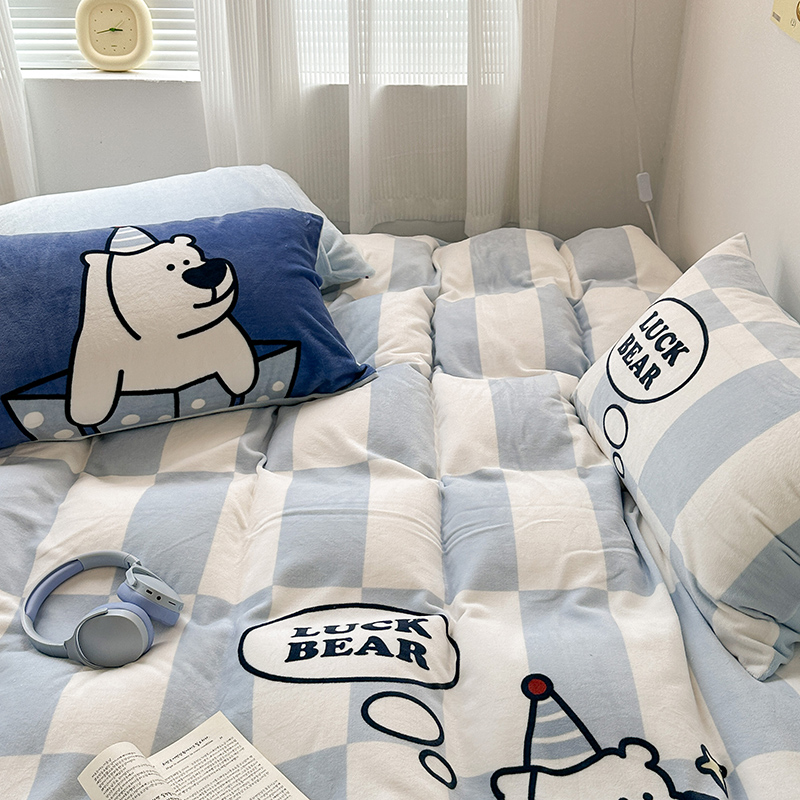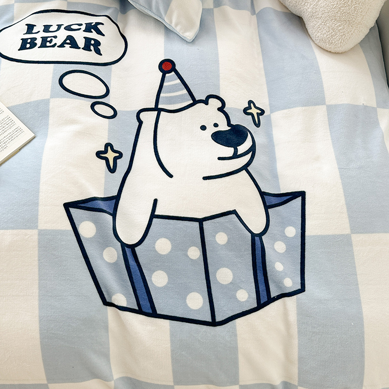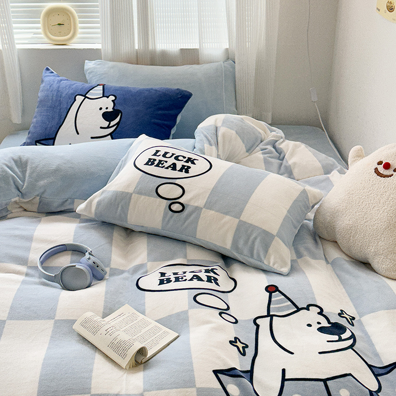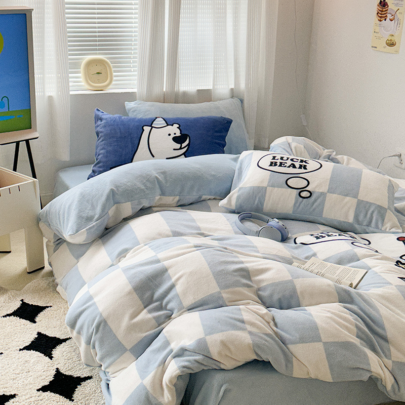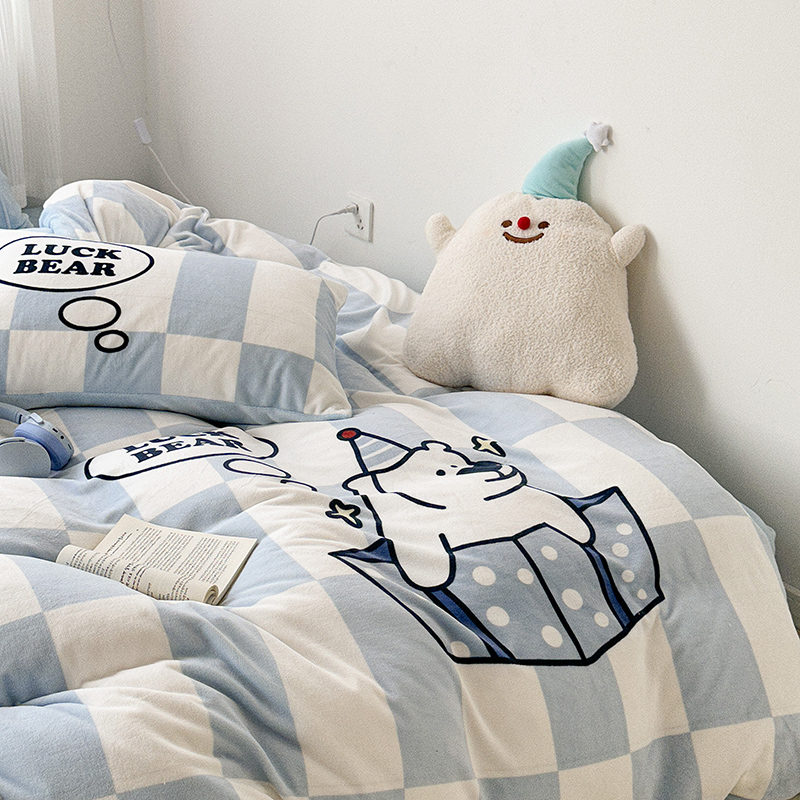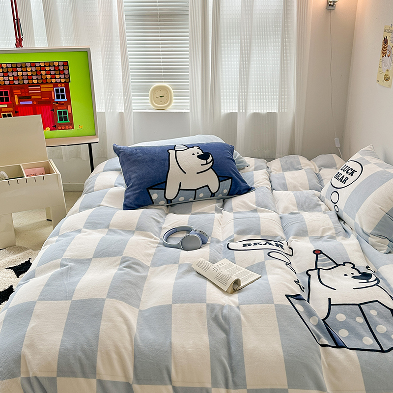 昔可家纺 2023新款大版数码印花保暖牛奶绒四件套 蓝格礼物熊