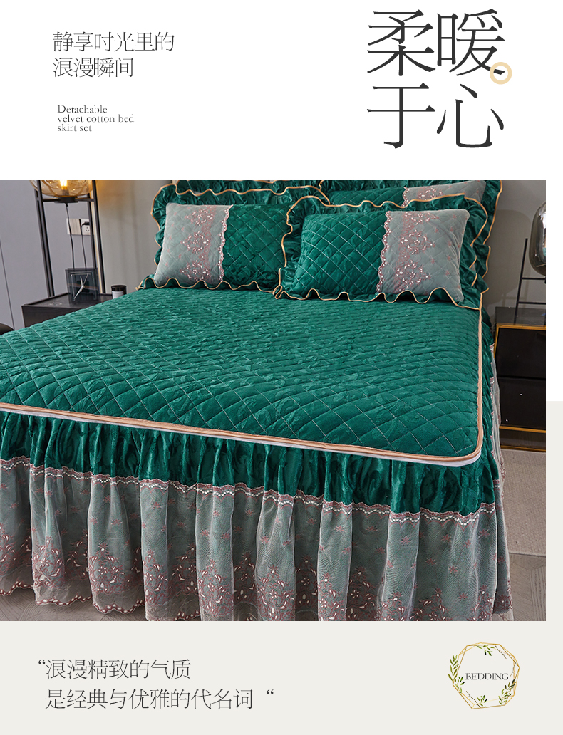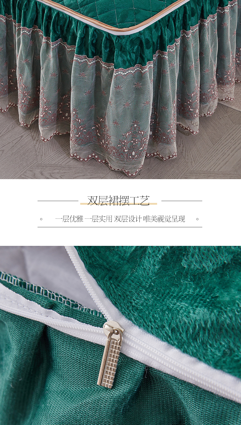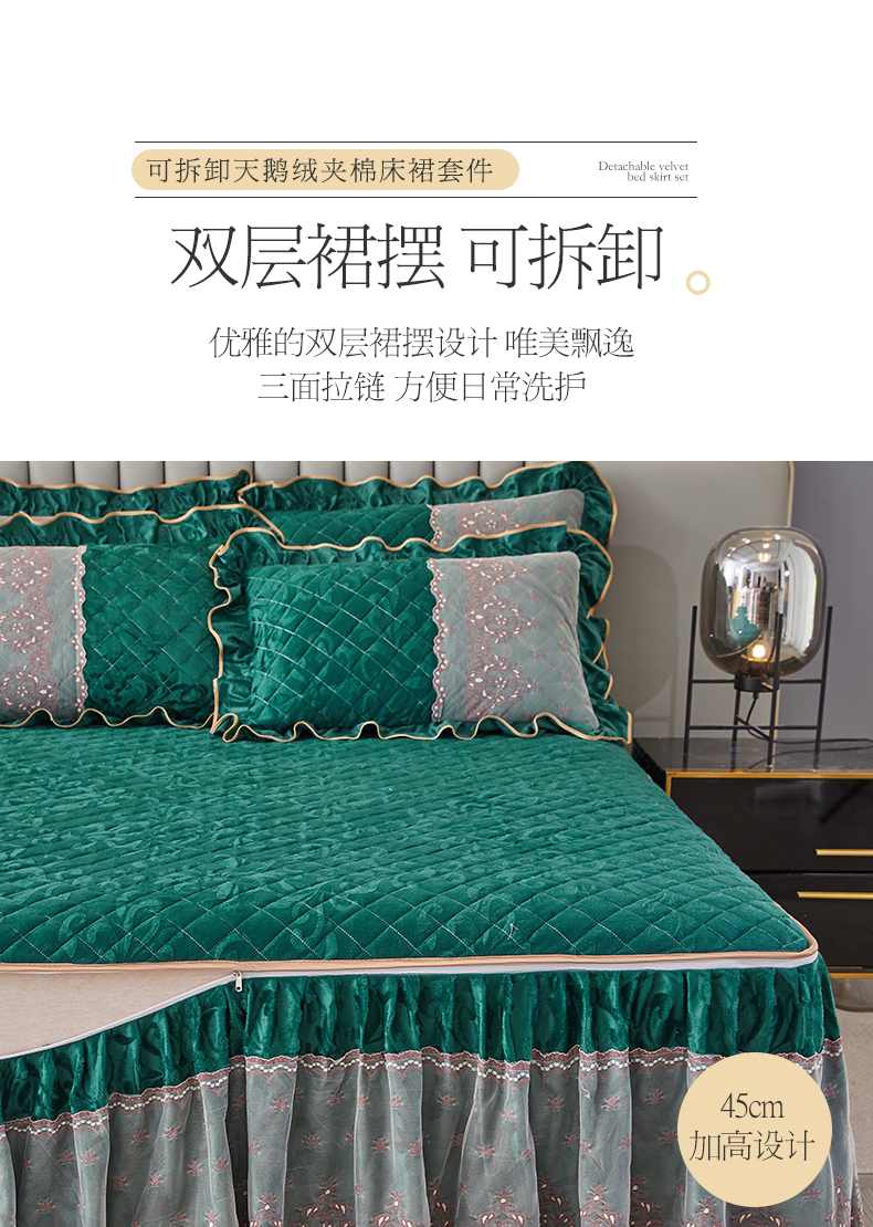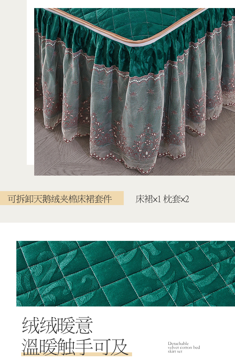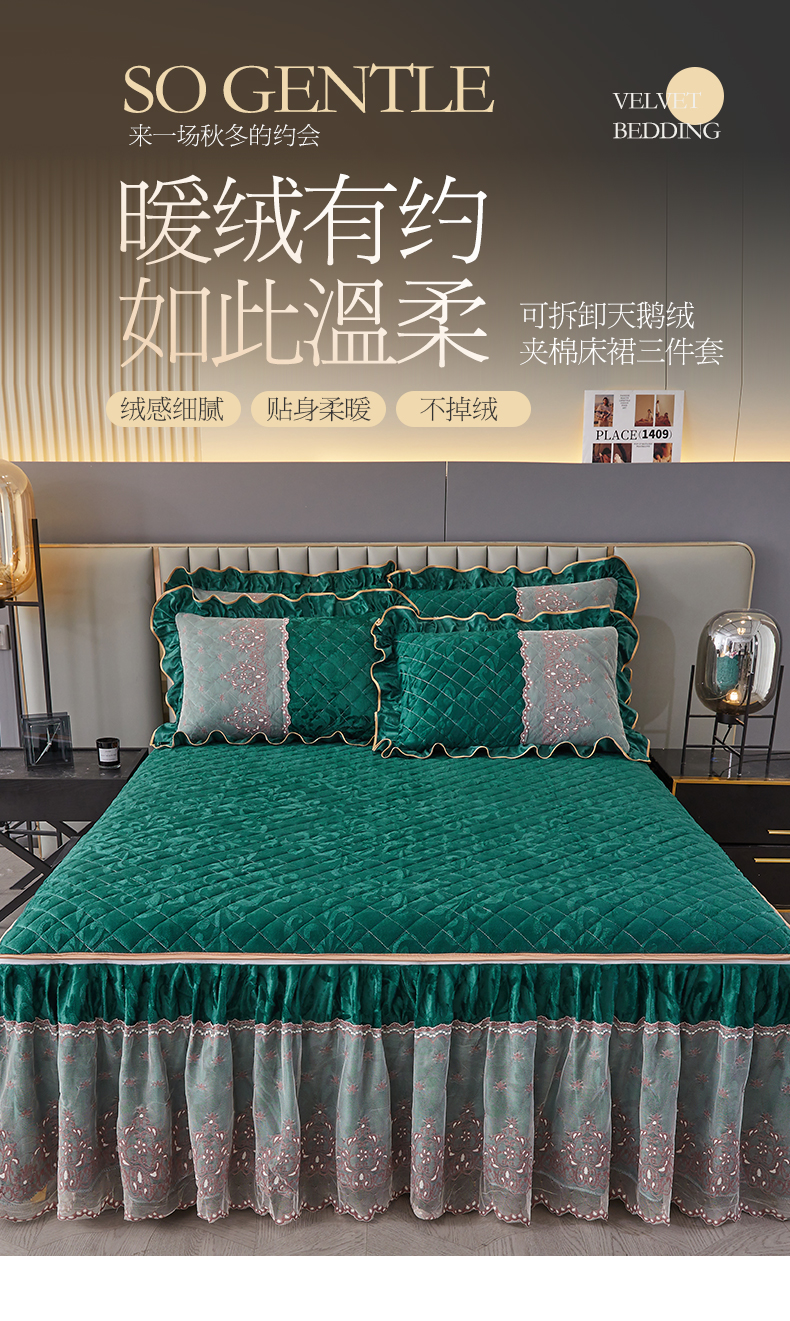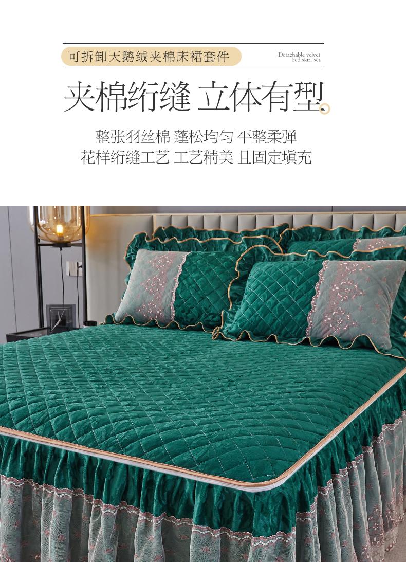 商品名称:网红馆 2025新款可拆卸天鹅绒夹棉床裙三件套-城市魅影 城市魅影 翠绿