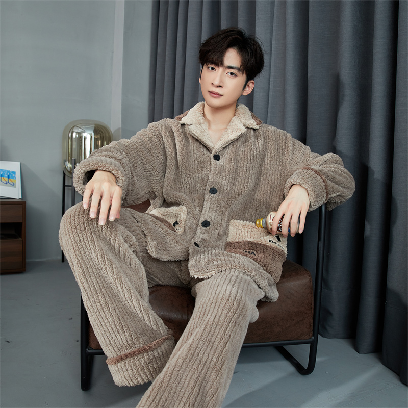 (总)洛兰沙家居馆 2025新款【松木】男士长袖长裤套装日系简约家居服全棉双层色织提花棉纱款,松木-灰色
