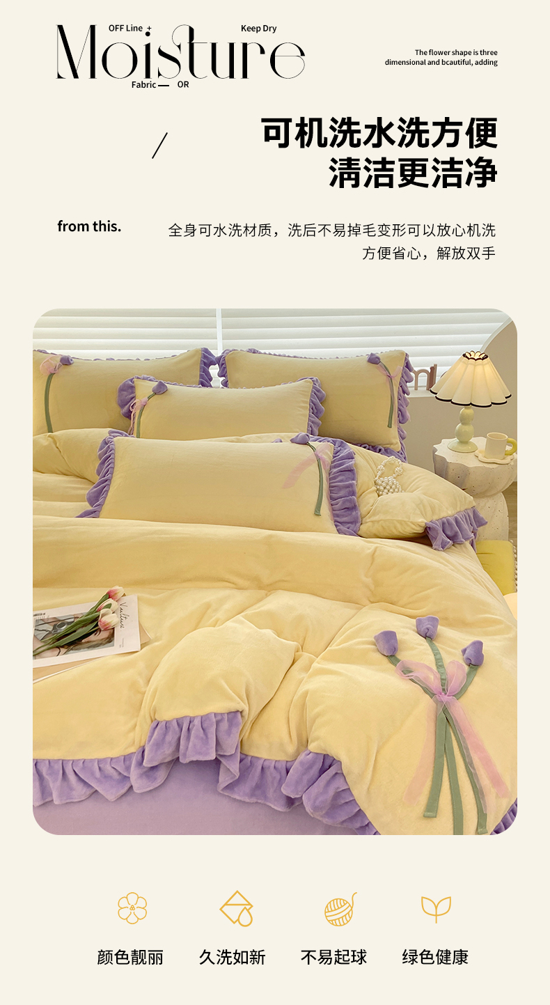 (总)言熙居 2024新款法莱绒牛奶绒高克重韩版四件套-郁金香系列,郁金香黄,郁金香粉,郁金香蓝,郁金香绿