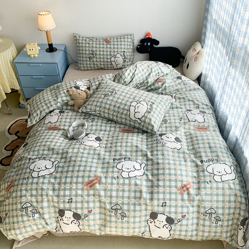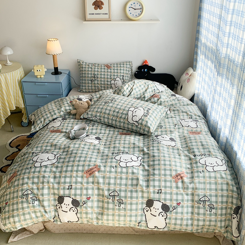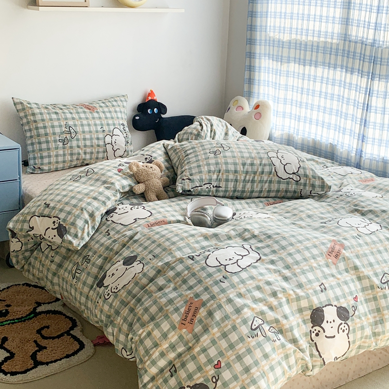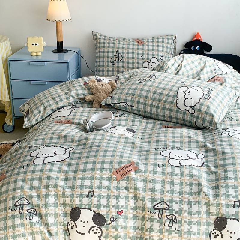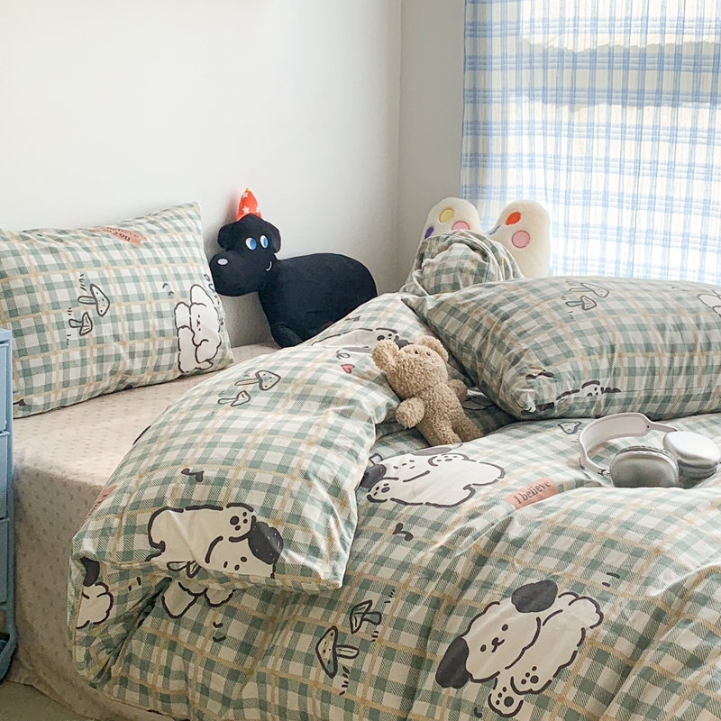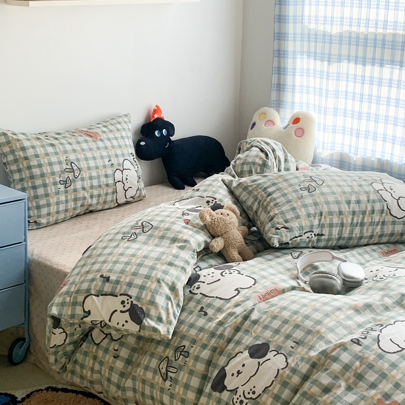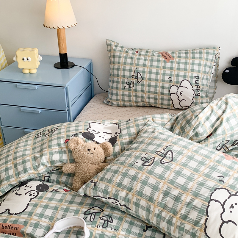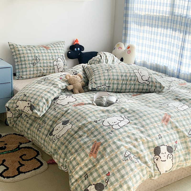 昔可家纺 2023新款12月卡通全棉四件套 绿格子狗狗