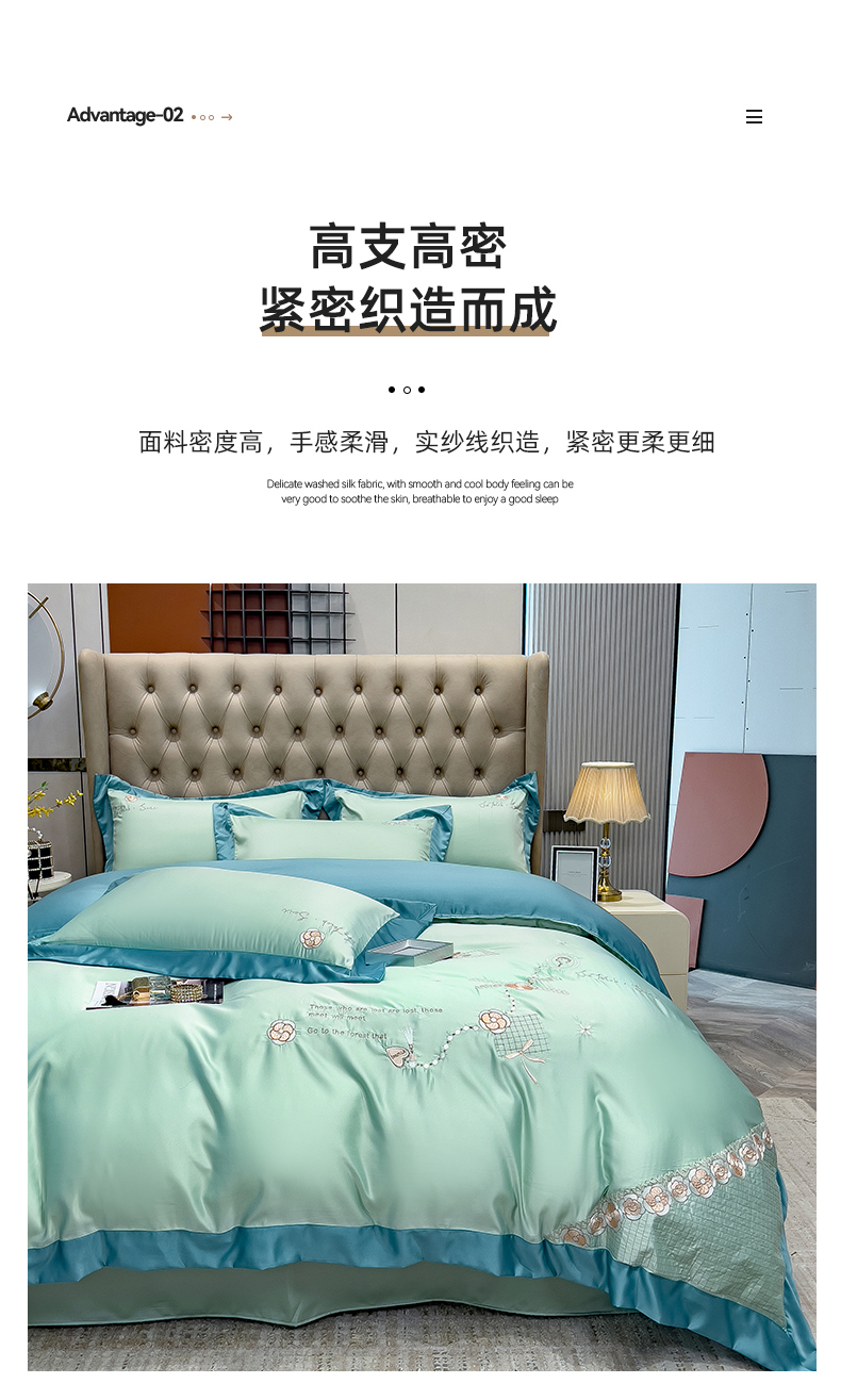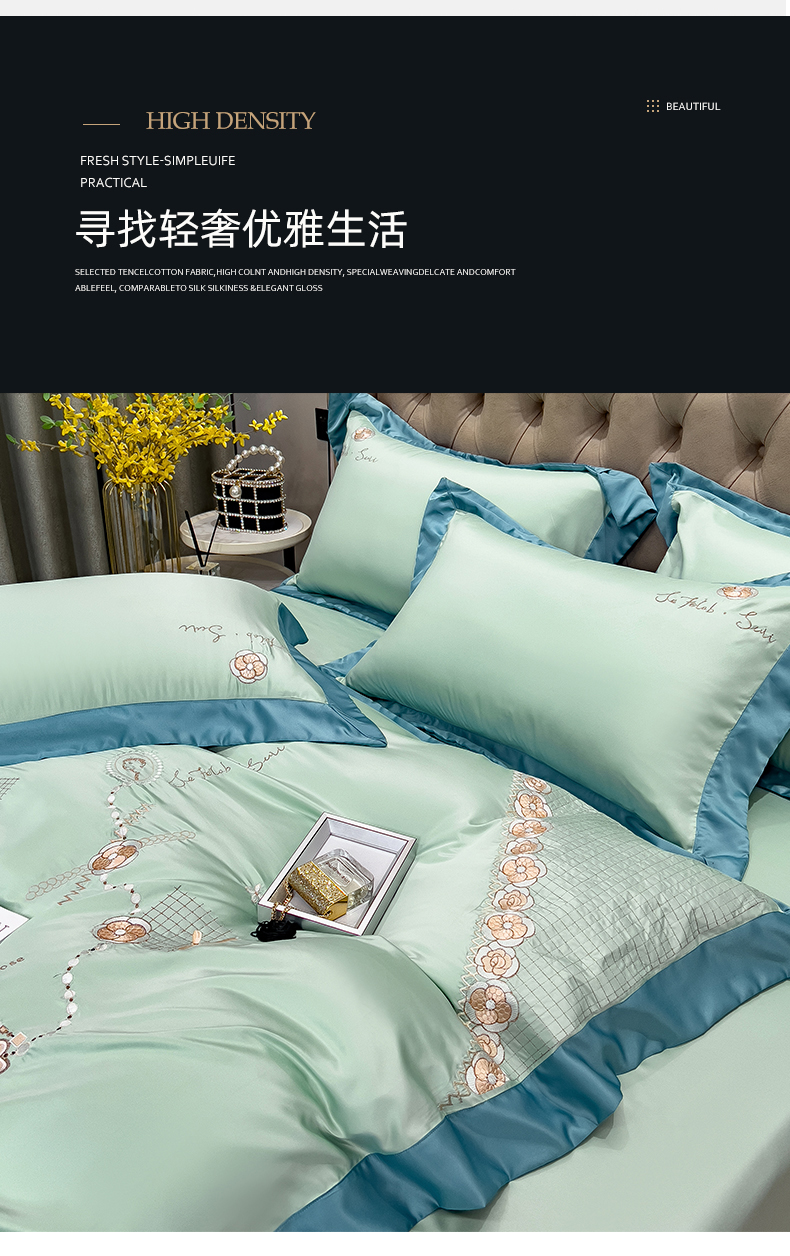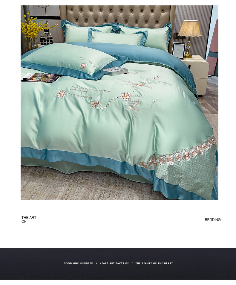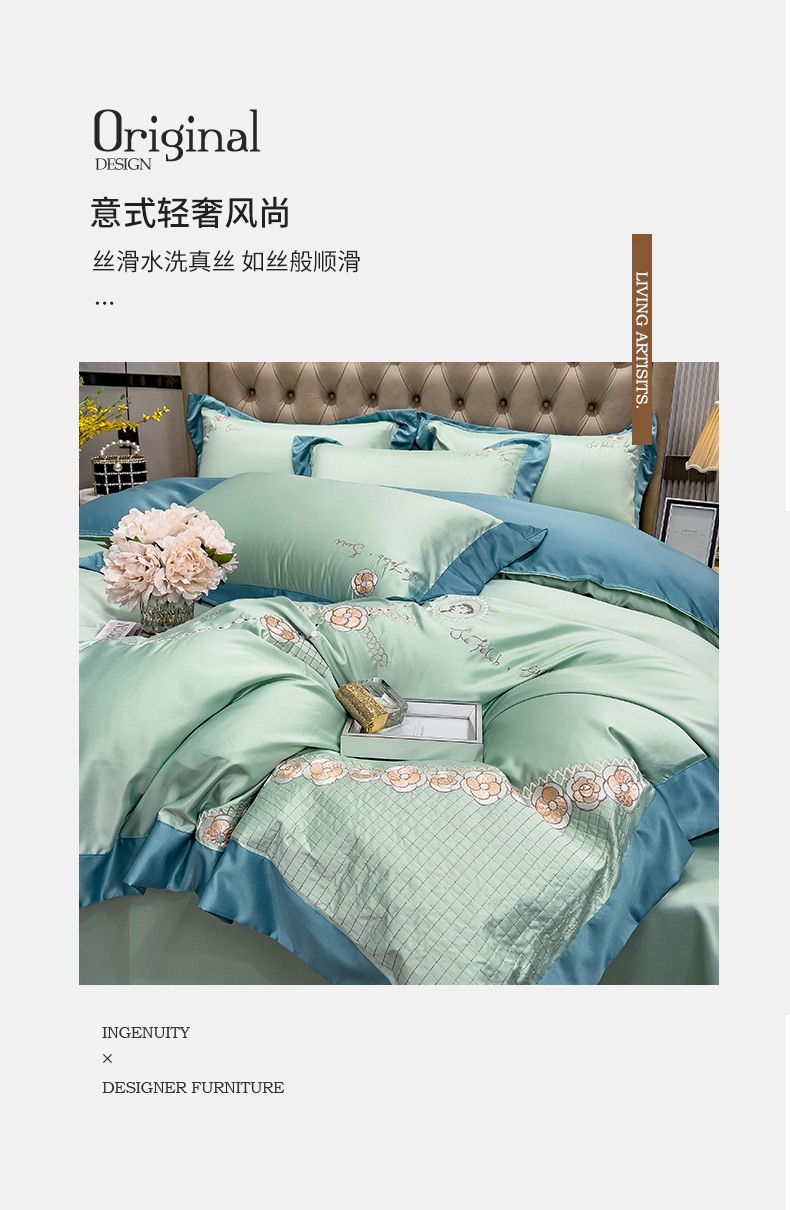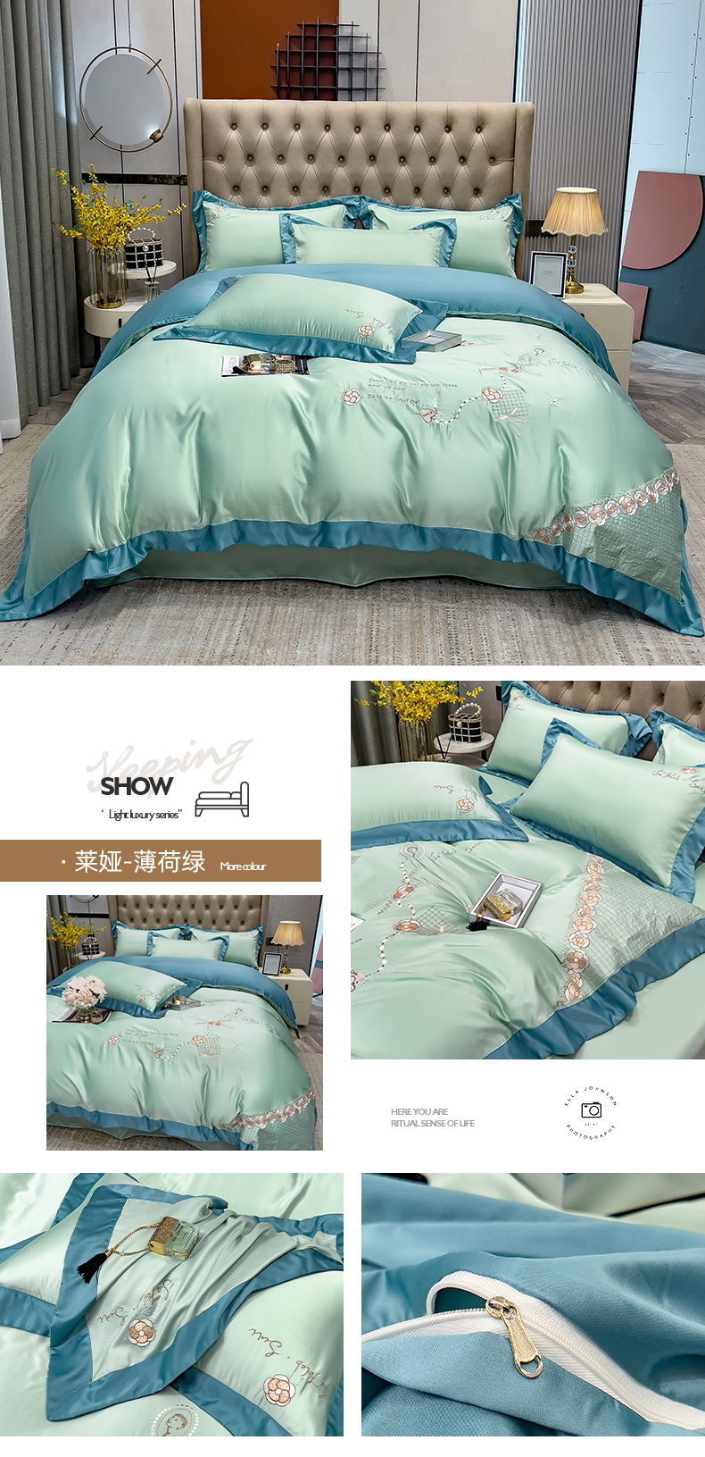 欧冠家纺 2024新款绣花水洗真丝四件套莱娅四件套 莱娅-薄荷绿