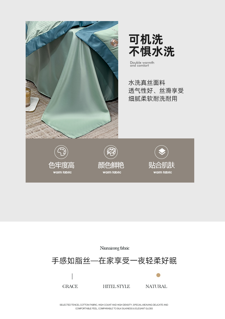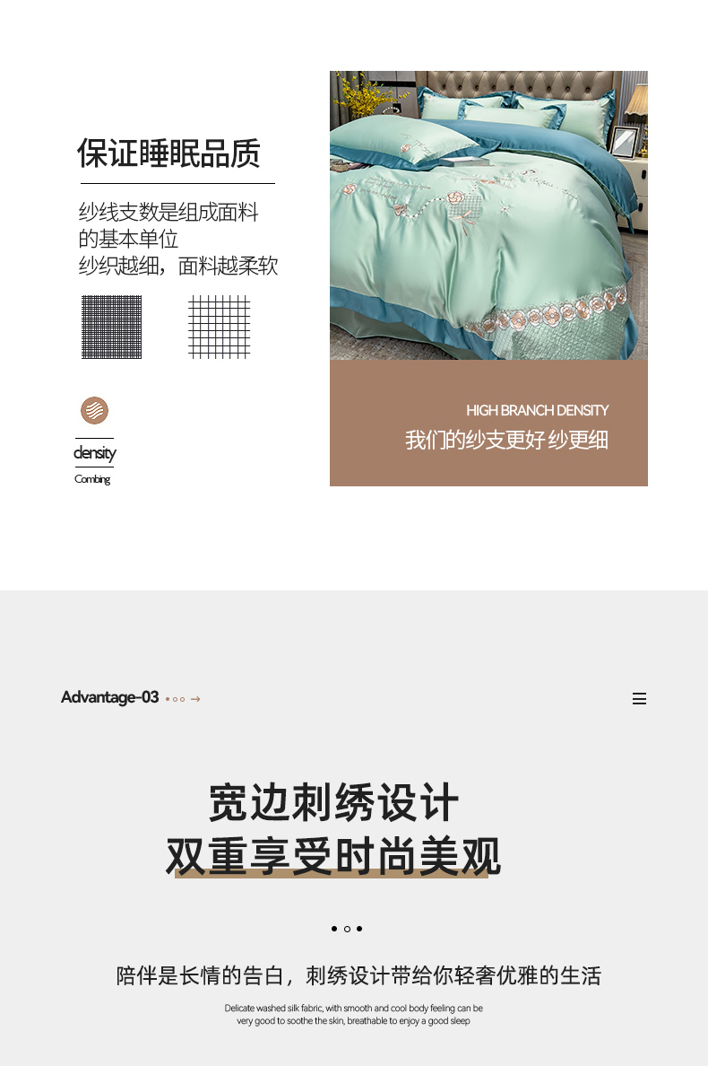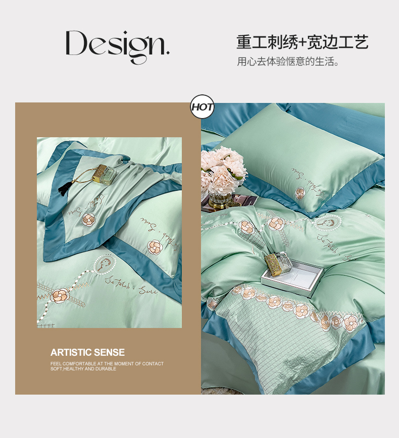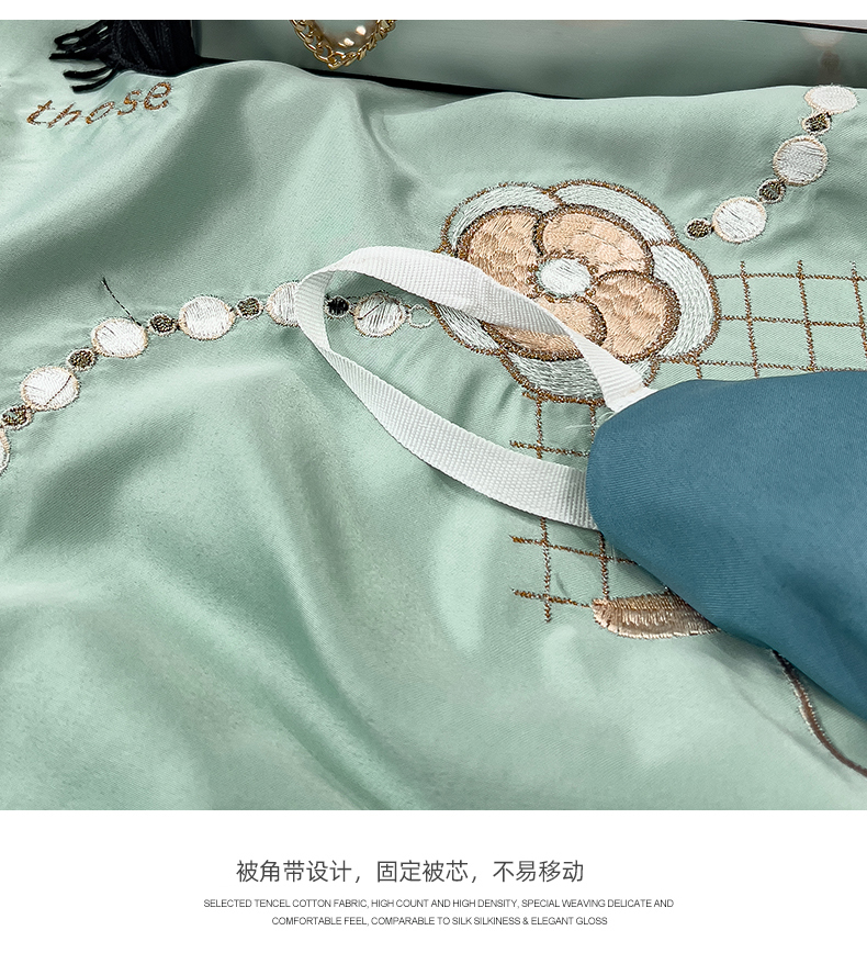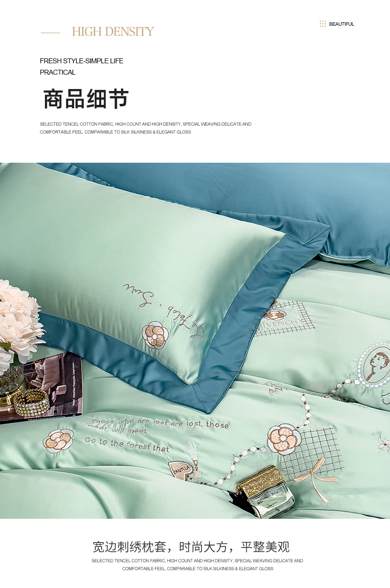欧冠家纺 2024新款绣花水洗真丝四件套莱娅四件套 莱娅-薄荷绿