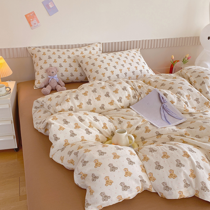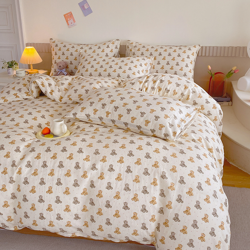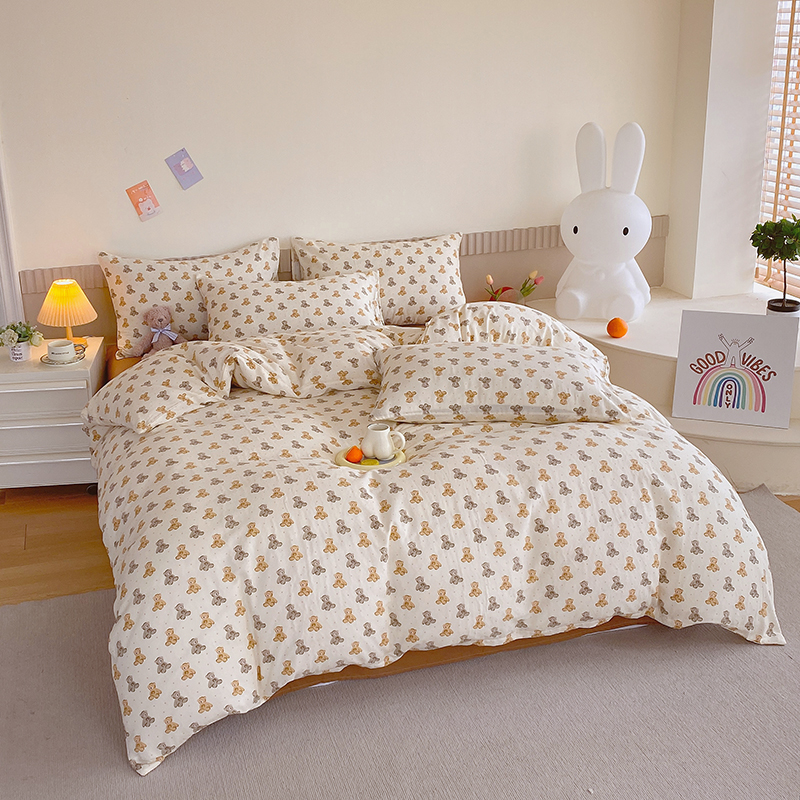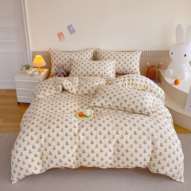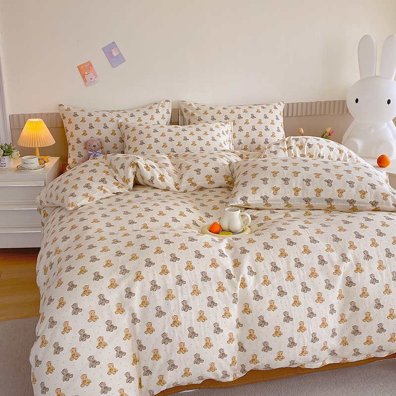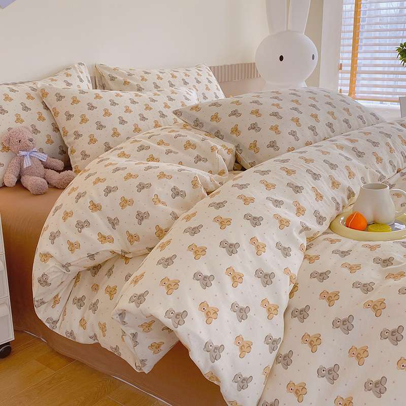 于果 2024新款全棉双层纱四件套 波点玩偶熊