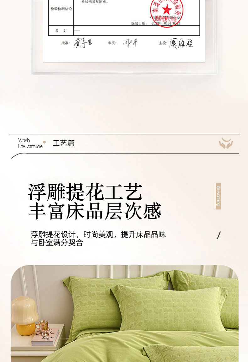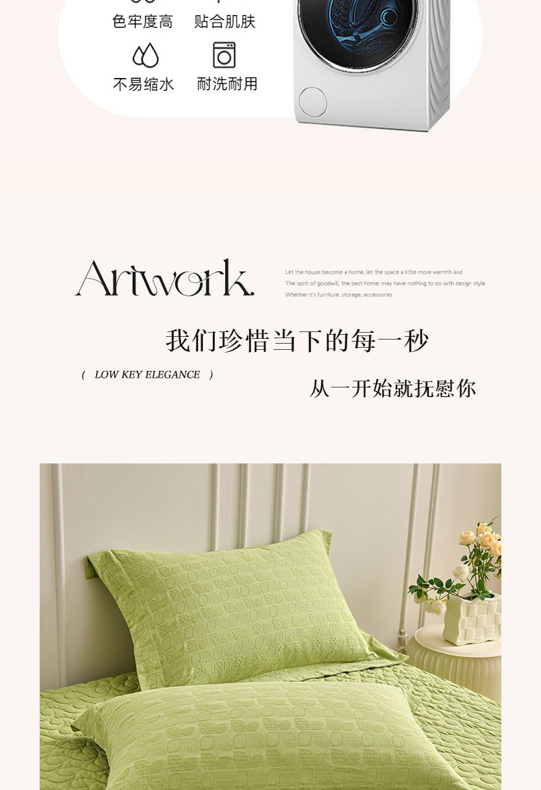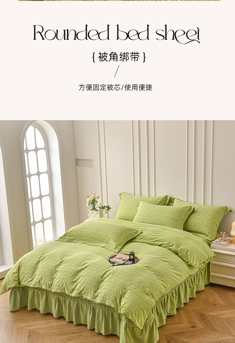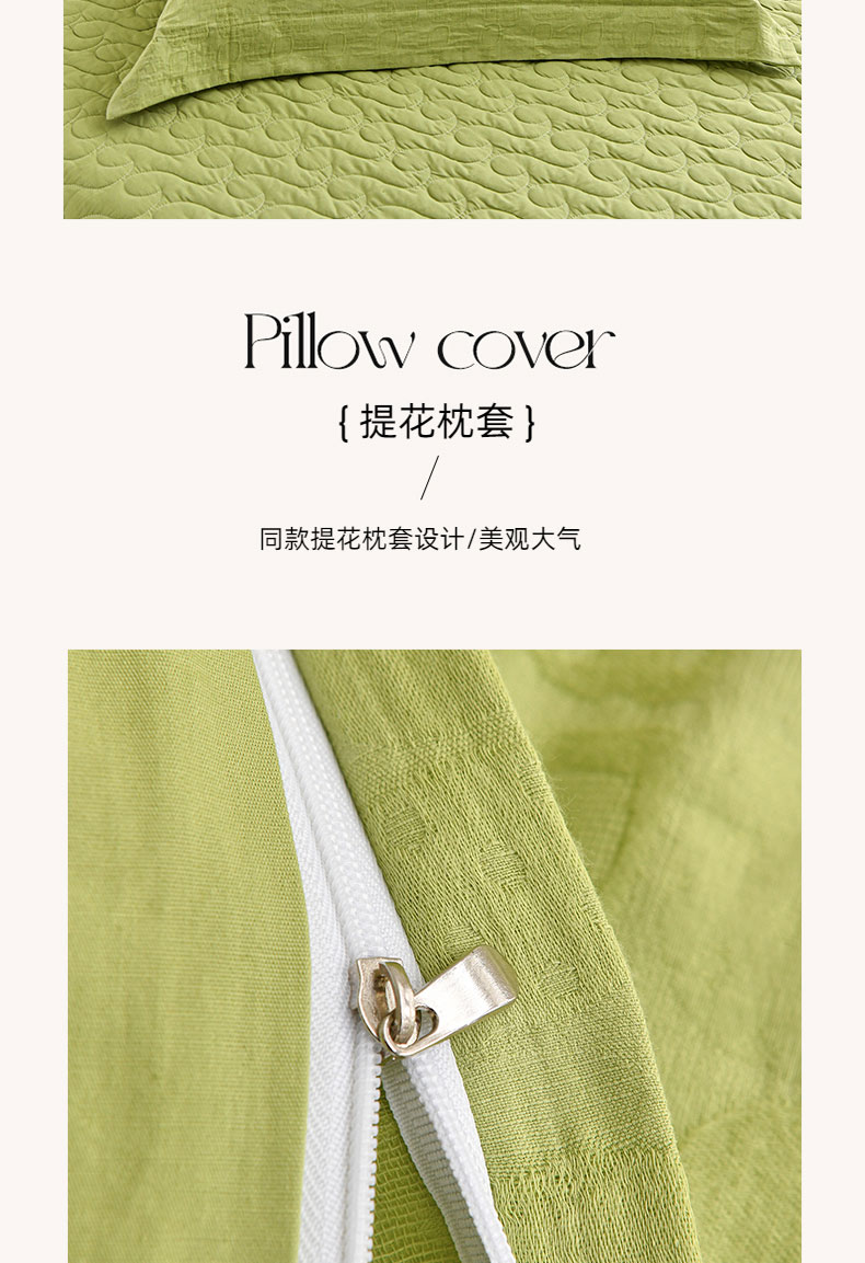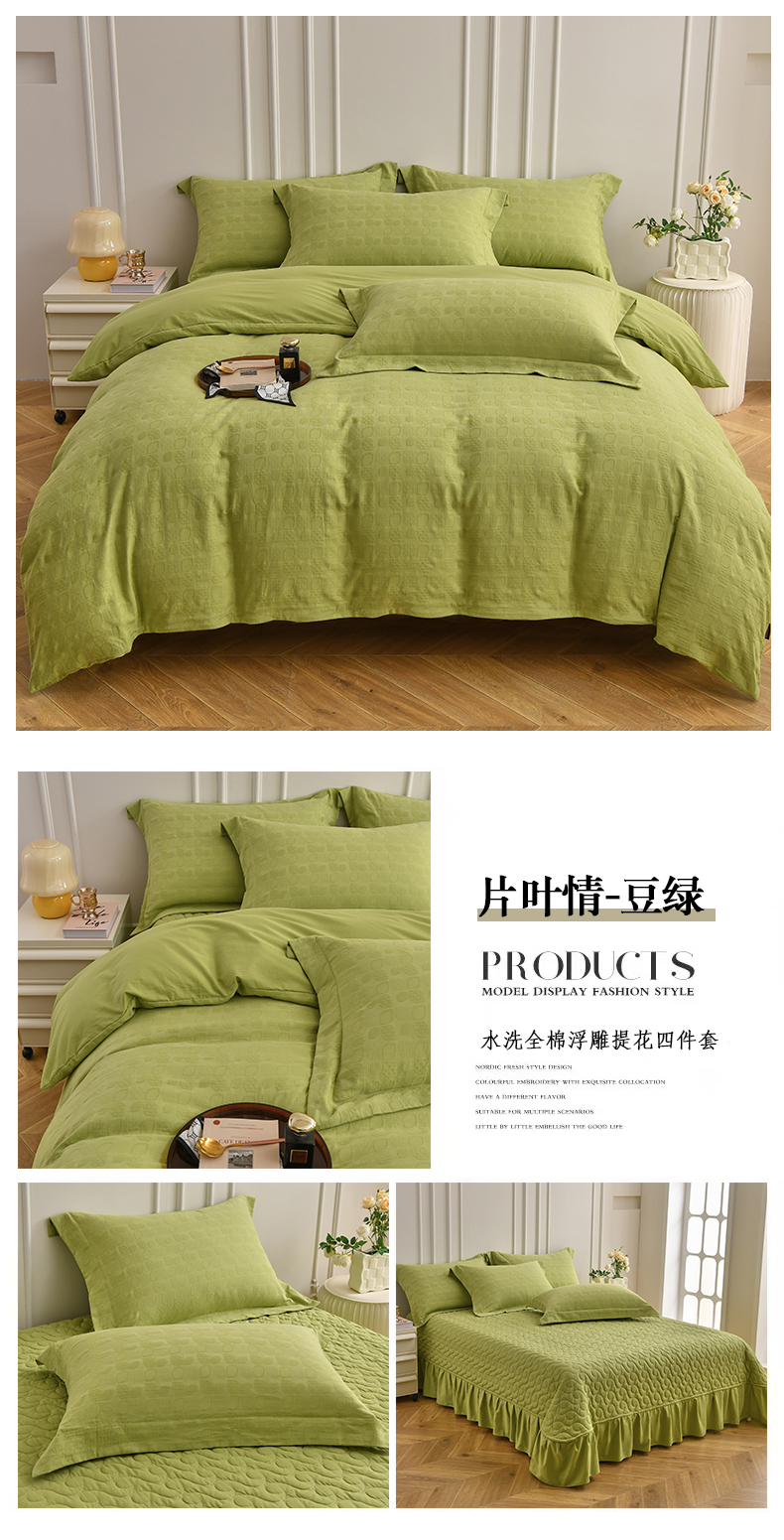 商品名称:金艾草 2024新款水洗全棉浮雕提花床盖四件套 片叶情-豆绿