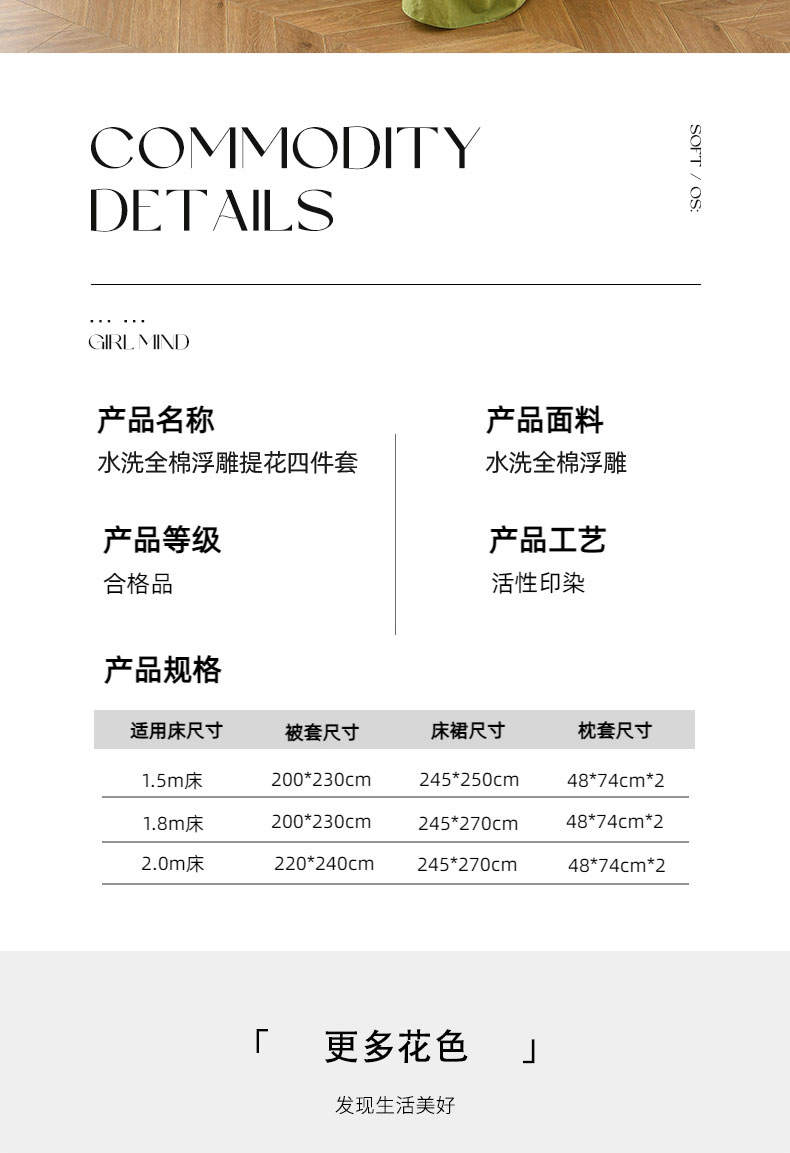 (总)金艾草 2024新款水洗全棉浮雕提花床盖四件套,圣罗纳-灰,片叶情-豆绿,罗曼-浅绿,蜀锦-茉莉白,轻颜-珊瑚粉