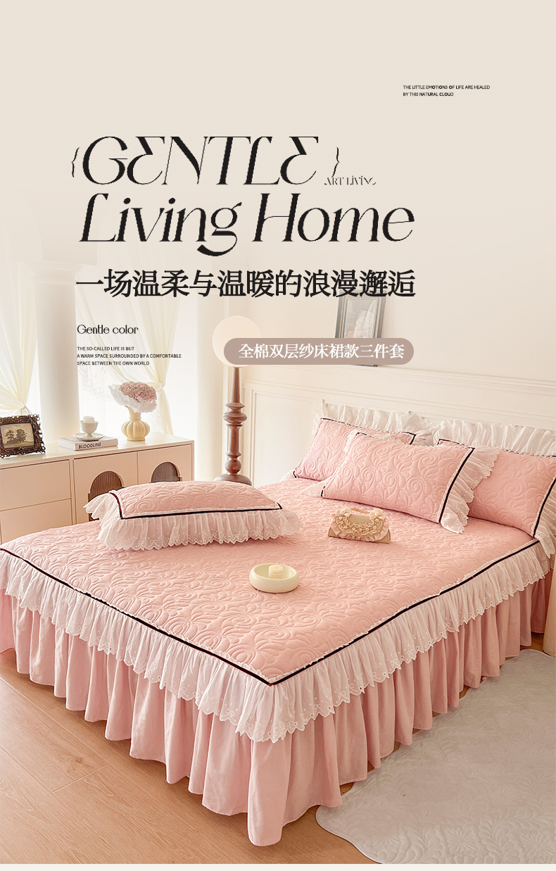 网红馆 2025新款全棉双层纱花边款爱丽丝系列单床裙 樱花粉
