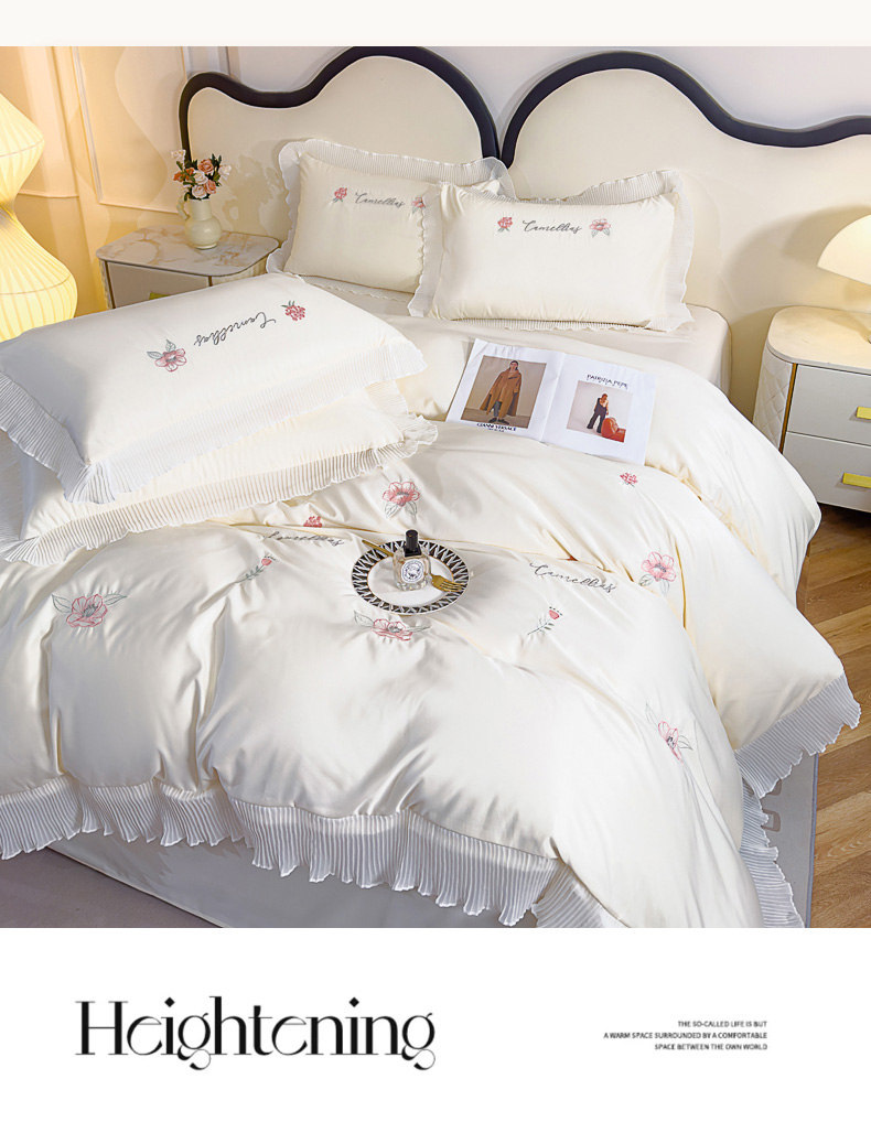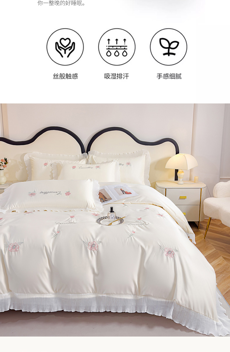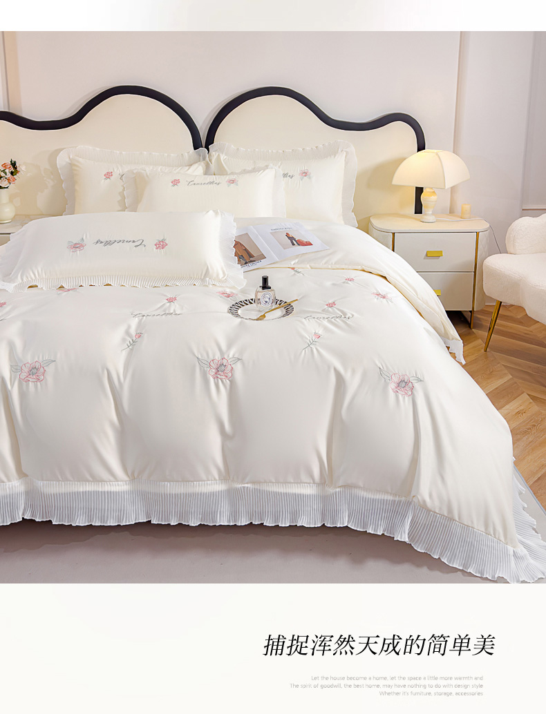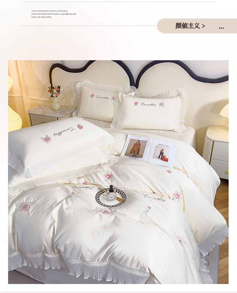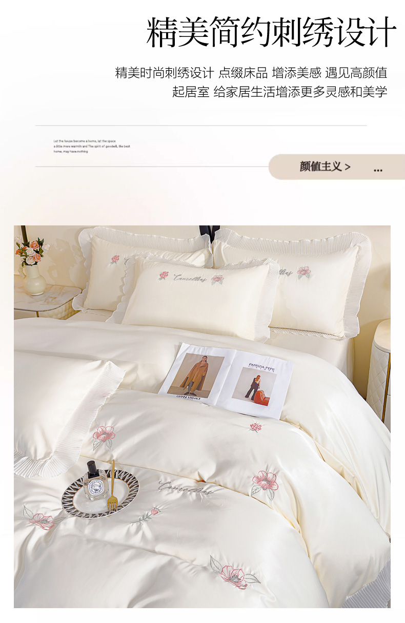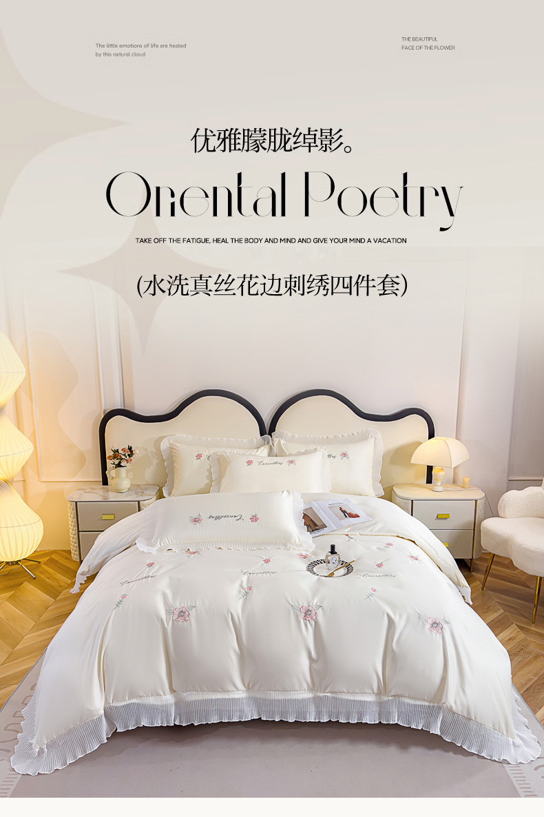 当前位置: 91家纺网 > 商品网购 > 床品套件 > 四件套 > 水洗棉四件套 > 菲儿家纺 2024新款水洗真丝花边刺绣四件套-花样年华系列 珍珠白