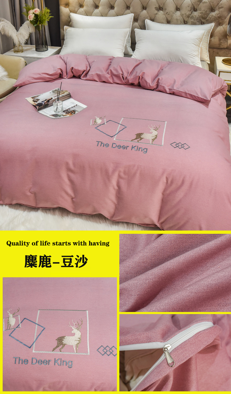 • 91家纺网 家纺一手货源 找家纺 艾迪尚家纺 2025新款纯色生态磨毛绣花单被套 麋鹿-豆沙
