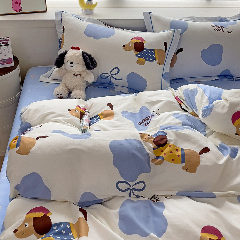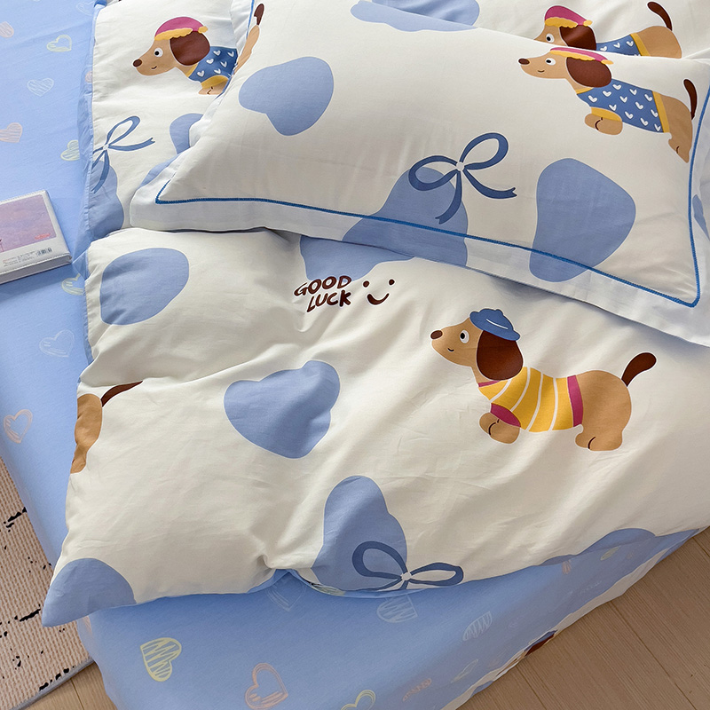 商品名称:乐童 2024新款直播爆款13070纯棉印花吊边款一字绣四件套-第七波 萌宠出动