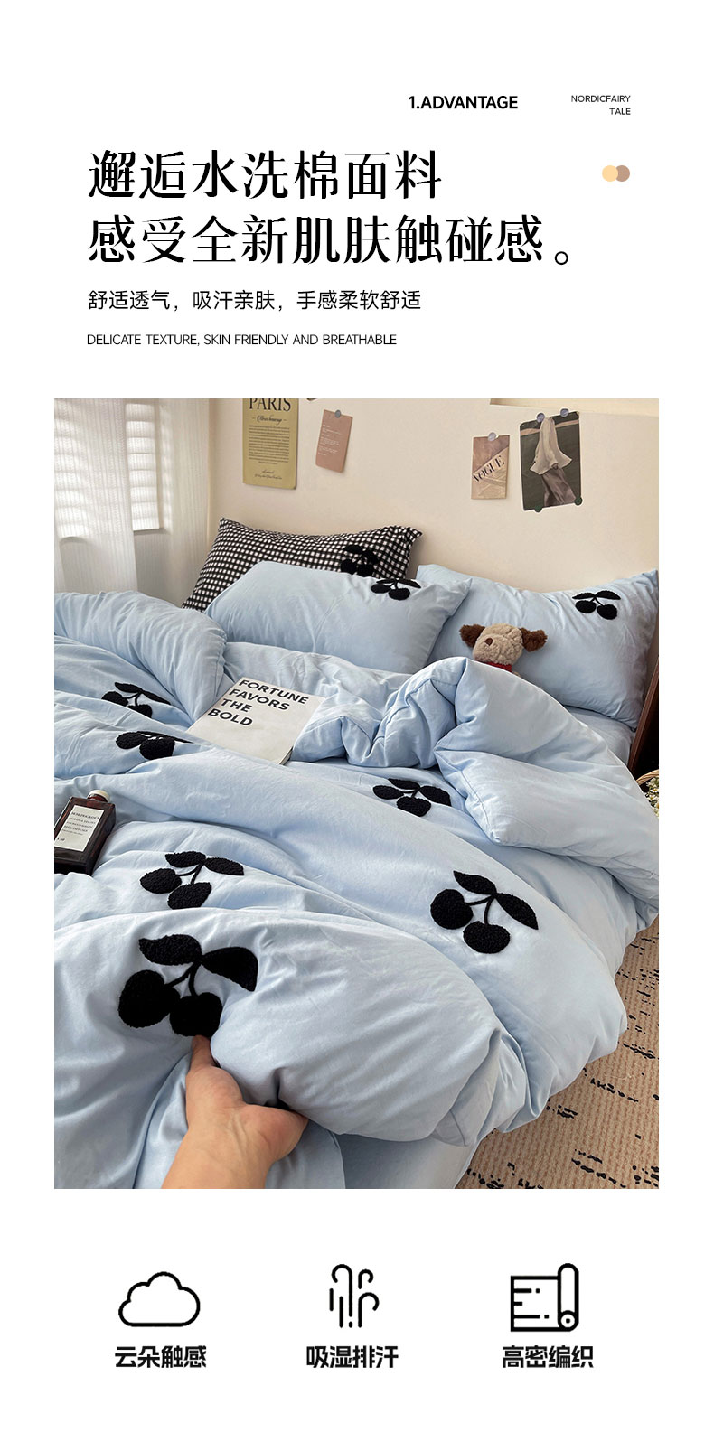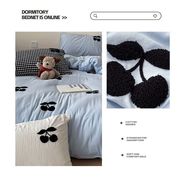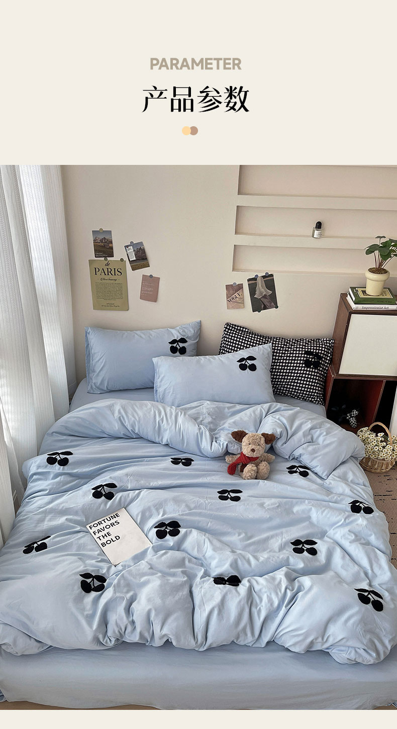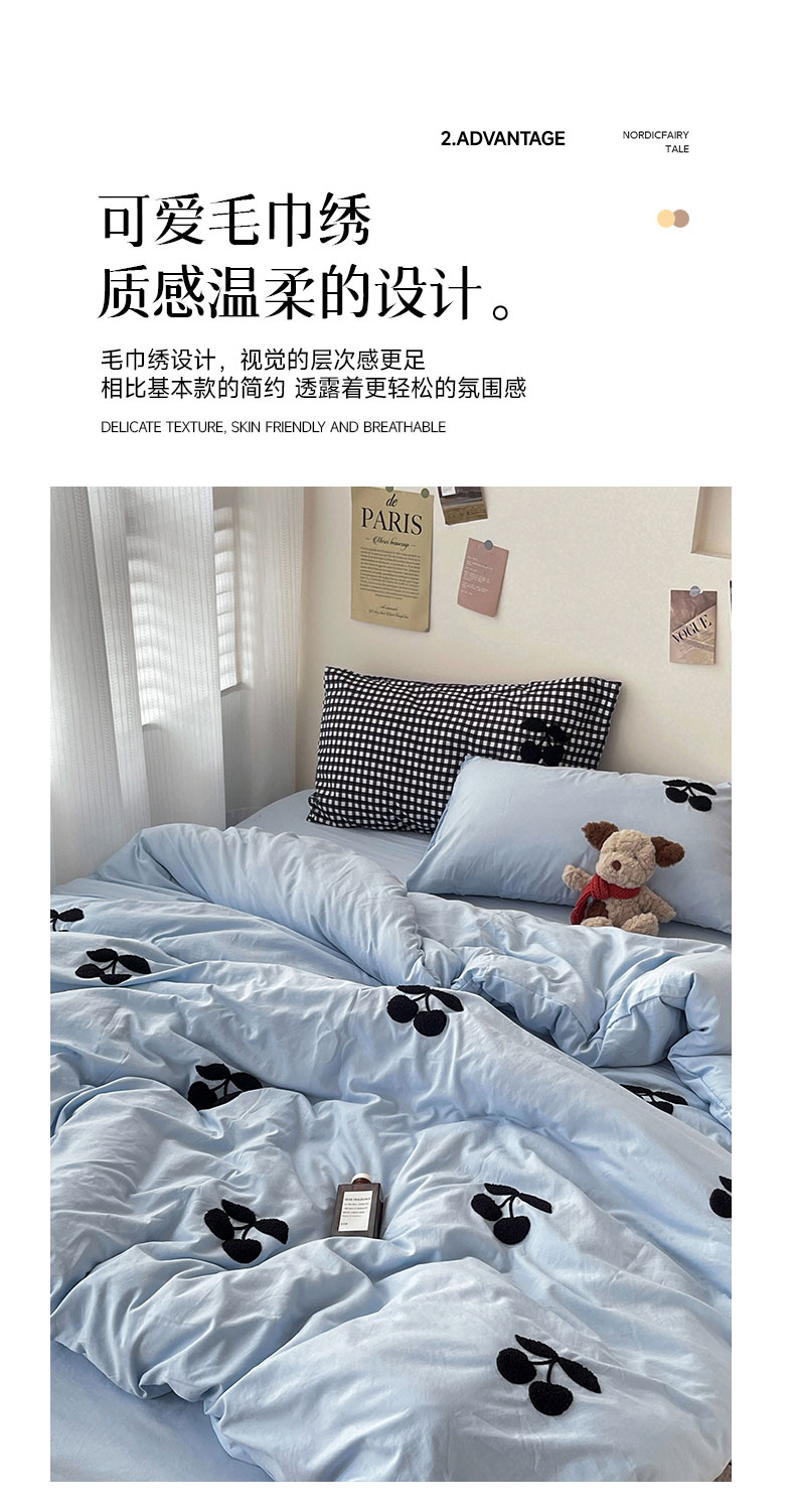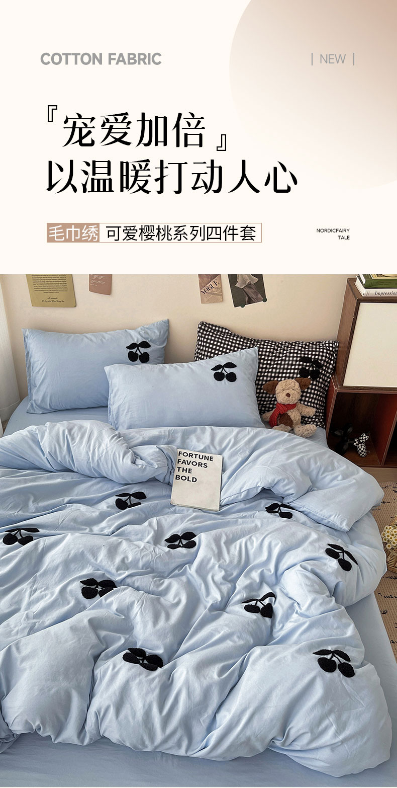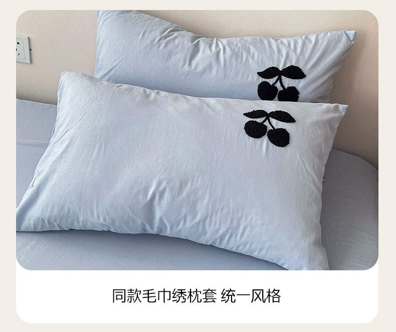 当前位置: 91家纺网 > 商品网购 > 床品套件 > 四件套 > 水洗棉四件套 > 尤米 2024新款可爱樱桃系列水洗棉毛巾绣四件套 樱桃-冰晶蓝