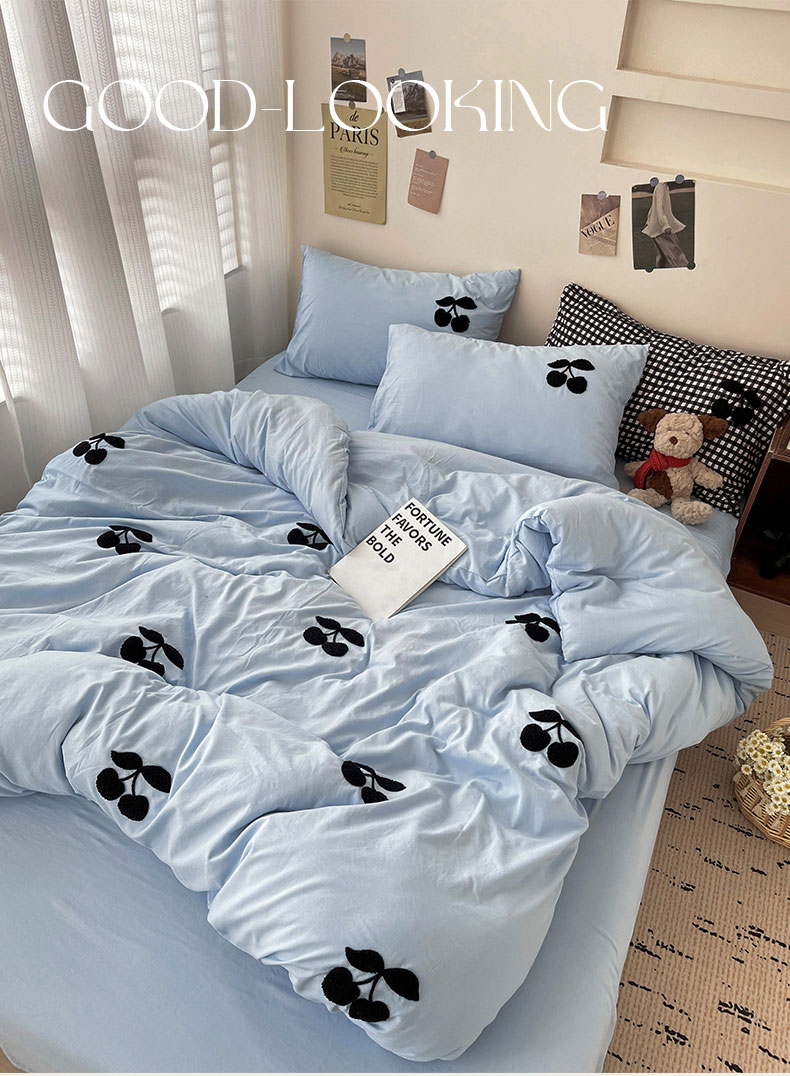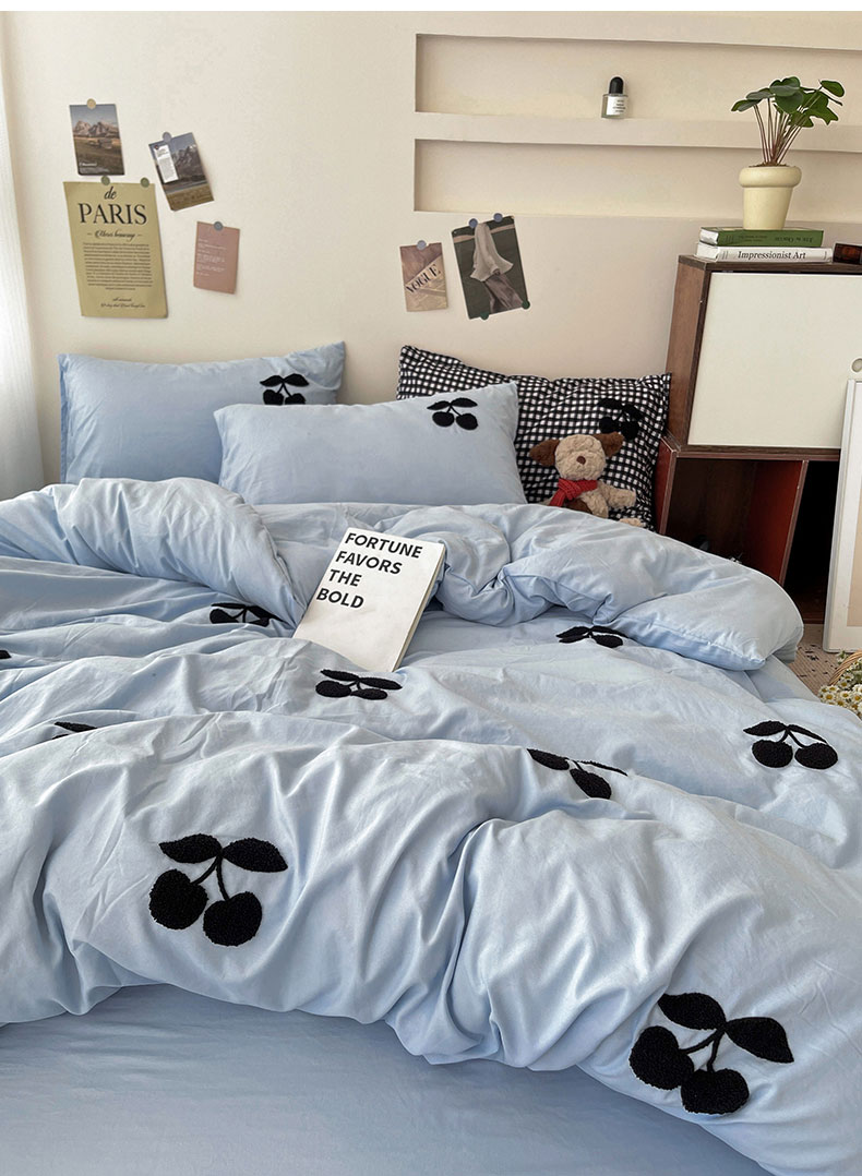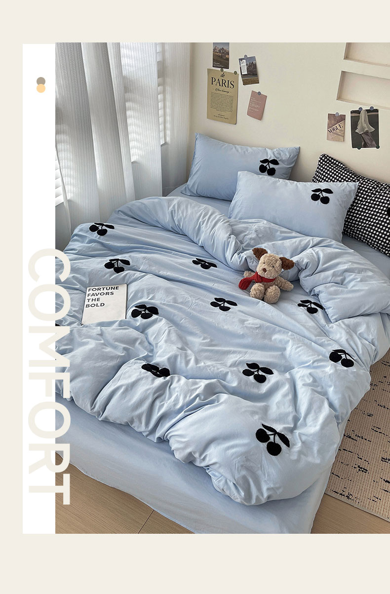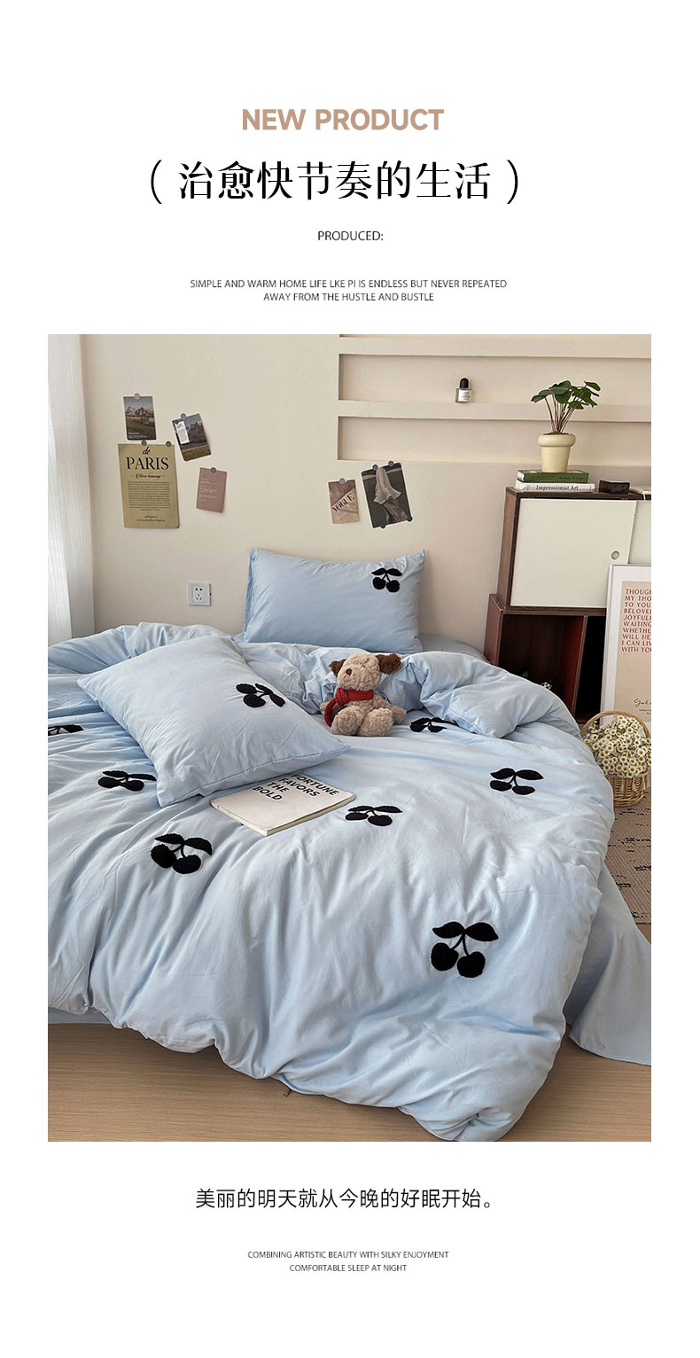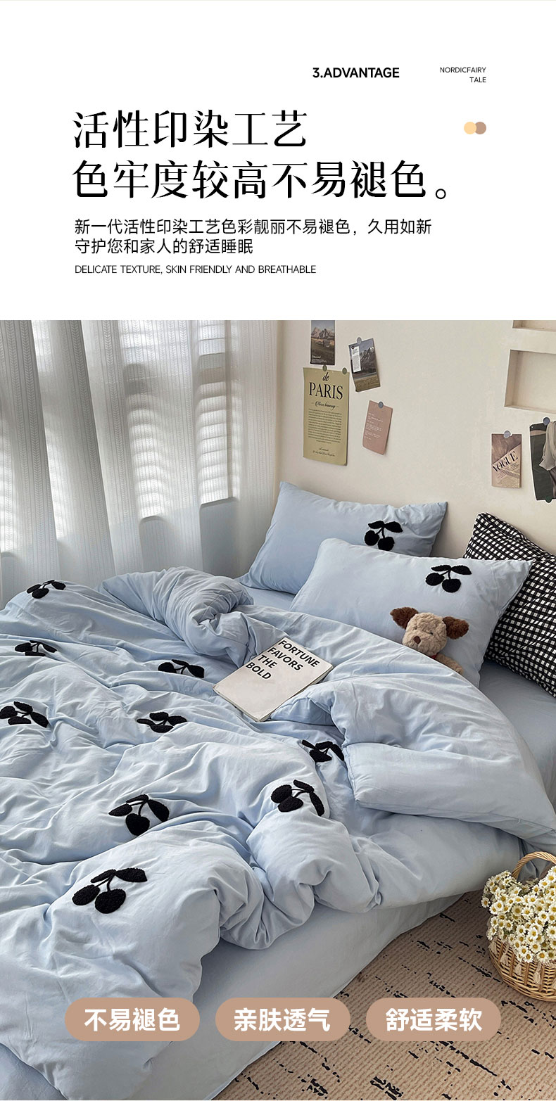 当前位置: 91家纺网 > 商品网购 > 床品套件 > 四件套 > 水洗棉四件套 > 尤米 2024新款可爱樱桃系列水洗棉毛巾绣四件套 樱桃-冰晶蓝
