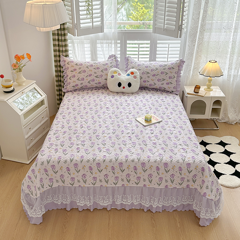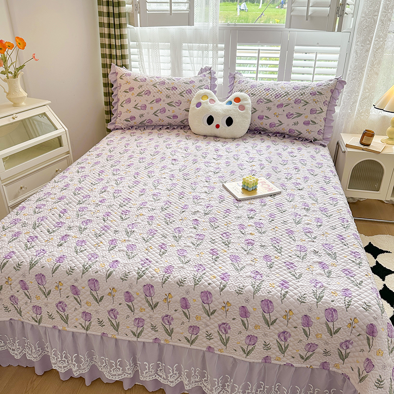 富瑞阁 2024新款A类水洗棉麻法式花边款床盖床盖款三件套 紫色郁金香