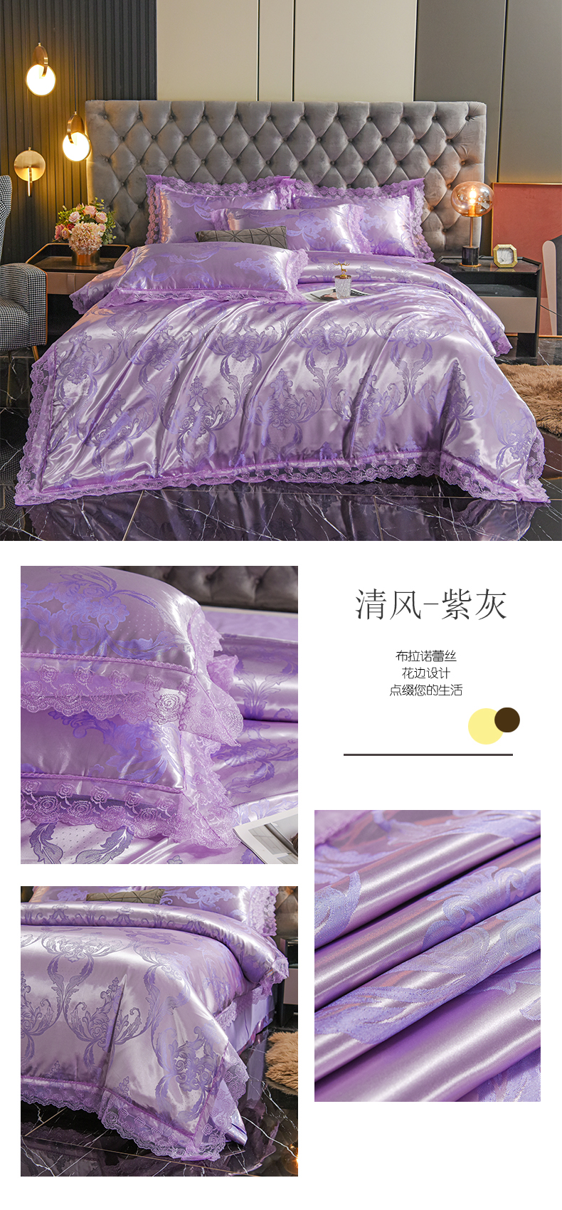 商品名称:提花大世界 2025新款布拉诺蕾丝提花莫代尔四件套 清风-紫灰