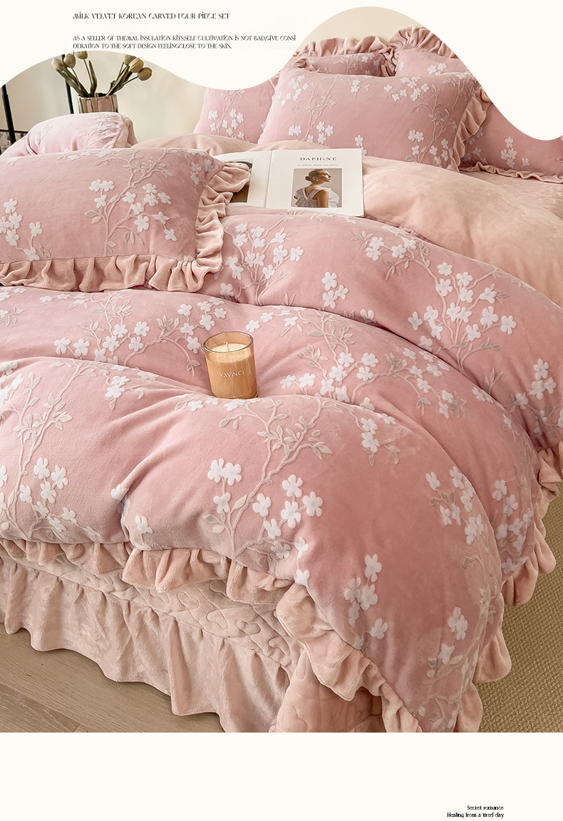 2024新品A类牛奶绒韩版雕花四件套 梨花海棠-豆沙
