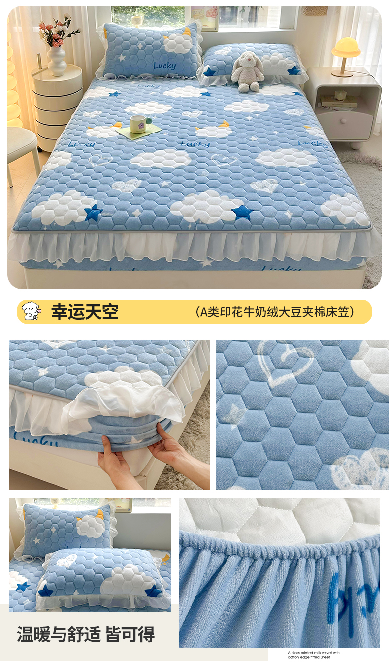 • 91家纺网 家纺一手货源 找家纺 伊人坊 2024冬季加厚牛奶绒花边夹棉床笠三件套纯色印花花边款床垫保护套 幸运天空