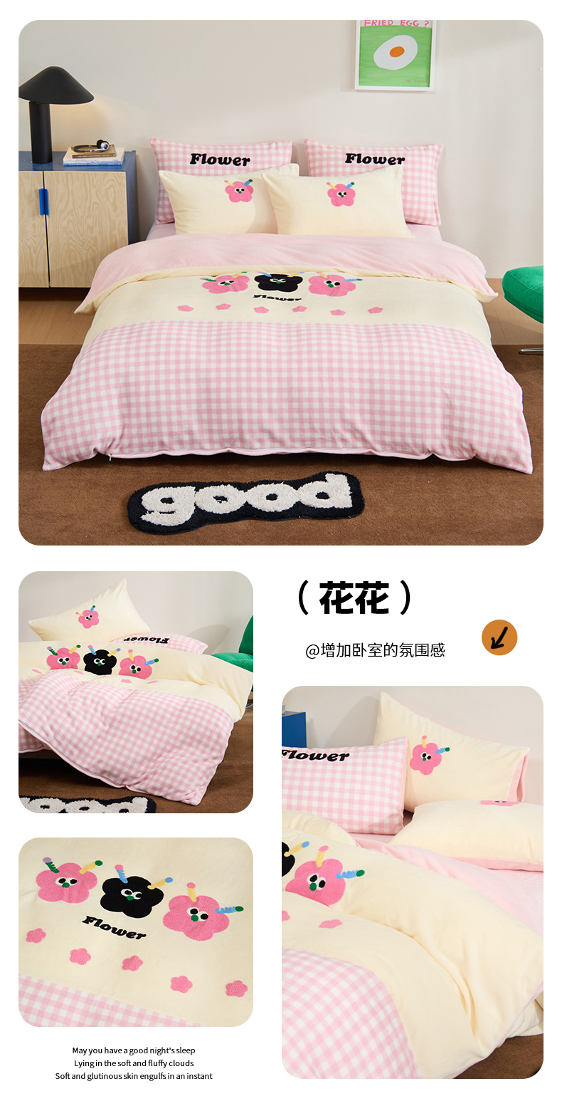 商品名称:呗旺鹿 2024新款高克重小清新拼接款毛巾绣牛奶绒四件套原创 花花