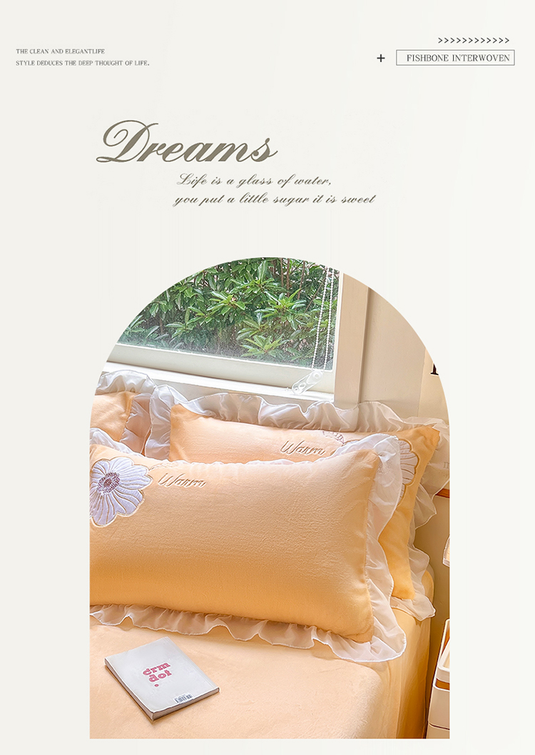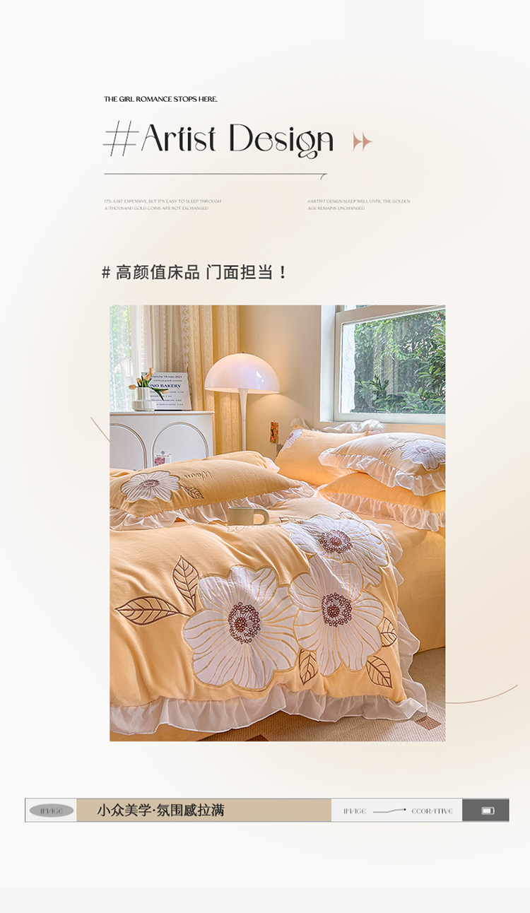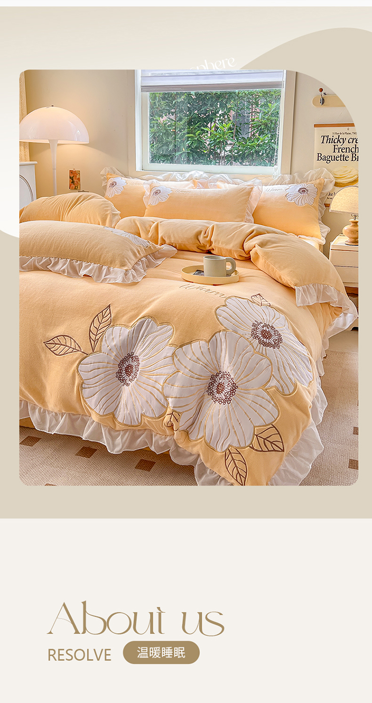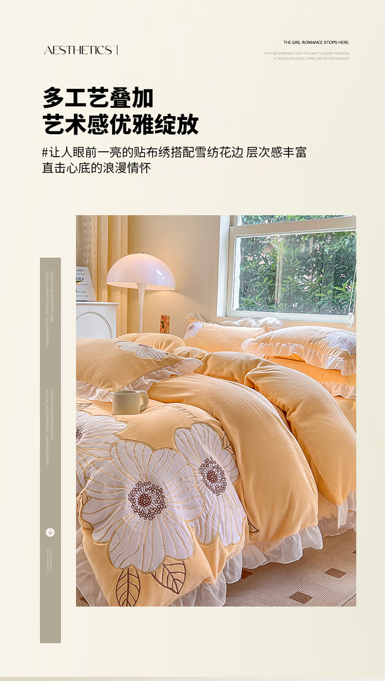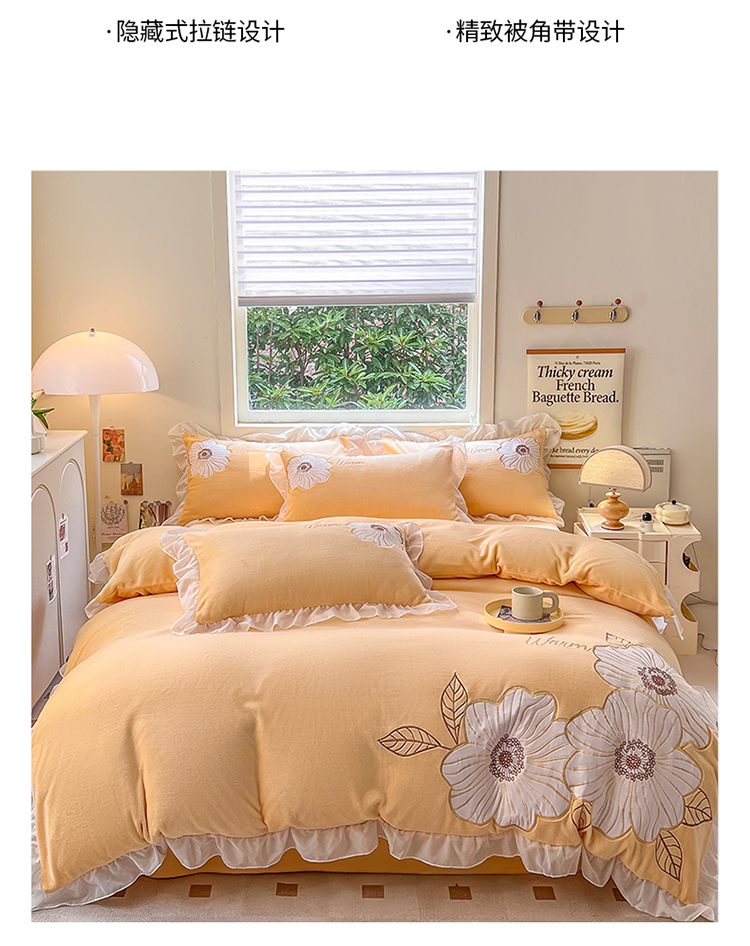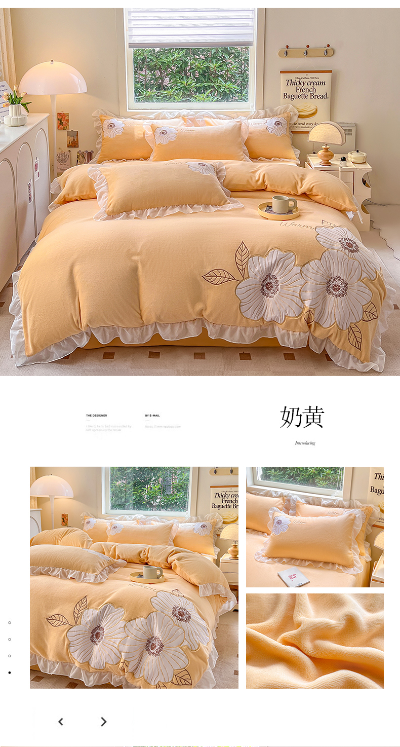 商品名称:2024新款亲肤舒适牛奶绒重工艺四件套木子专版 半亩花田秋香黄