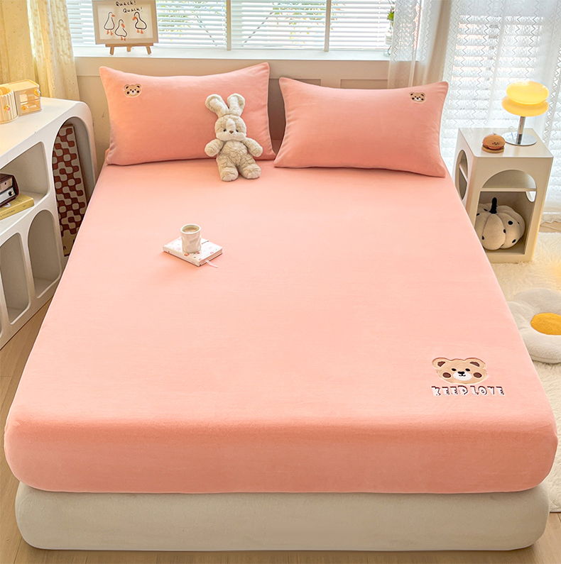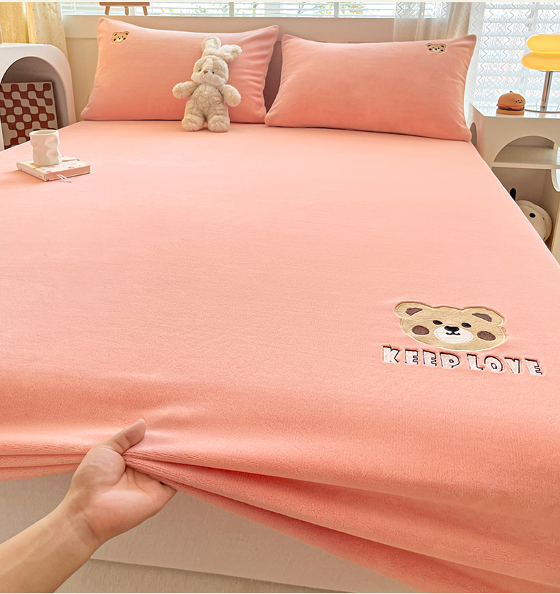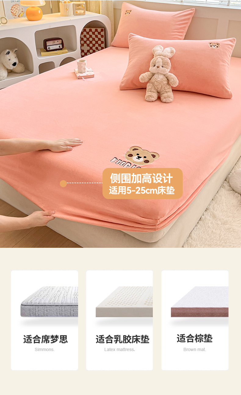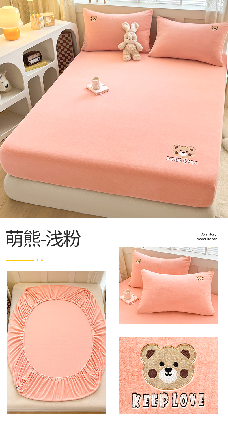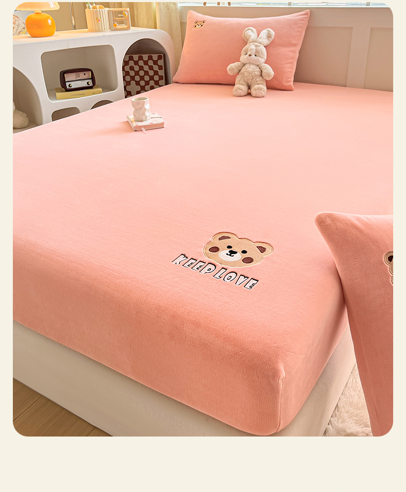 笙意家纺 2025新款牛奶绒卡通单品刺绣床笠 萌熊-浅粉