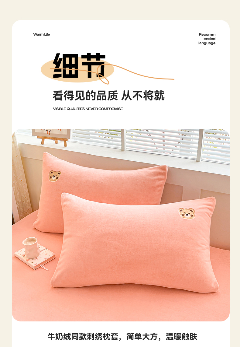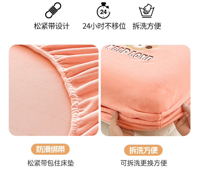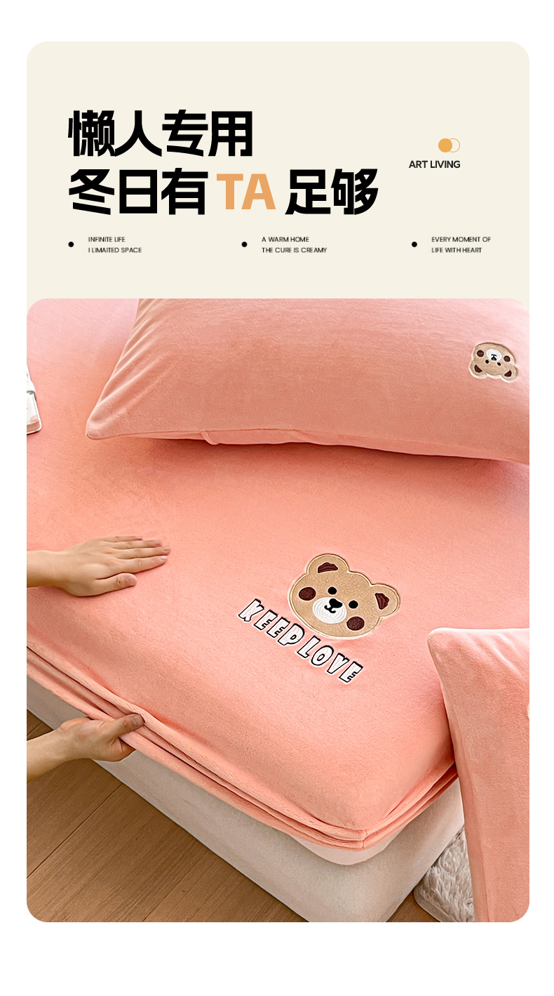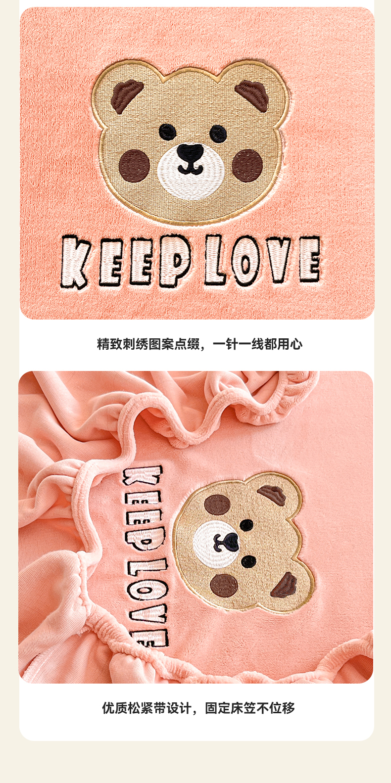 笙意家纺 2025新款牛奶绒卡通单品刺绣床笠 萌熊-浅粉