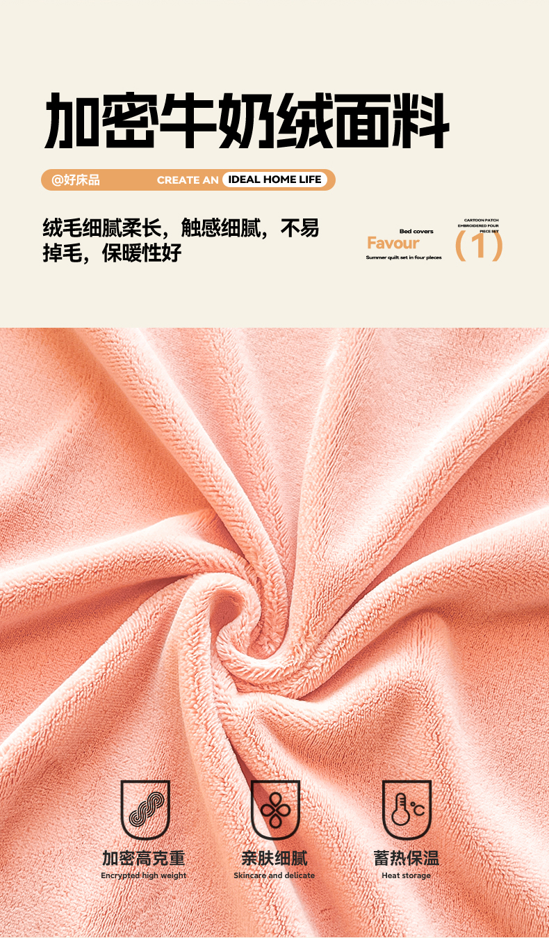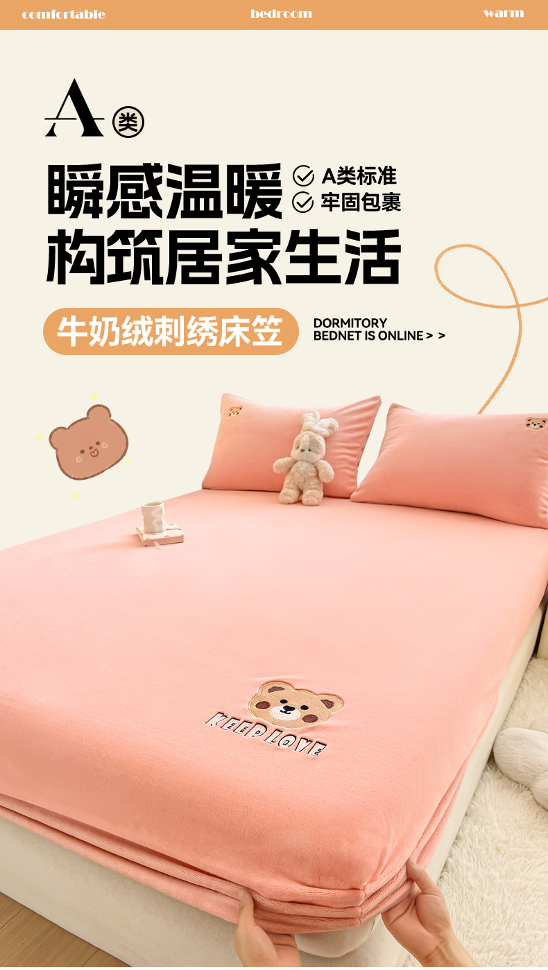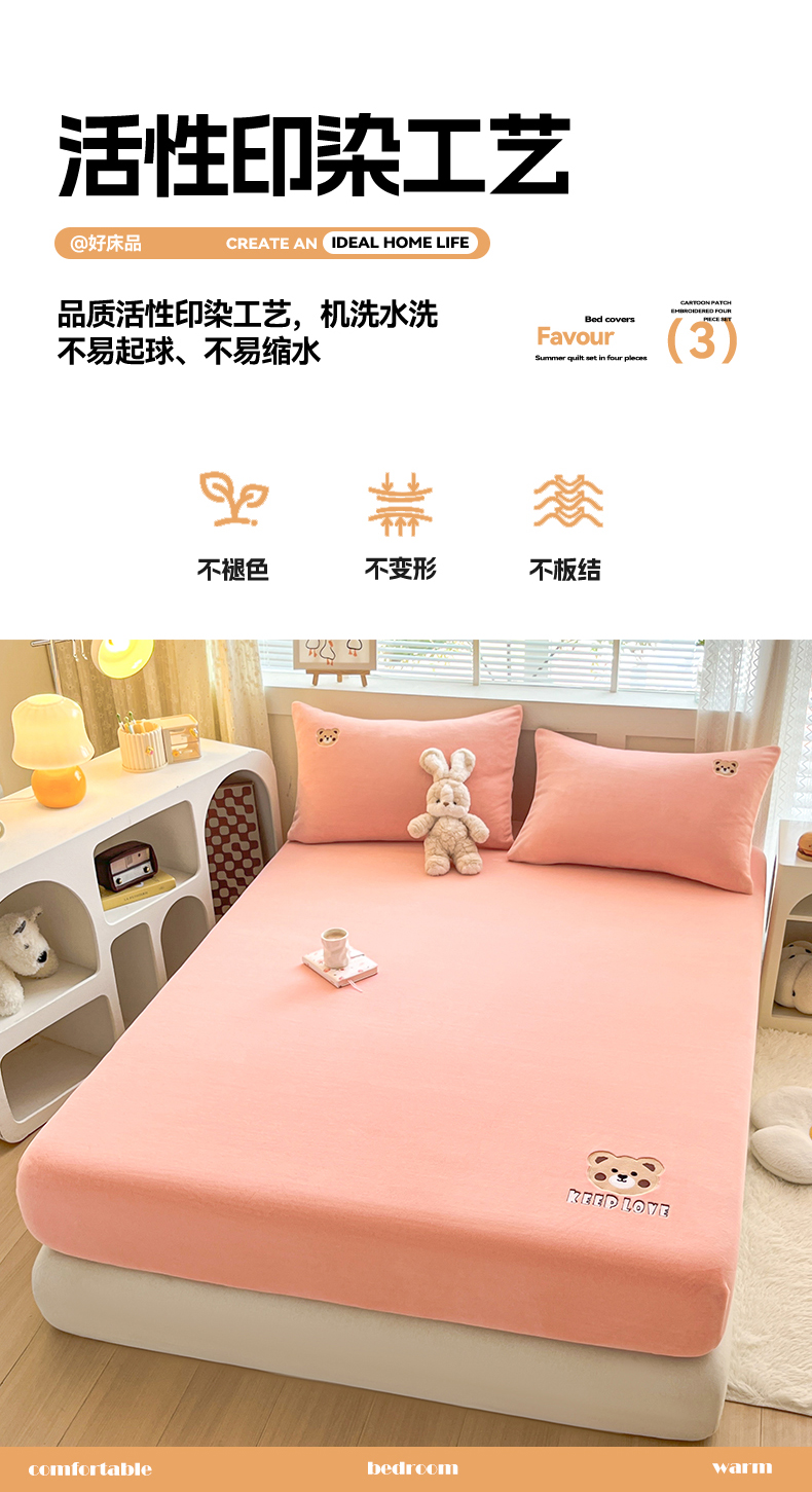 • 91家纺网 家纺一手货源 找家纺 笙意家纺 2025新款牛奶绒卡通单品刺绣床笠 萌熊-浅粉